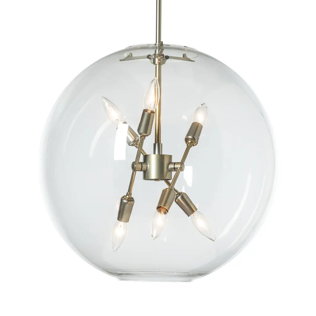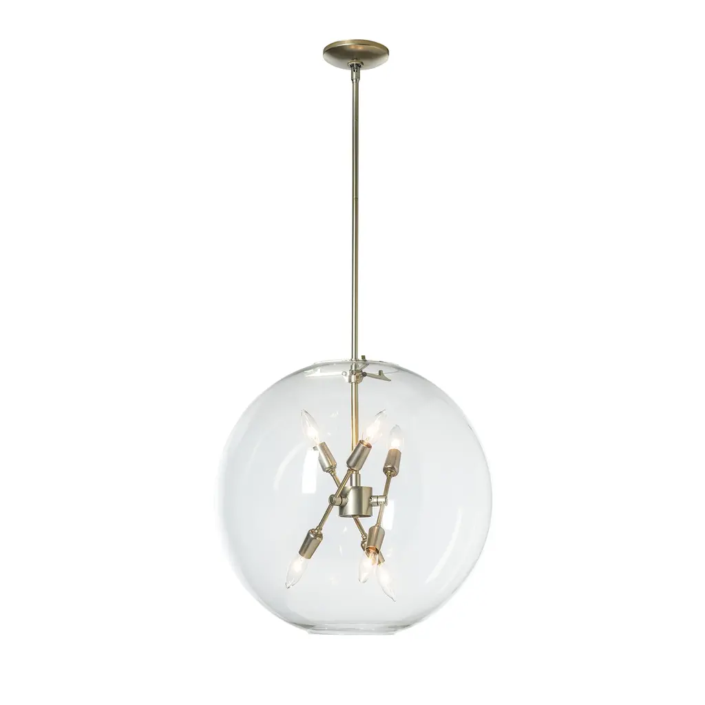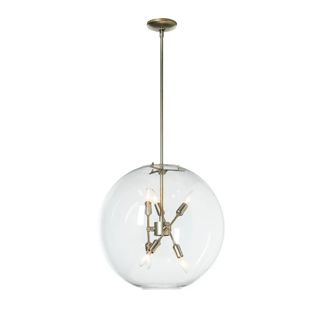 Bringing to mind memories from warm summer nights, Hubbardton Forge's Sfera 6-Light Pendant recaptures the magic of catching fireflies once the sun goes down. The twinkling light cast from its small lightbulbs are reminiscent of the soft glow of these summertime night fliers caught in a glass jar. A clear glass orb surrounding the six bulbs within completes the nostalgic vibes. Simple in tailoring, this pendant emits unlimited sentimentality. Shown in modern brass finish with clear glass