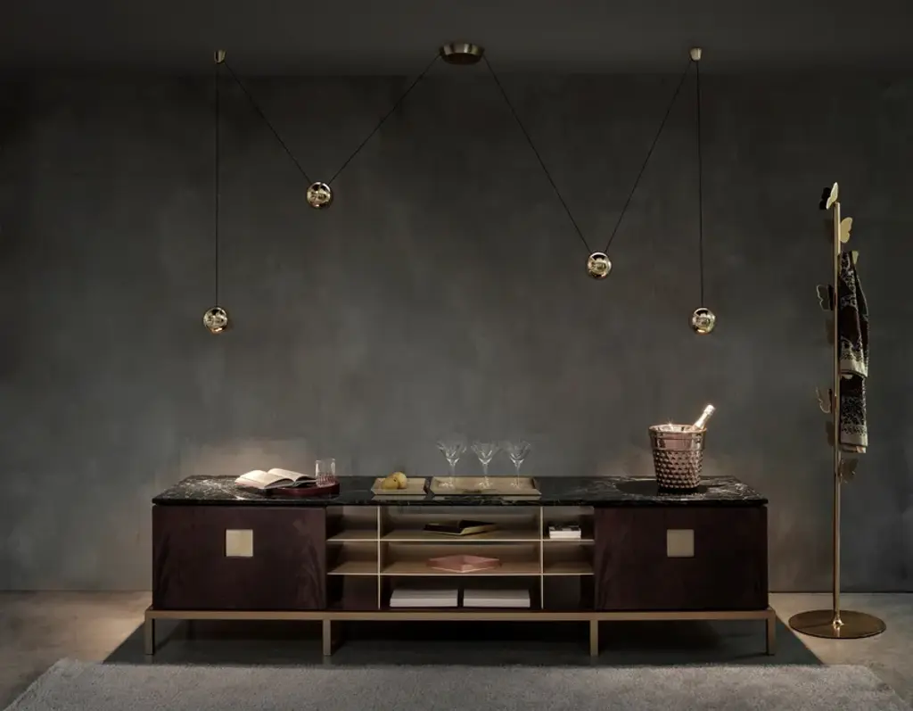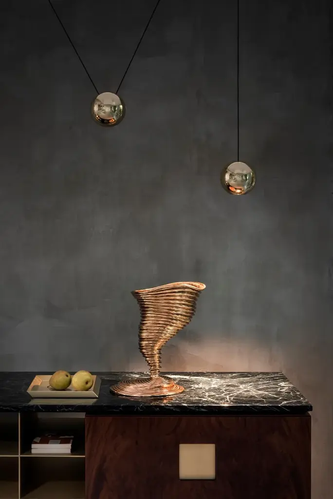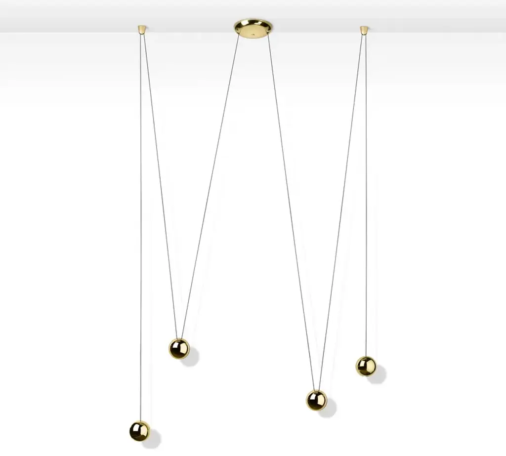 A pendant lamp with a free interpretation of space, where four brass spheres, archetypal and elementary forms, can achieve various configurations, in a balance of counterweights where the wirings are exposed, and the light that comes with a little mystery from the various spheres expands or concentrate depending on the positioning of the individual sources.