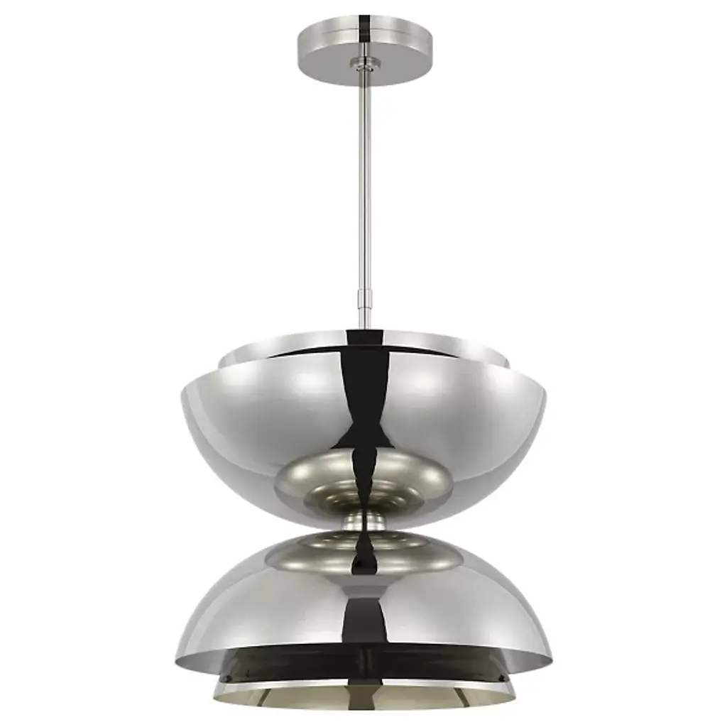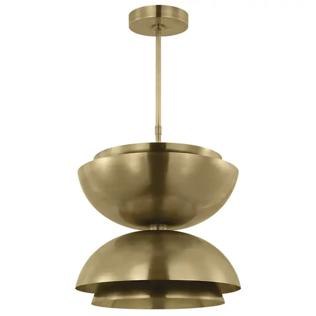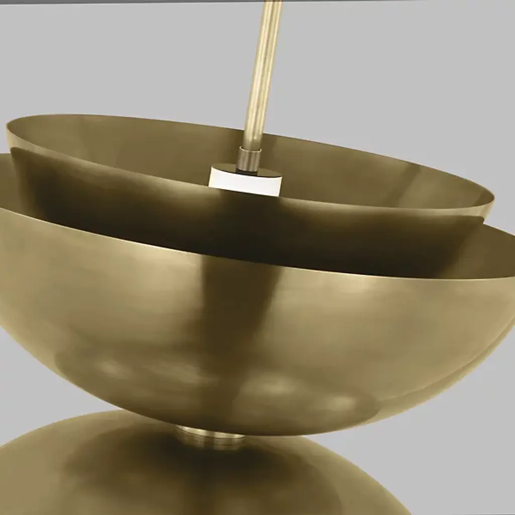 The Shanti LED Double Pendant from Visual Comfort Modern is designed by Sean Lavin. This double pendant is a statement-making piece that will set the for your living space. Hanging from the end of a simple stem is a set of large, spun metal-shaped shades. Multi-directional bulbs glaze the structure while creating a warm, radiant glow. Integrated LED modules bring the metal to life as they emit a bright and even layer of light through the top and bottom of the piece.