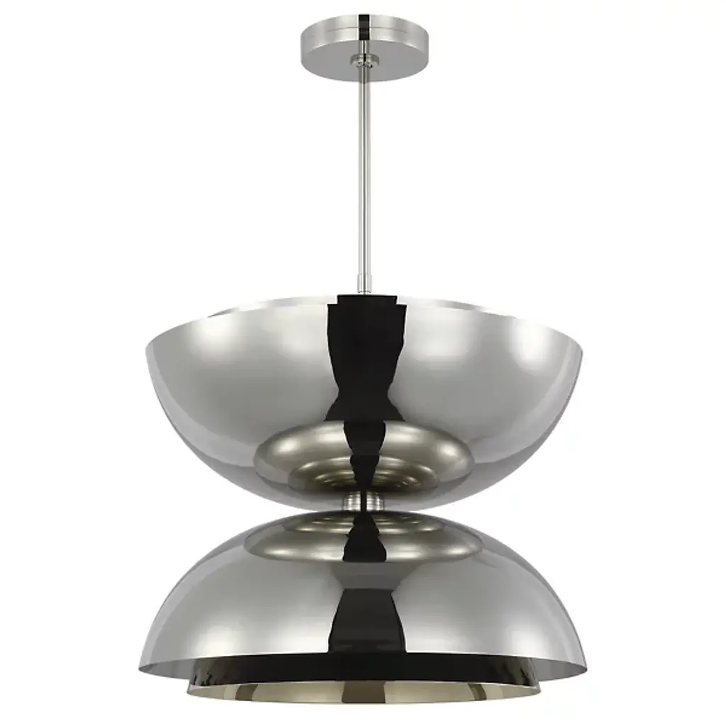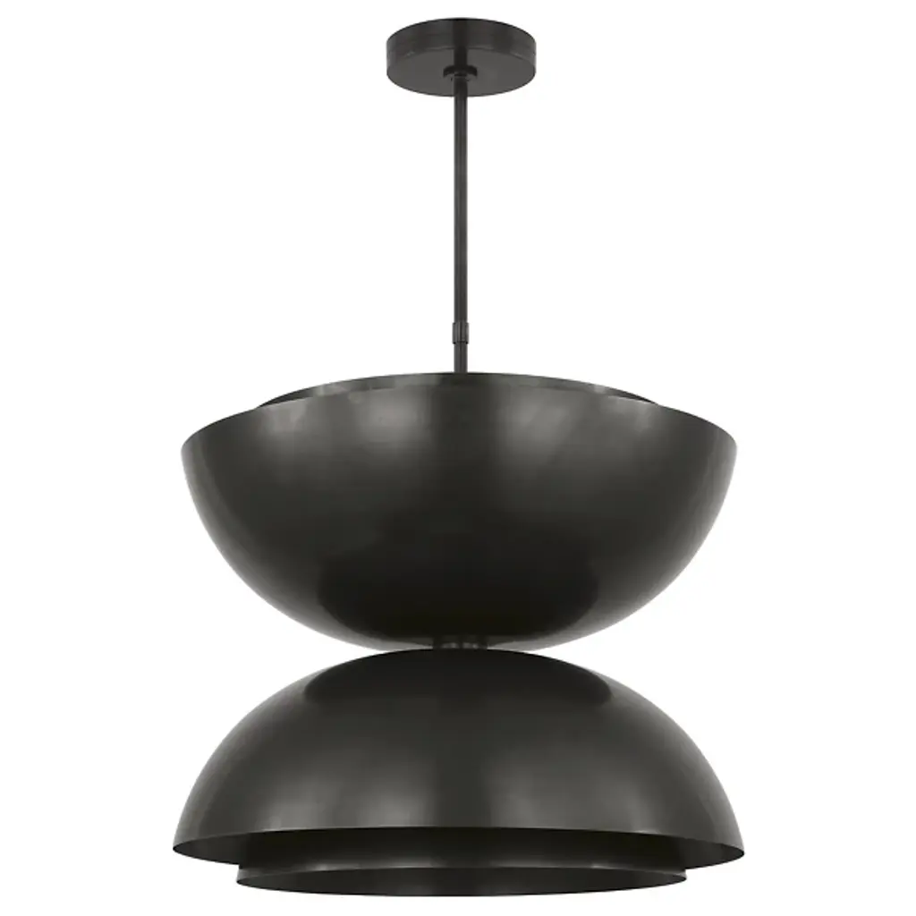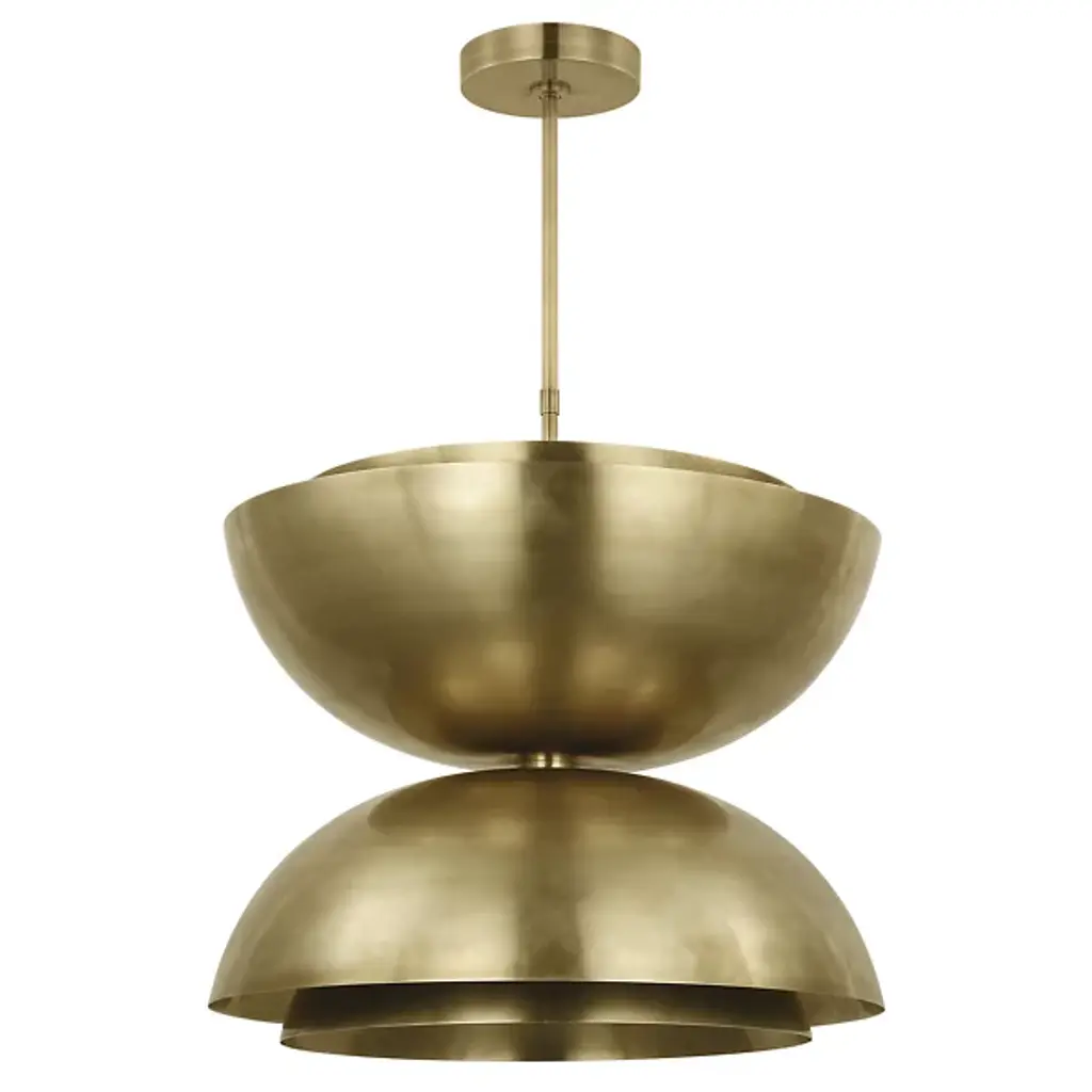 The Shanti LED Double Pendant from Visual Comfort Modern is designed by Sean Lavin. This double pendant is a statement-making piece that will set the for your living space. Hanging from the end of a simple stem is a set of large, spun metal-shaped shades. Multi-directional bulbs glaze the structure while creating a warm, radiant glow. Integrated LED modules bring the metal to life as they emit a bright and even layer of light through the top and bottom of the piece.