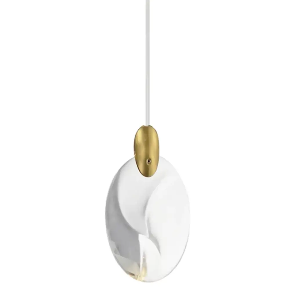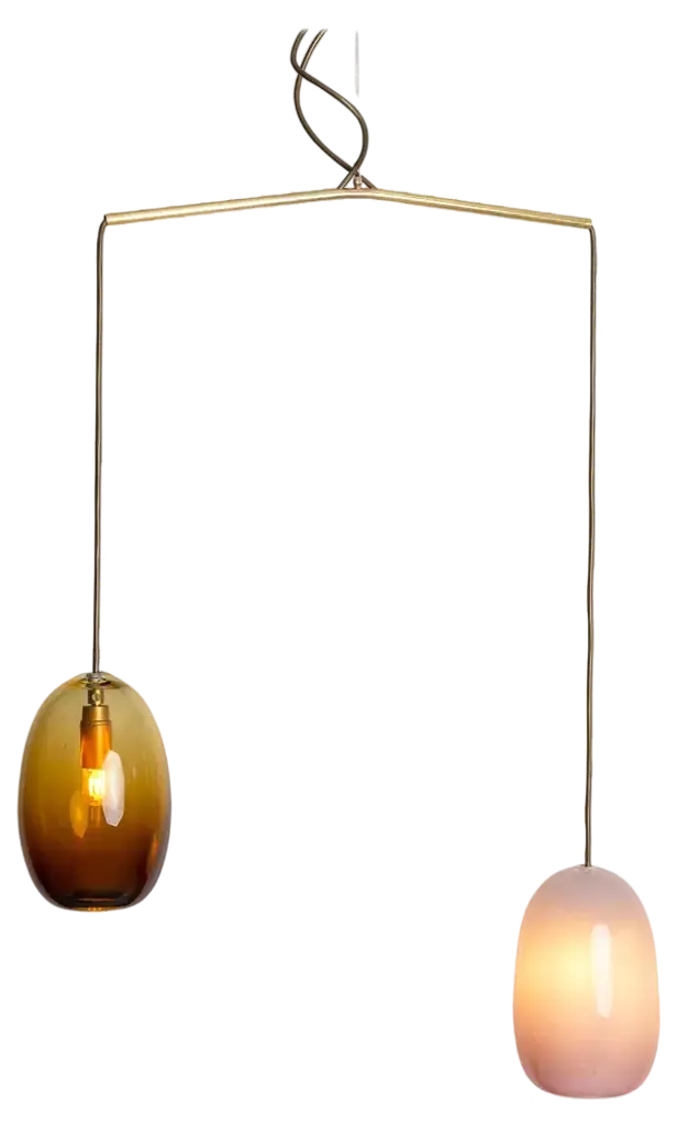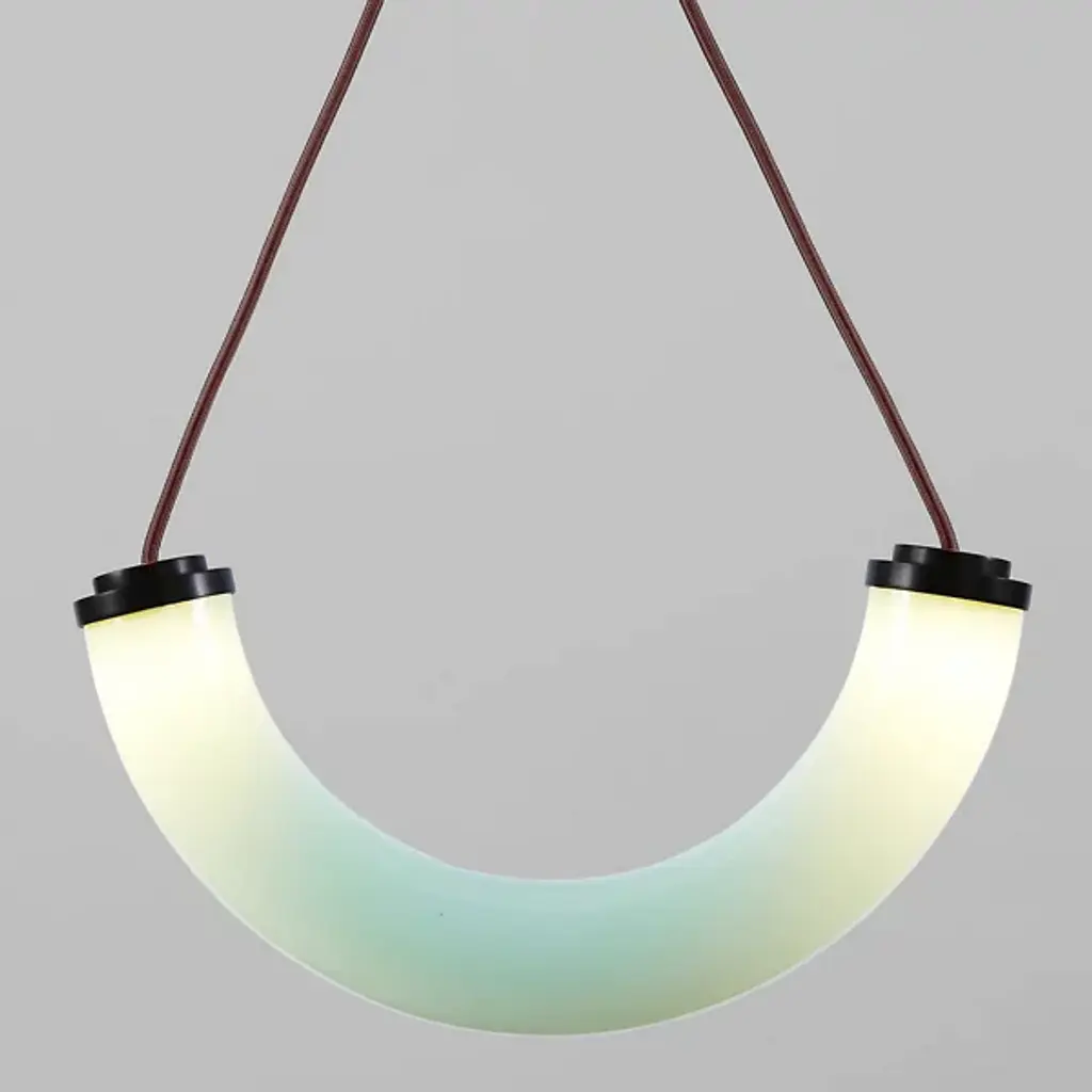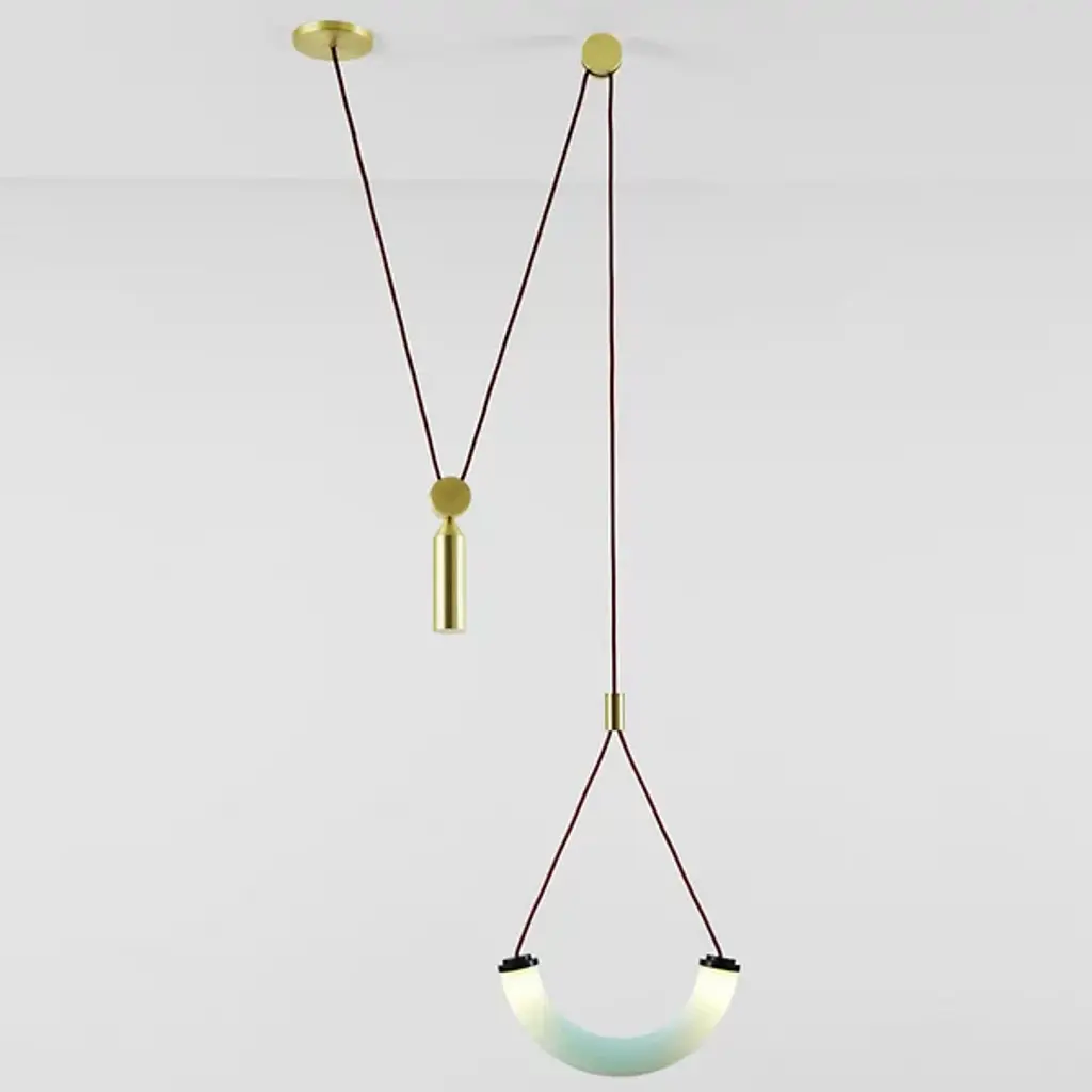 The Shape Up Arc Pendant from Roll & Hill presents a delightful and ethereal ensemble of basic geometric forms arranged in a graceful, open composition. Designed by Ladies & Gentlemen Studio, this fixture features LED lighting nestled within captivating shade shapes, emphasizing spatial balance. Suspended from slender cables attached to small metal fixtures, the lamp is elegantly showcased. Crafted from steel, brass, and aluminum, these fixtures secure energy-efficient lighting within an arc-shaped shade crafted from Celadon glass, accented by a vertical metal element suspended to the side. This design minimizes harsh glare, offering a blend of direct illumination and ambient glow, resulting in a captivating architectural presence customizable to complement various indoor settings.