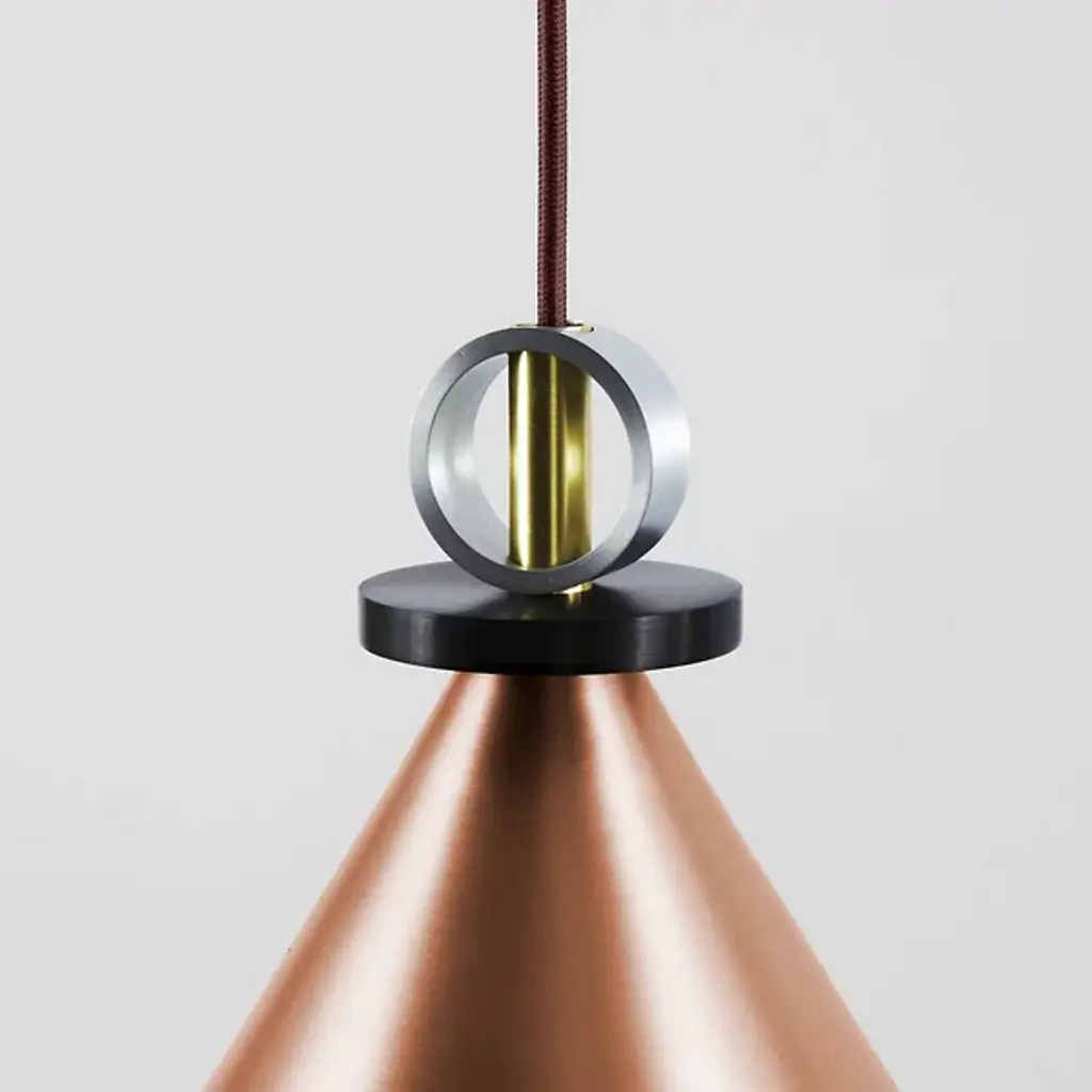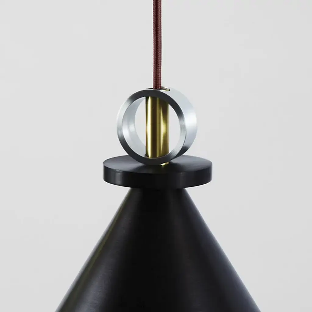 Provide a sophisticated addition to inside ceilings with the balanced and cantilevered design of the Shape Up Cone Pendant from Roll & Hill. Designed in 2014 by Ladies & Gentlemen Studio, this fixture features an inspired assembly of simple geometric shapes, creating a captivating aesthetic with harmonious balance. Suspended gracefully from above by slim cables from small, strong metal anchor points, its assembly is a combination of steel, brass, and aluminum, with a single conical shade that houses powerful lighting, shining out below, enhanced by cylindrical weights and accents, offering versatility to accommodate various architectural needs.