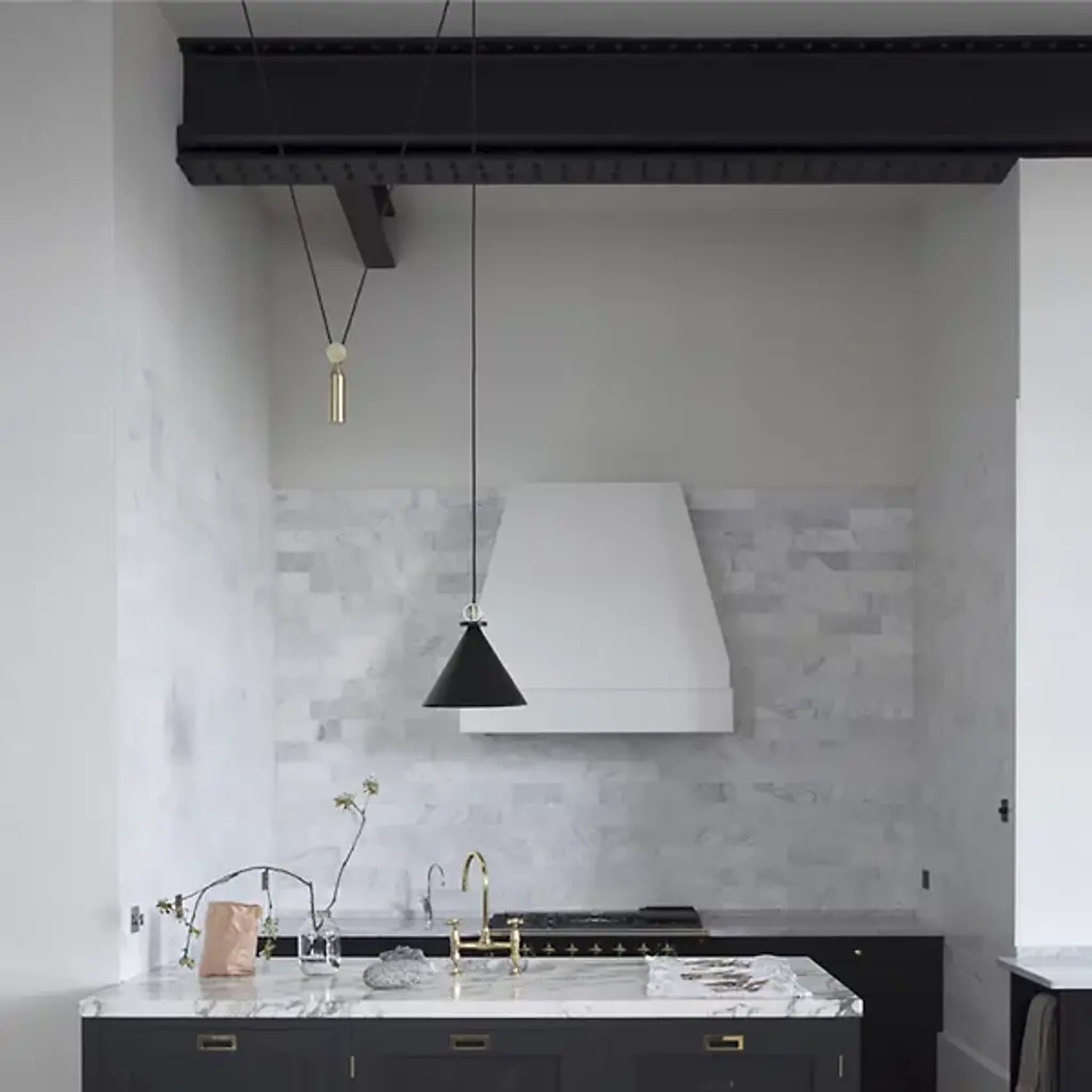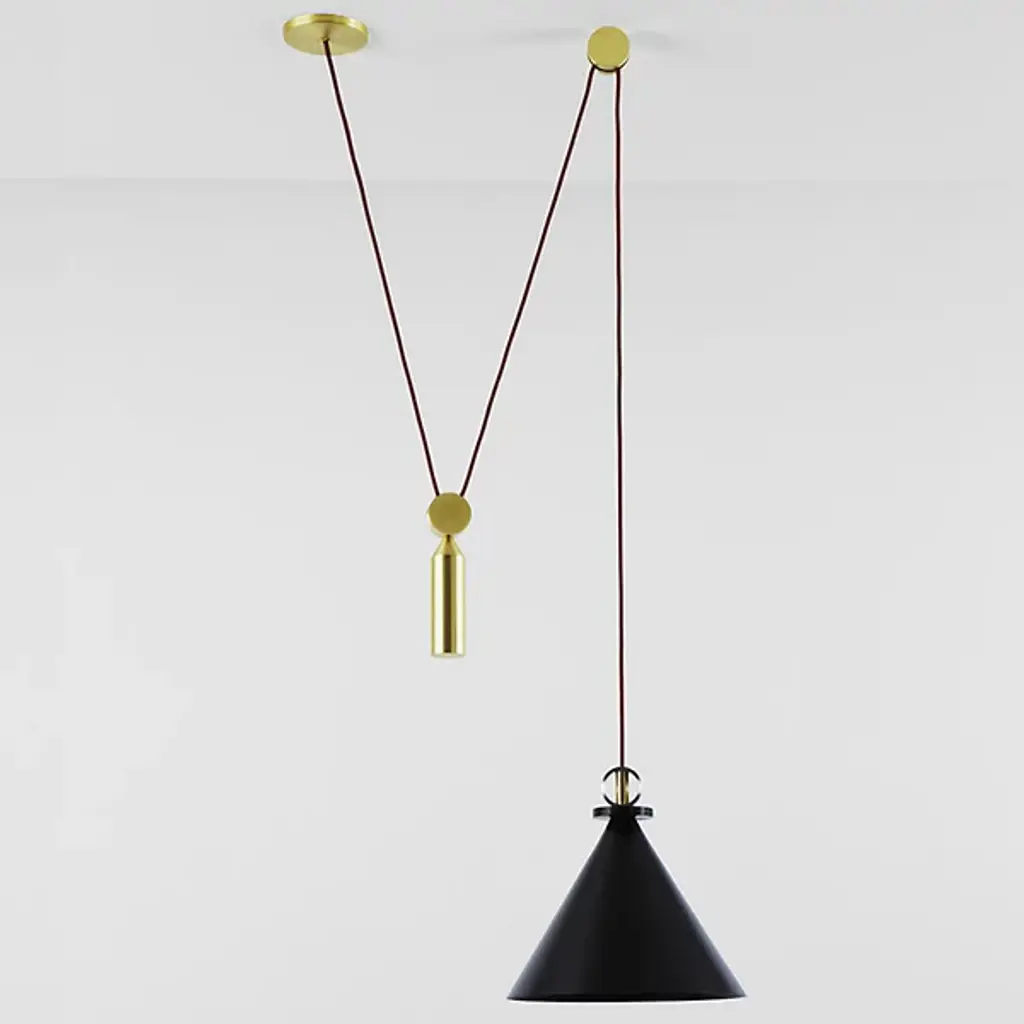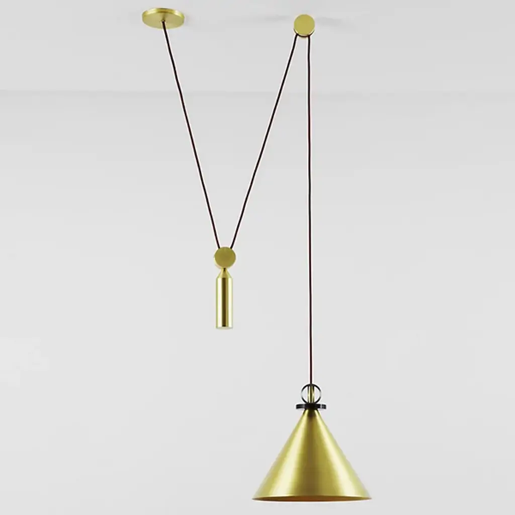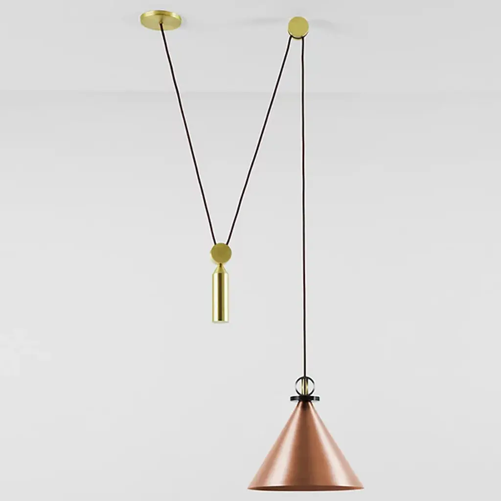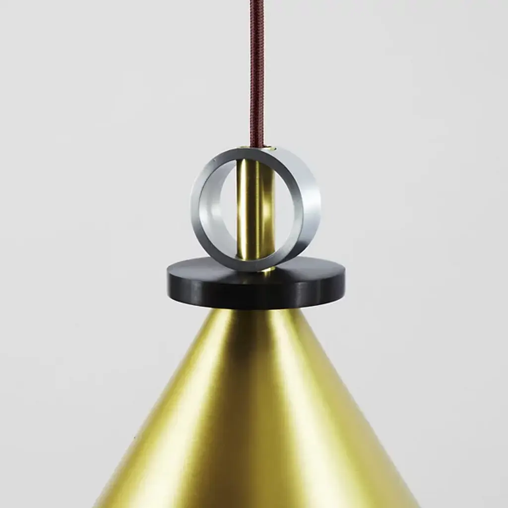 Provide a sophisticated addition to inside ceilings with the balanced and cantilevered design of the Shape Up Cone Pendant from Roll & Hill. Designed in 2014 by Ladies & Gentlemen Studio, this fixture features an inspired assembly of simple geometric shapes, creating a captivating aesthetic with harmonious balance. Suspended gracefully from above by slim cables from small, strong metal anchor points, its assembly is a combination of steel, brass, and aluminum, with a single conical shade that houses powerful lighting, shining out below, enhanced by cylindrical weights and accents, offering versatility to accommodate various architectural needs.