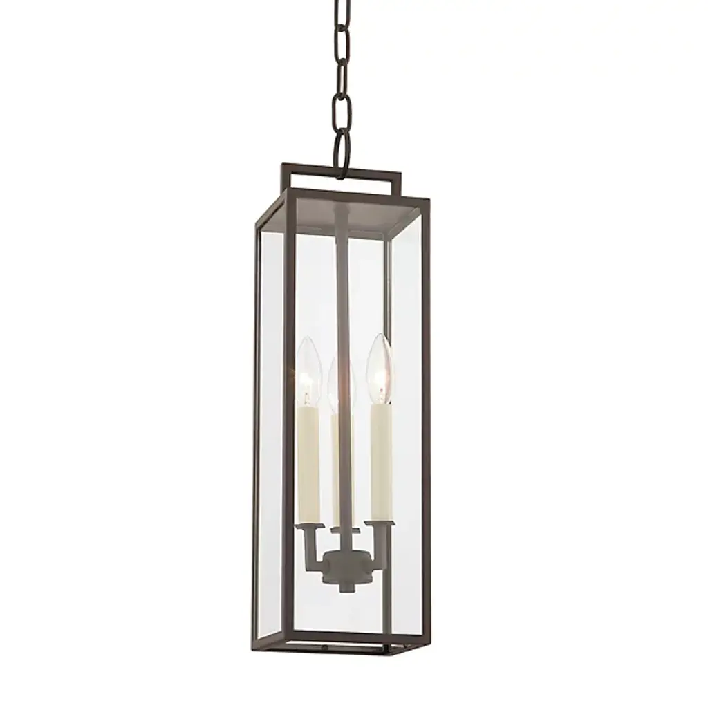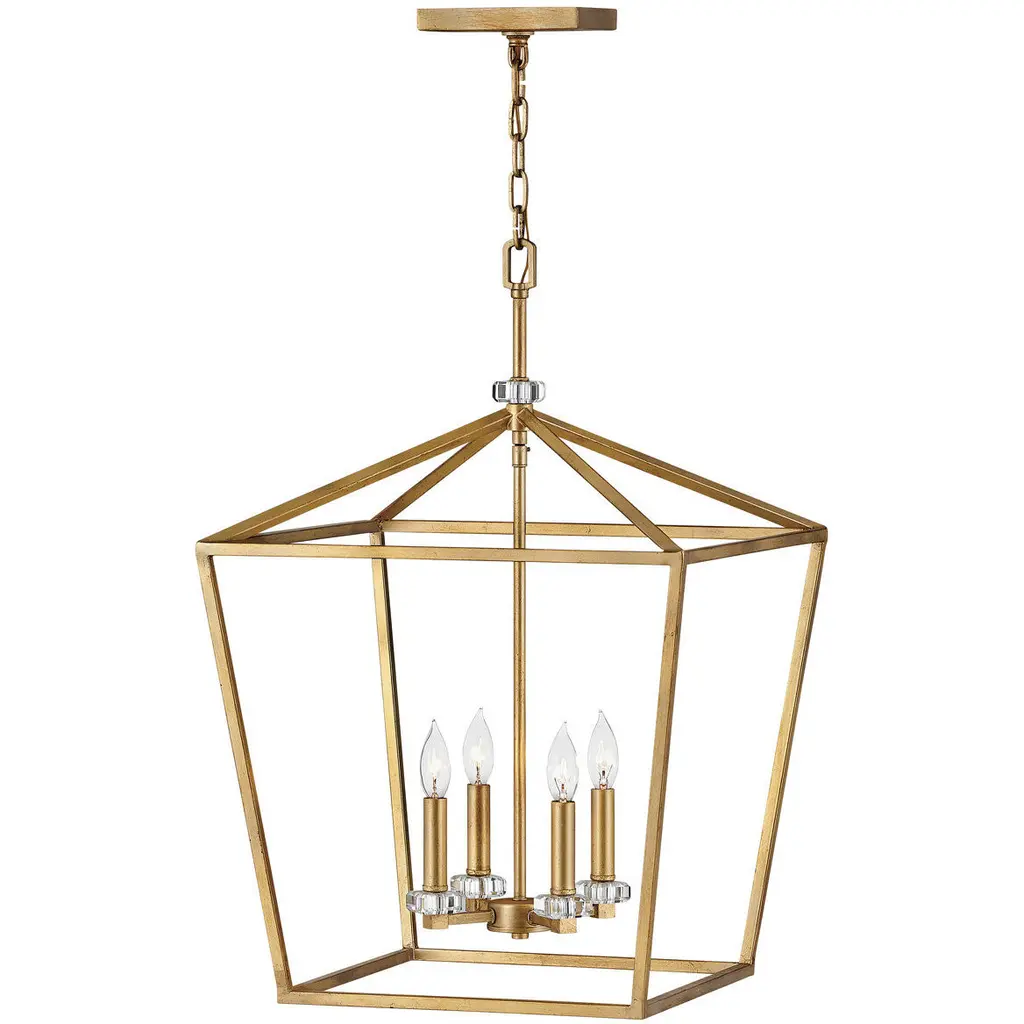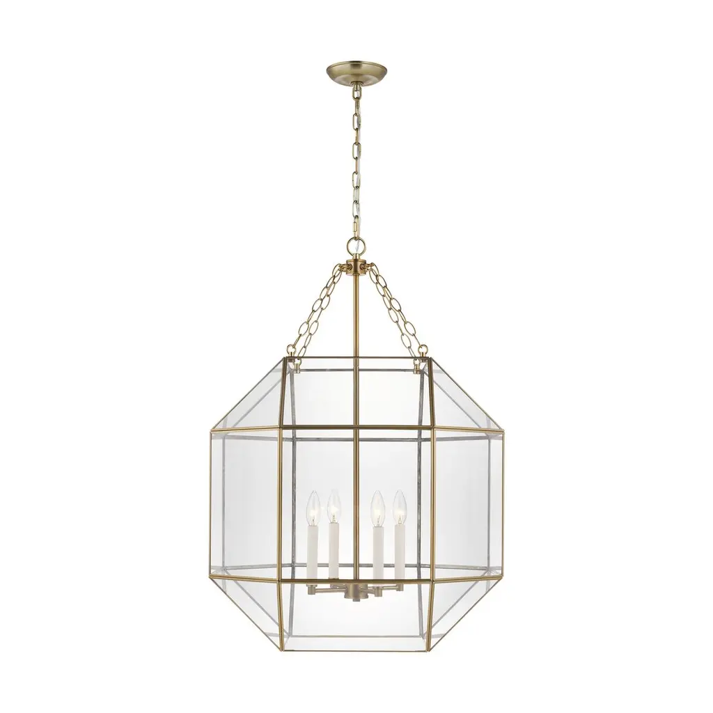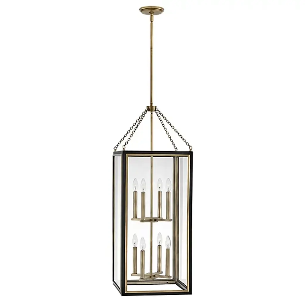 The Shaw 2 Tier Pendant from Hinkley Lighting dispenses an elegant ambiance with ease using an open structure and traditional design methods. Retained from above by a stepped circle canopy and slender stem, two tiers of candelabra lamping extend from horizontal crossbar structures. While a two-tone rectangular prism shade descends around them, suspended by four fine chains. This lends the fixture a more traditional appearance, while clear glass panels on each open side cut direct glare to the sides, exchanging it for a more even layer of light.