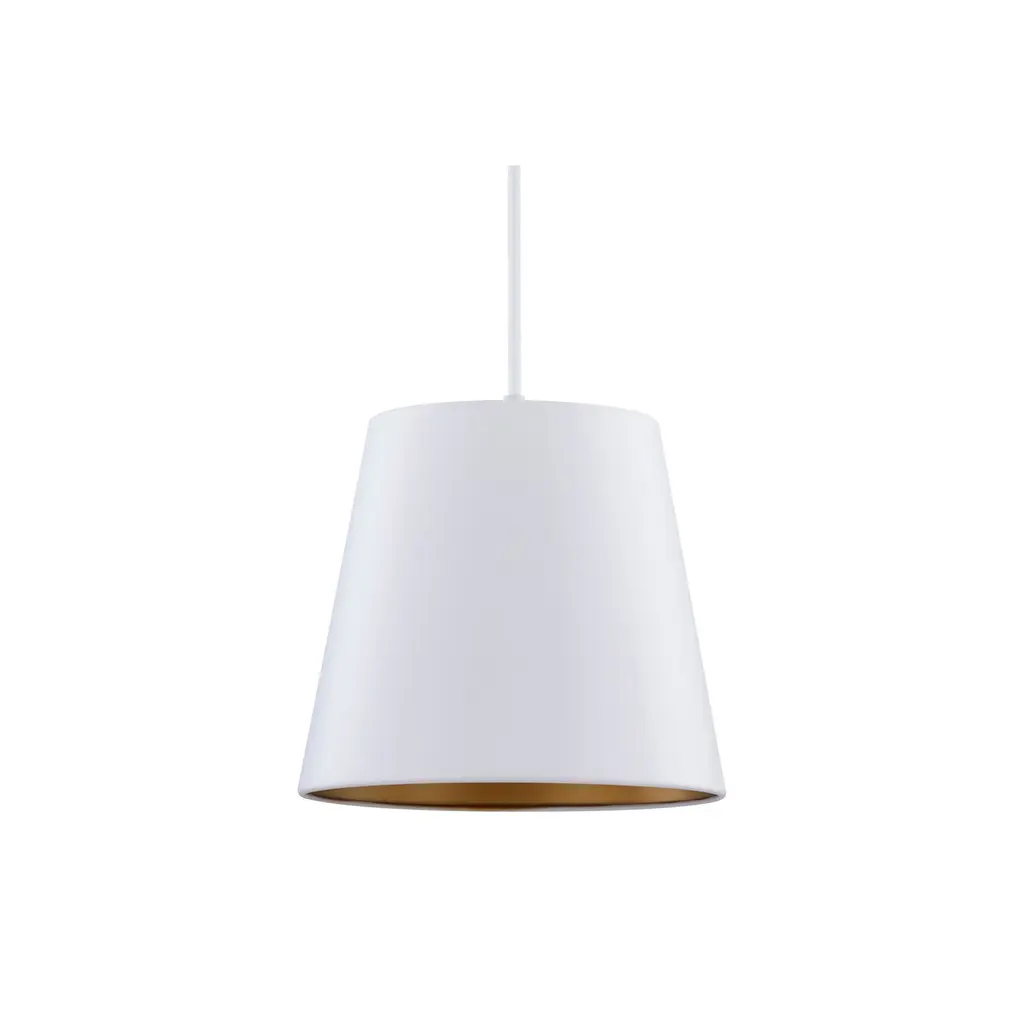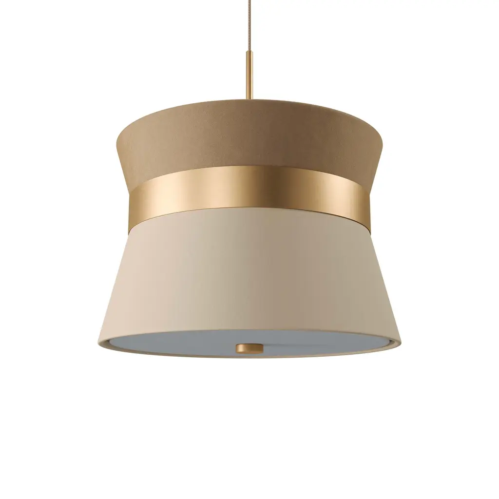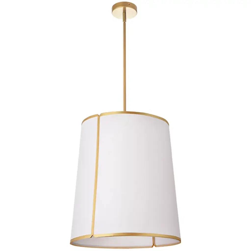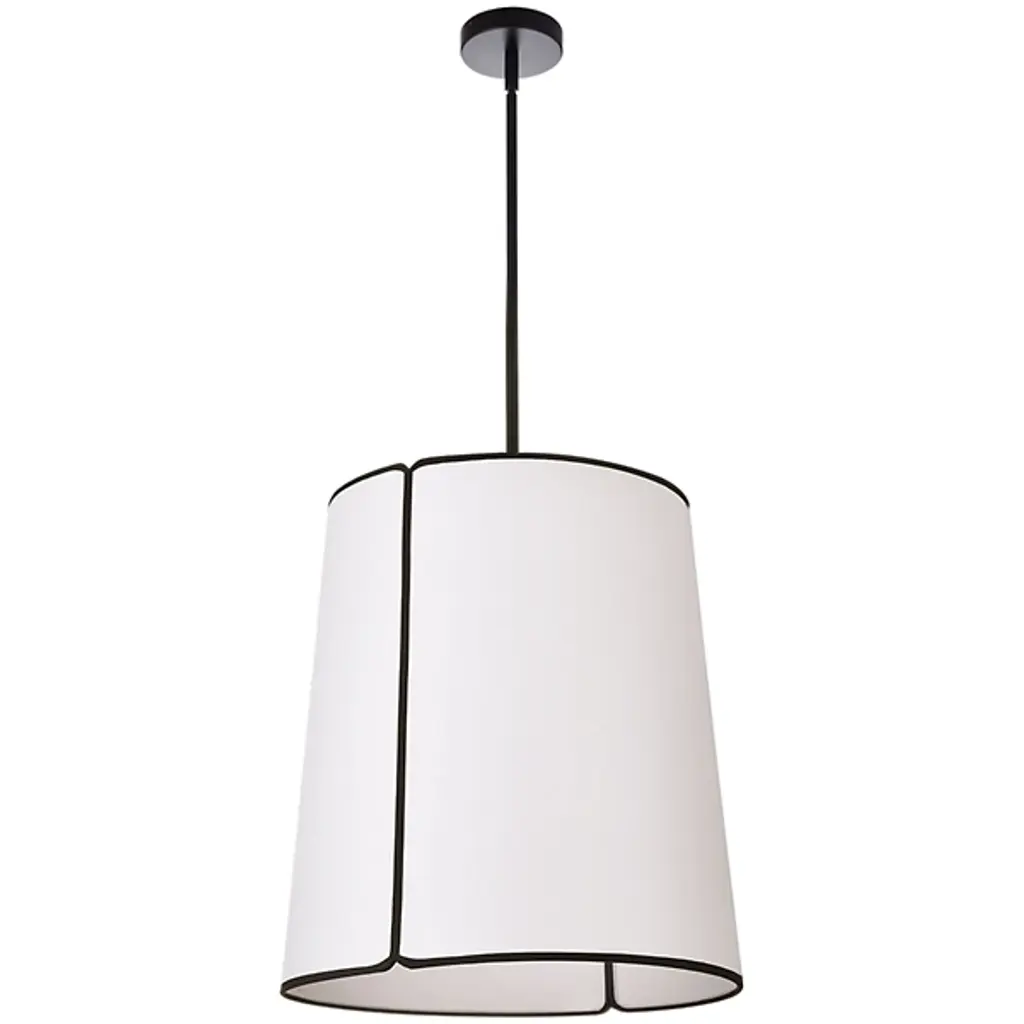 Pendant lighting that stands out with grand proportions and distinctive details. The Shaya Notched Drum Pendant by Dainolite features a large, tapered cylinder shade. Made of fabric with a slim metal frame, the shade showcases notched details where its 2 halves meet, at the top and bottom. In place over a kitchen island or dining table, this pendant has an elegant, refined presence and creates a broad and bright wash of ambient and direct downlight.