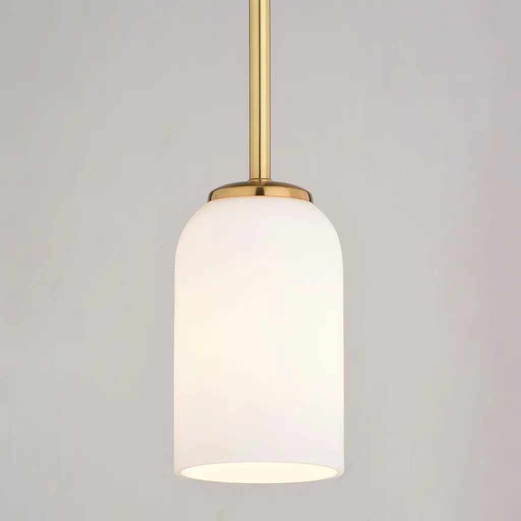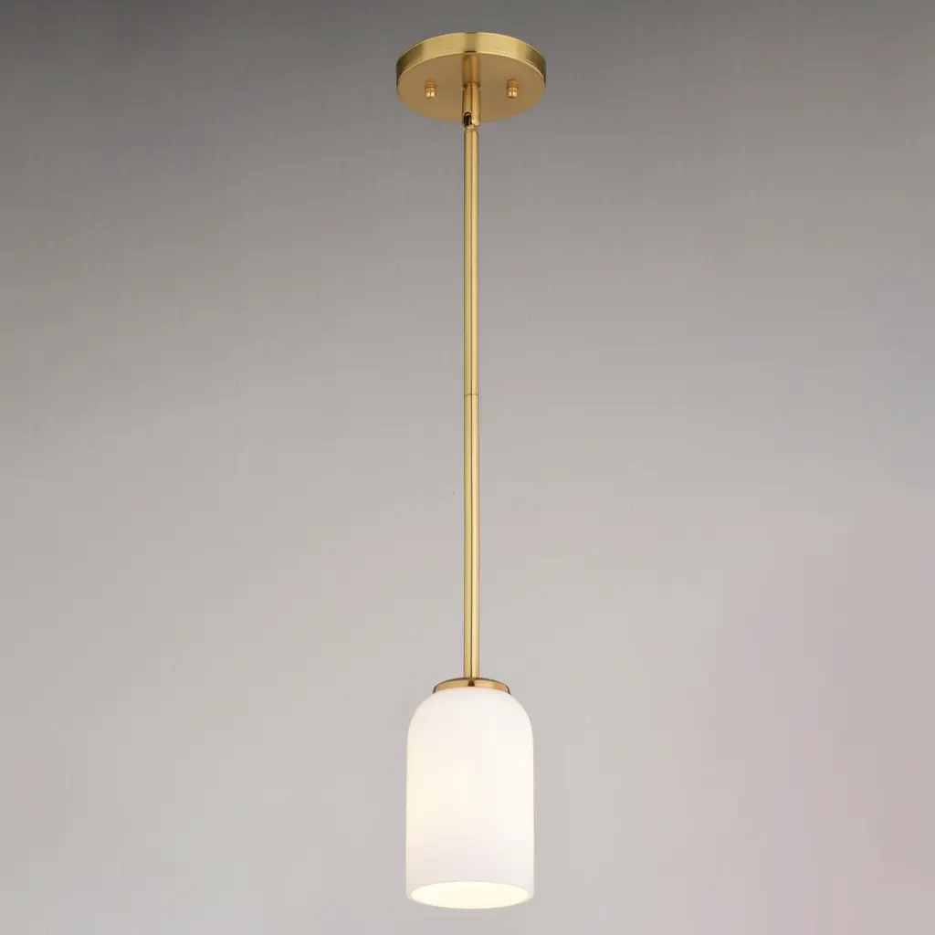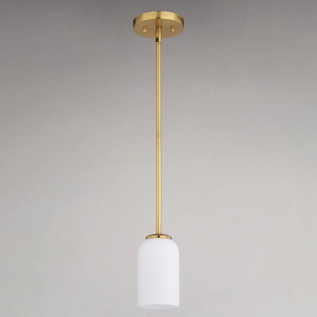 Illuminate your kitchen island or eat-in space with the Shelby 1 Light Mini Pendant. Its classic design and natural brass finish add a touch of timeless sophistication for both transitional and contemporary spaces. The elongated white dome-shaped glass shade emits a soft, diffused light, creating a warm and inviting atmosphere that's perfect for hanging out or doing homework.