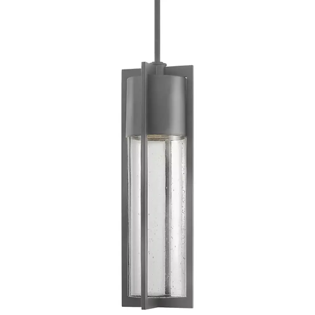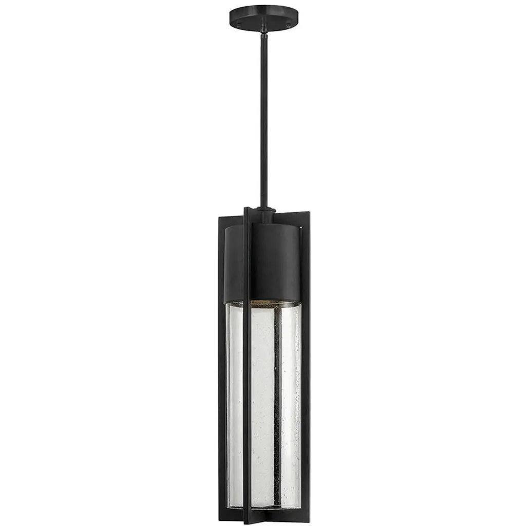 The Hinkley Lighting Shelter Outdoor Pendant adds sleek, contemporary design to exterior living spaces. Comes with a delicate cylindrical clear seeded glass shade, which is kept safe and secure within a metal frame that comes in a black finish to match the stem and canopy. Dark Sky compliant.
