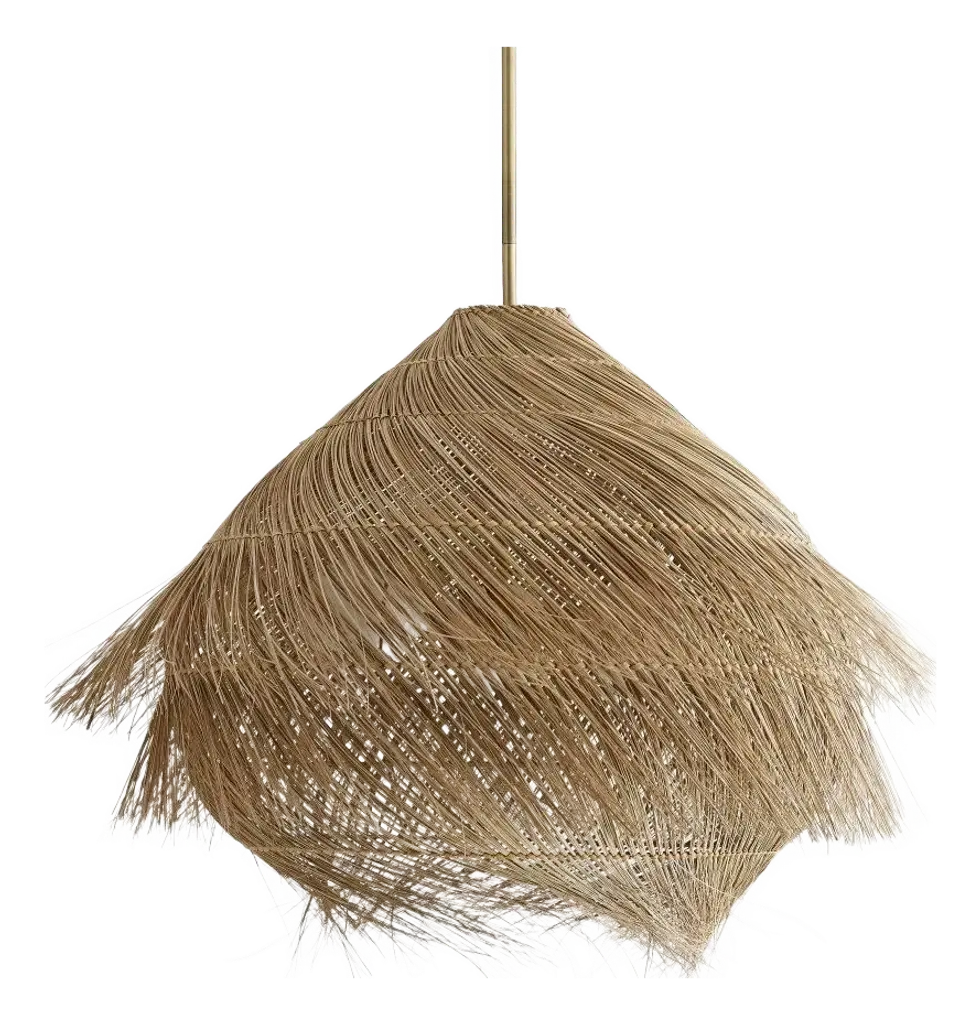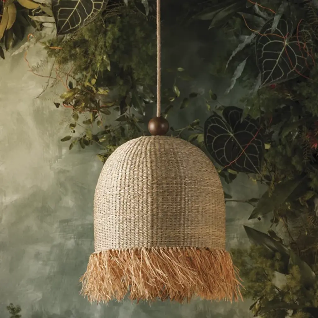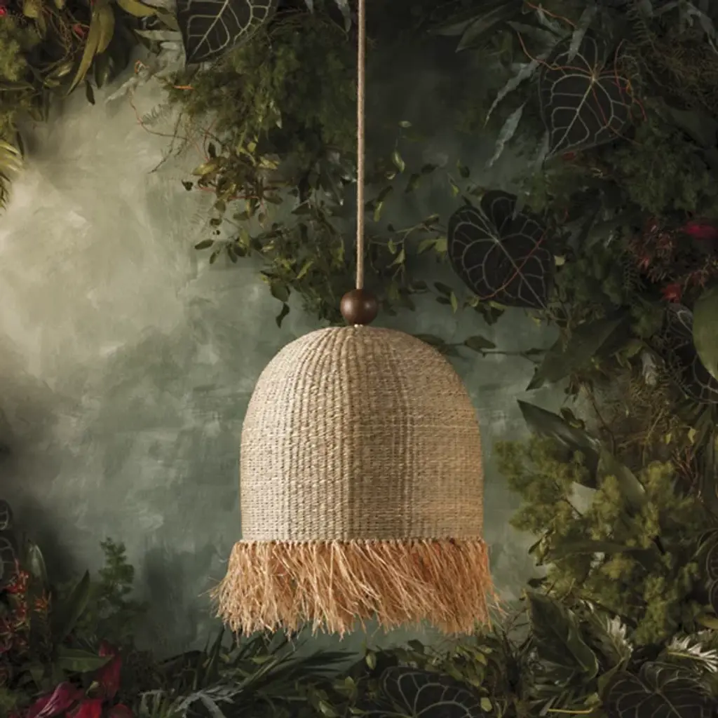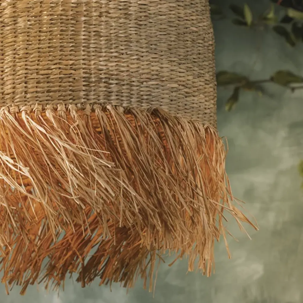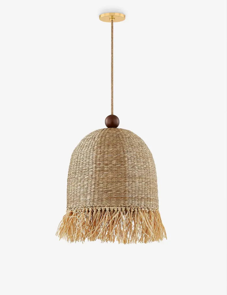 The Sheri Pendant from Mitzi, designed by Mandy Cheng, introduces fashion-forward natural textures to ceiling lighting. A woven raffia shade with distinctive fringe detailing creates a rich tactile presence that transforms a room even when unlit. The pendant's natural materials are punctuated by a spherical metal detail that introduces a contrasting note of precision against the organic weave. When illuminated, the light filters through the natural fibers, casting patterned shadows that extend the luminaire’s visual impact beyond its physical form. This piece belongs to a versatile family of fixtures that includes wall and table options, allowing for cohesive material stories throughout diverse spaces.