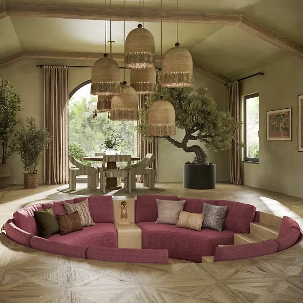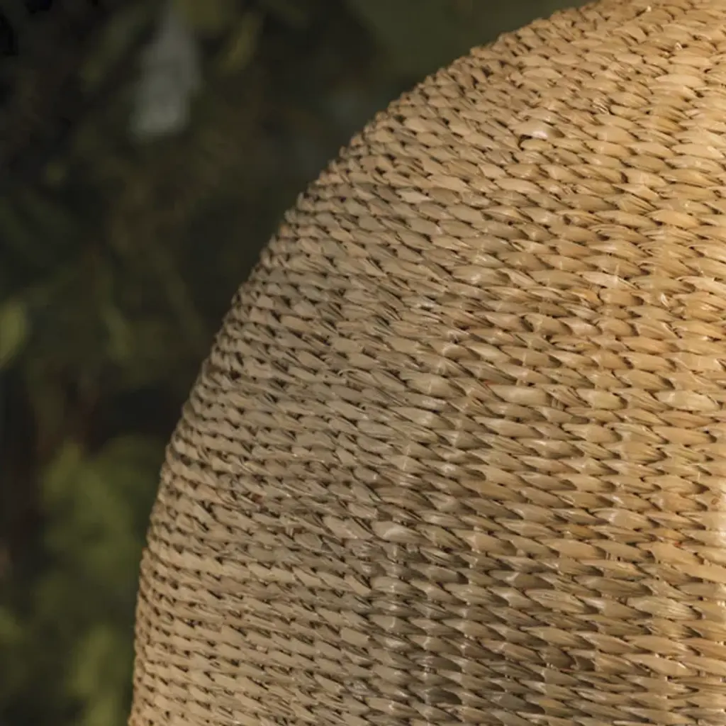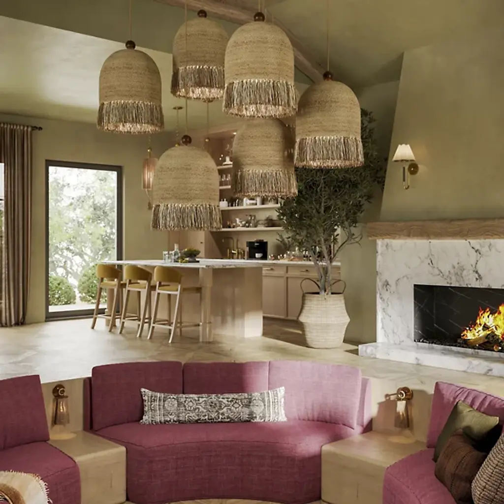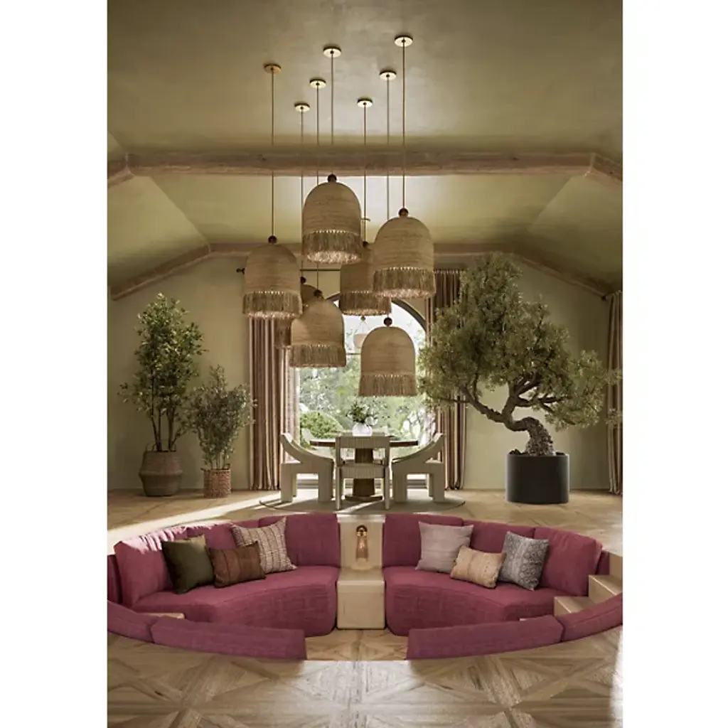 The Sheri Pendant from Mitzi, designed by Mandy Cheng, introduces fashion-forward natural textures to ceiling lighting. A woven raffia shade with distinctive fringe detailing creates a rich tactile presence that transforms a room even when unlit. The pendant's natural materials are punctuated by a spherical metal detail that introduces a contrasting note of precision against the organic weave. When illuminated, the light filters through the natural fibers, casting patterned shadows that extend the luminaire’s visual impact beyond its physical form. This piece belongs to a versatile family of fixtures that includes wall and table options, allowing for cohesive material stories throughout diverse spaces.