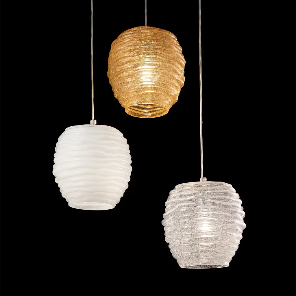 A design of deeply irregular grooves reminiscent of windblown desert sand is the distinctive trait of this pendant lamp, crafted by skilled artisans by blowing the glass in a specific mold following ancient techniques. An effortless synthesis of tradition and contemporary sensibility, it will be ideally showcased with twins suspended over a kitchen island, hallway, or entryway. The artisan crafting process guarantees the singularity of every piece.