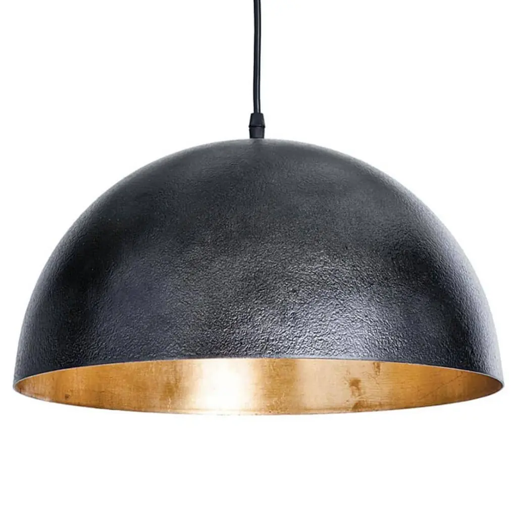 A simple dome shade brings sleek minimalism to the mix. Featuring a gold-leafed finish on the shade's interior, this gives the room a warm glow and a sophisticated pop of contrast.