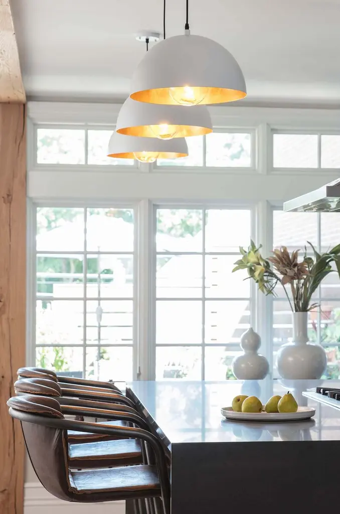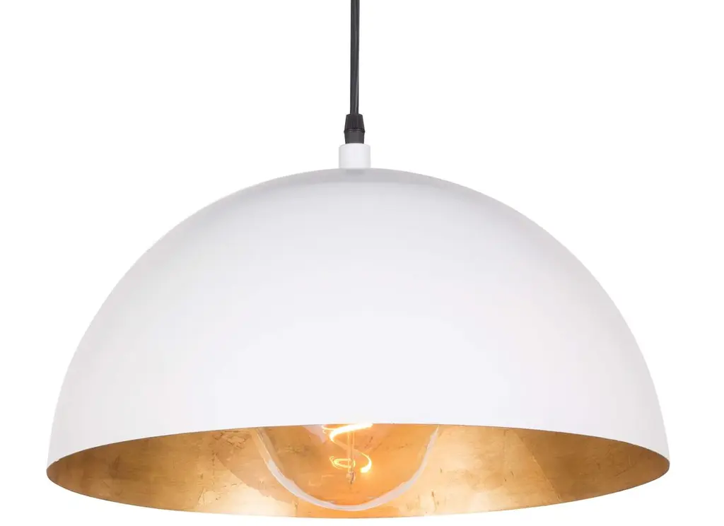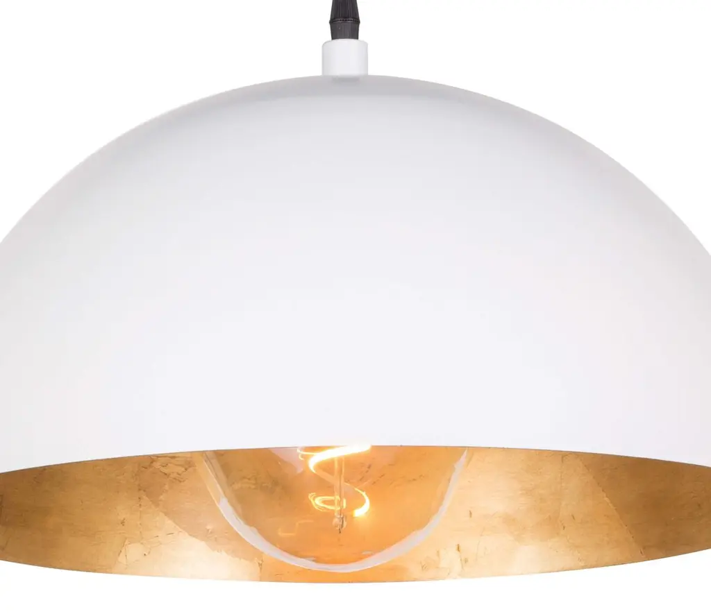 Full of retro appeal, this pendant flaunts a dome-shape iron shade and golden interior that reflects a warm, soft glow. A white finish adds clean contrast. Hardwired.