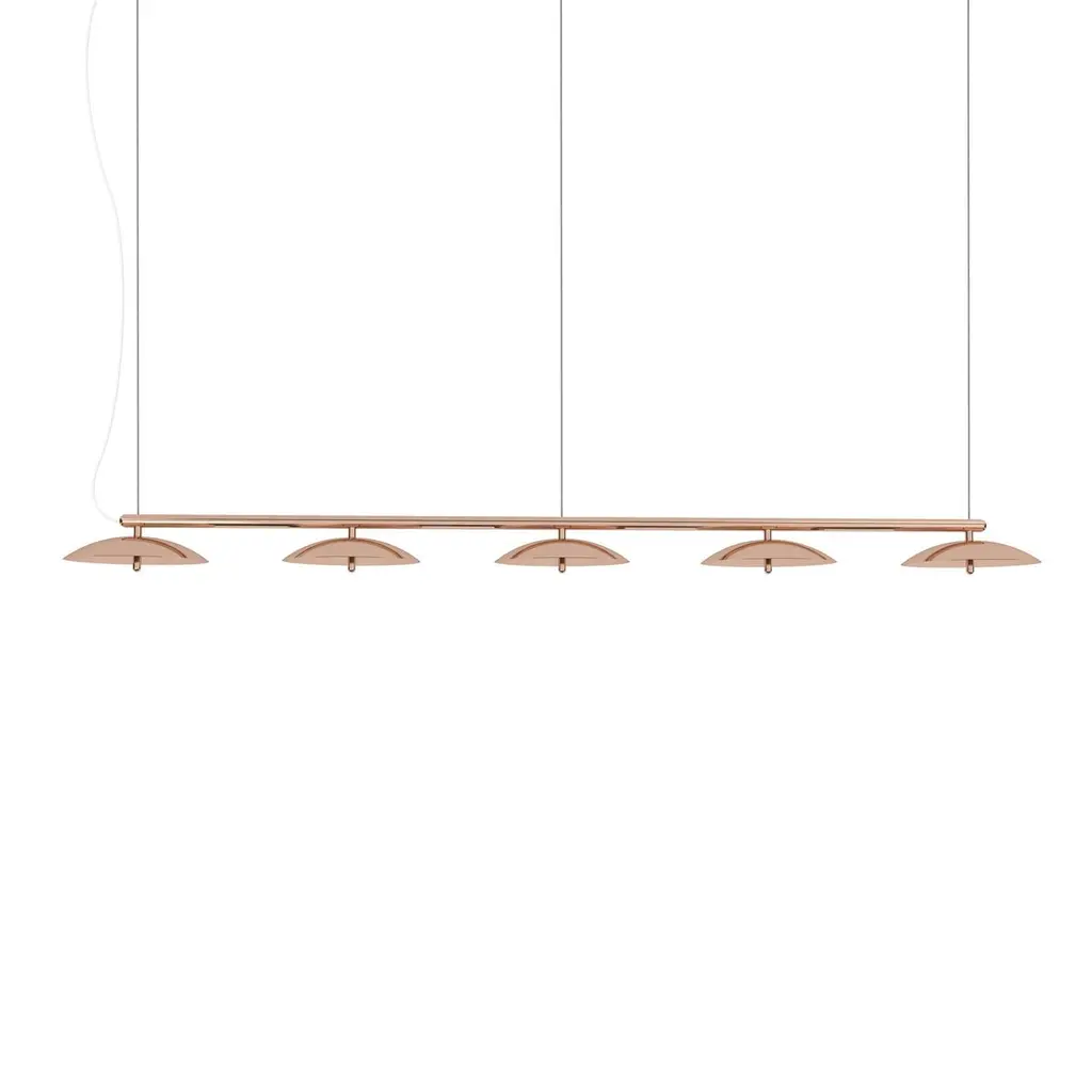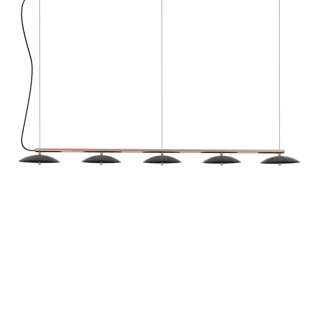 Perfect above a dining table or a conference table, the signal linear pendant is a decidedly modern linear suspension light. A polished metal arm effortlessly supports spun metal shades that cast a downward glow through perforated diffusers. The signal linear pendant is available in a number of sizes, mix-and-match finishes, and can be further customized to nearly any length.Lamping: G8 LED Bulbs (included)Canopy: Black, 5in Diameter, .25in height10x G8 LED bulbs included (2 per shade)60w, 6000 Lumens, CRI 90+