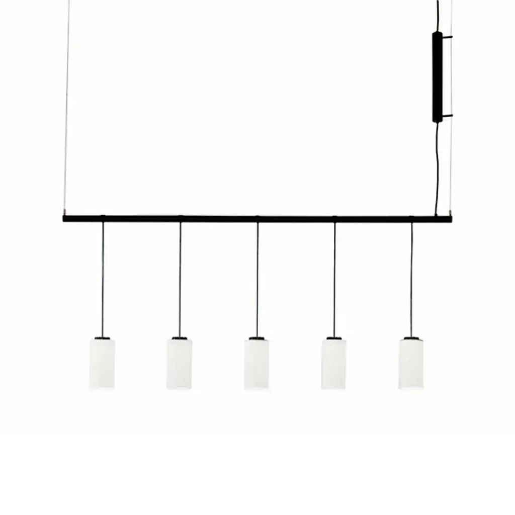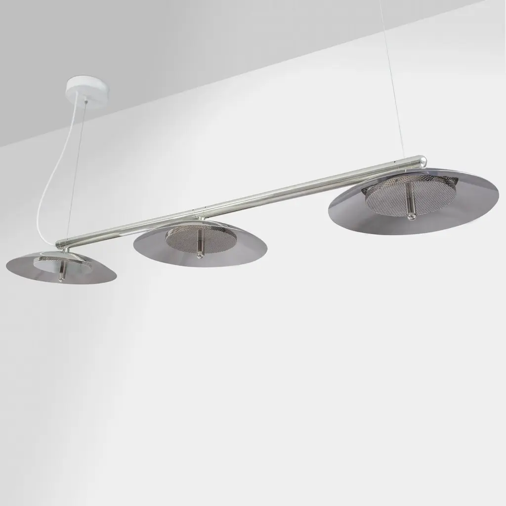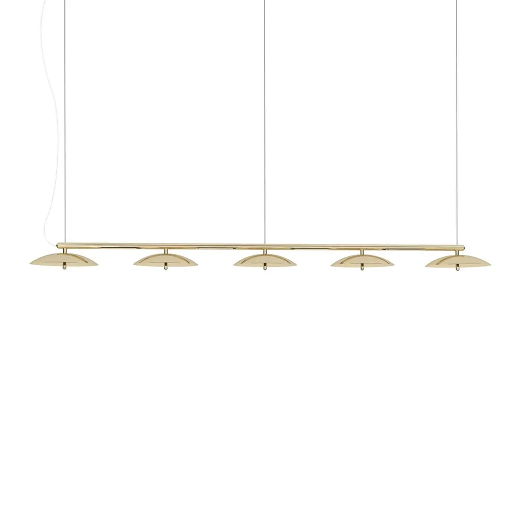 Perfect above a dining table or a conference table, the signal linear pendant is a decidedly modern linear suspension light. A polished metal arm effortlessly supports spun metal shades that cast a downward glow through perforated diffusers. Thesignal linear pendant is available in a number of sizes, mix-and-match finishes, and can be further customized to nearly any length.Lamping: G8 LED Bulbs (included)Canopy: Black, 5in Diameter, .25in height10x G8 LED bulbs included (2 per shade)60w, 6000 Lumens, CRI 90+