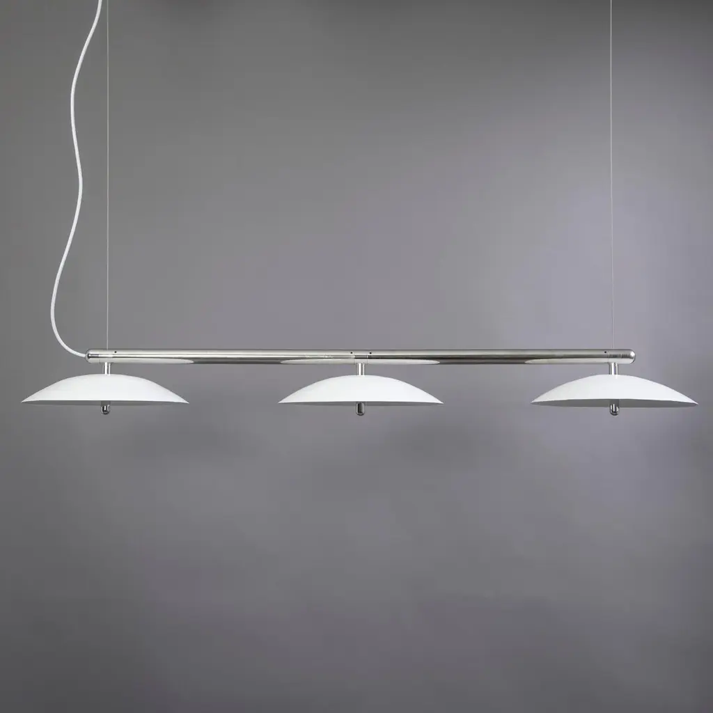 Perfect above a dining table or a conference table, the signal linear pendant is a decidedly modern linear suspension light. A polished metal arm effortlessly supports spun metal shades that cast a downward glow through perforated diffusers. The signal linear pendant is available in a number of sizes, mix-and-match finishes, and can be further customized to nearly any length.Lamping: G8 LED Bulbs (included)Canopy: Black, 5in Diameter, .25in height8x G8 LED bulbs included (2 per shade)48w, 4800 Lumens, CRI 90+
