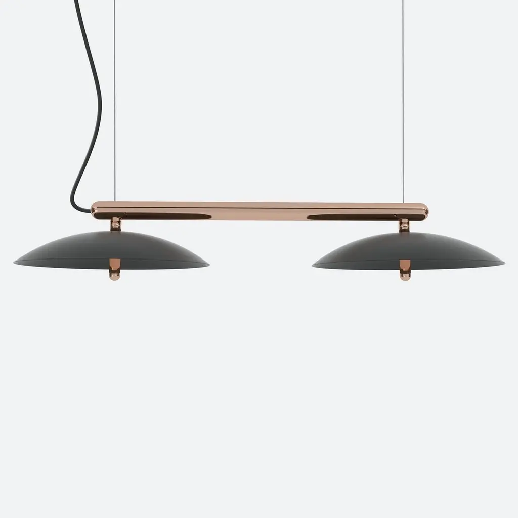 Price is for a signal linear pendant with black shades and copper accents. This piece is customizable so we can also make the finishes per order to your spec. Lamping: G8 LED Bulbs (included)Canopy: Black, 5in Diameter, .25in height4x G8 LED bulbs included (2 per shade)24w, 2400 Lumens, CRI 90+