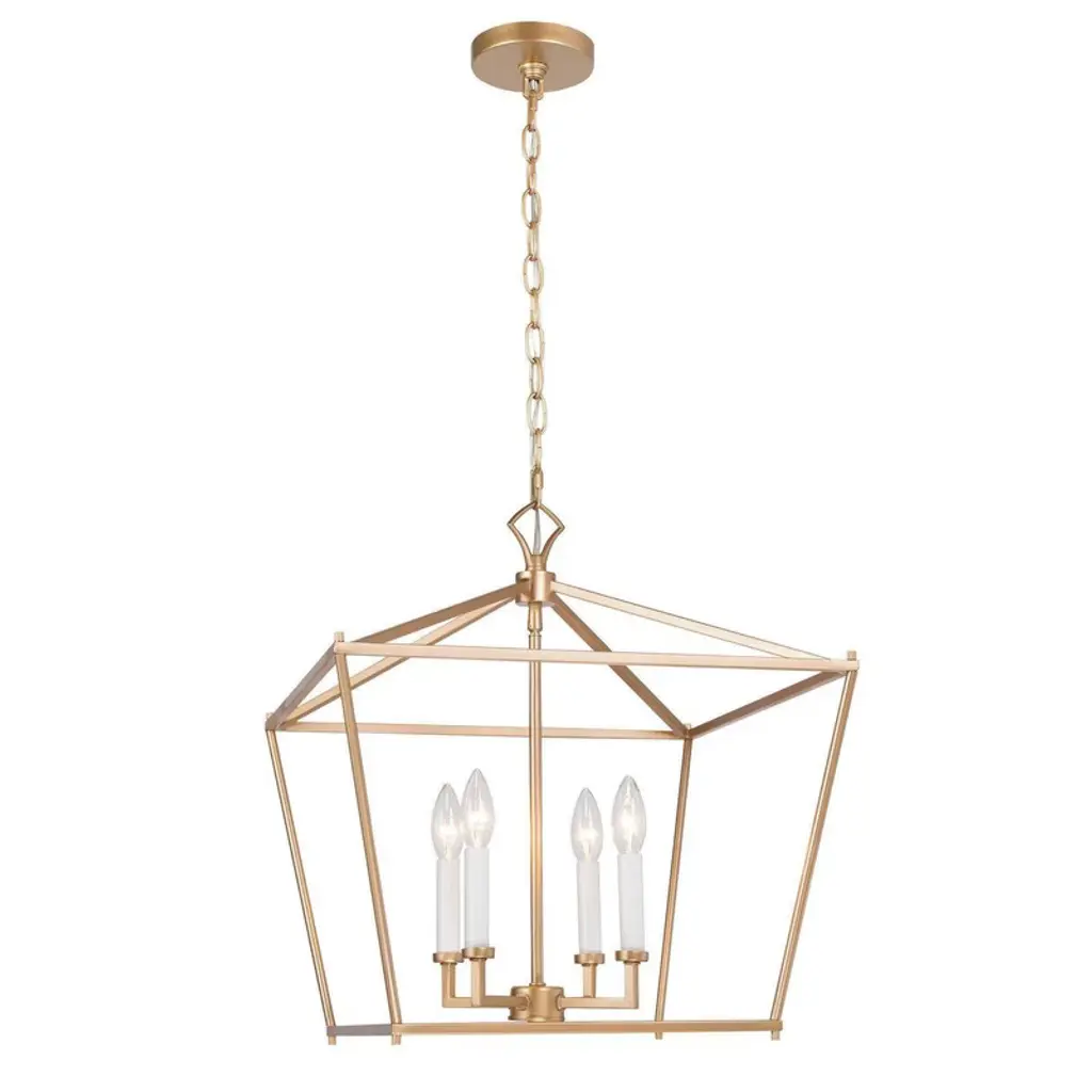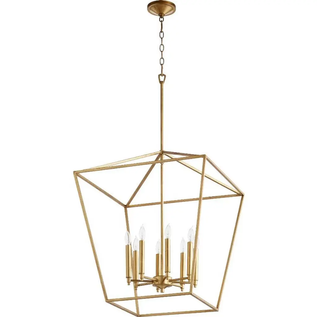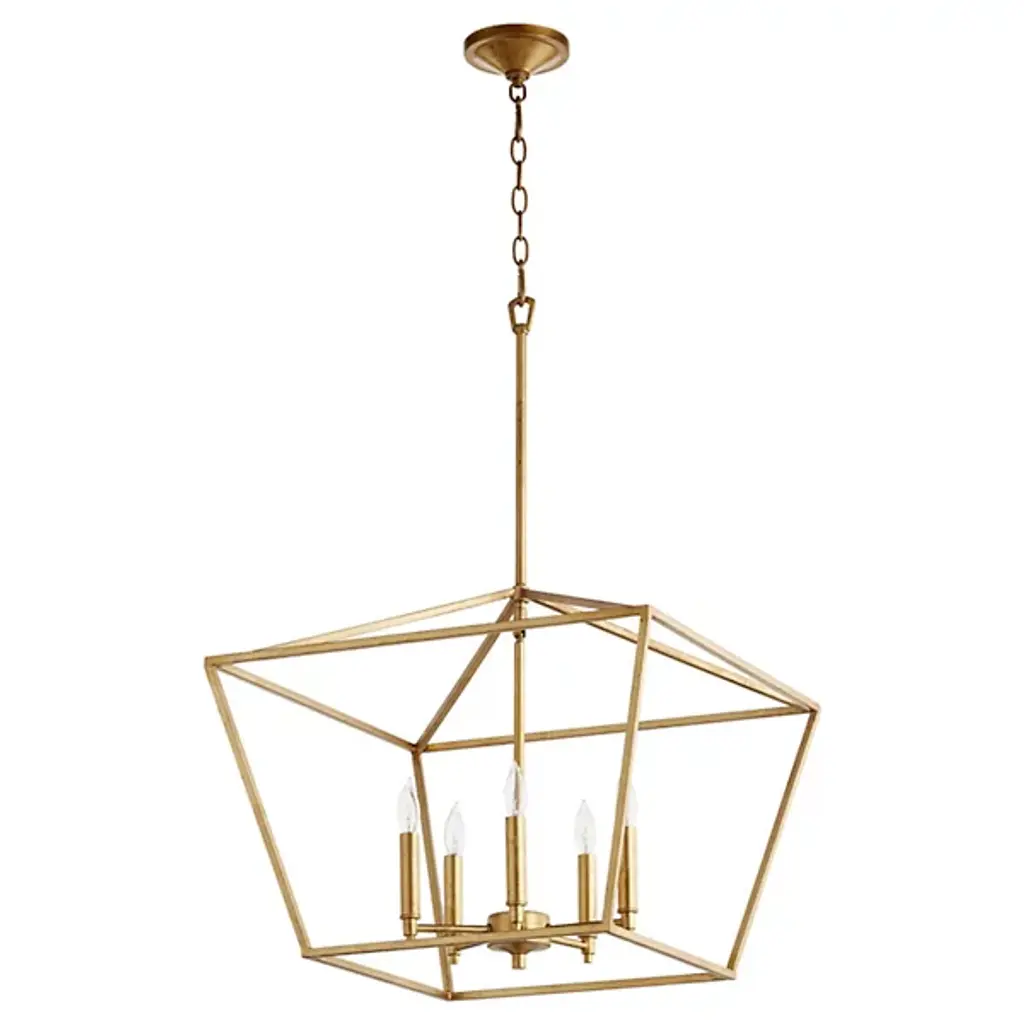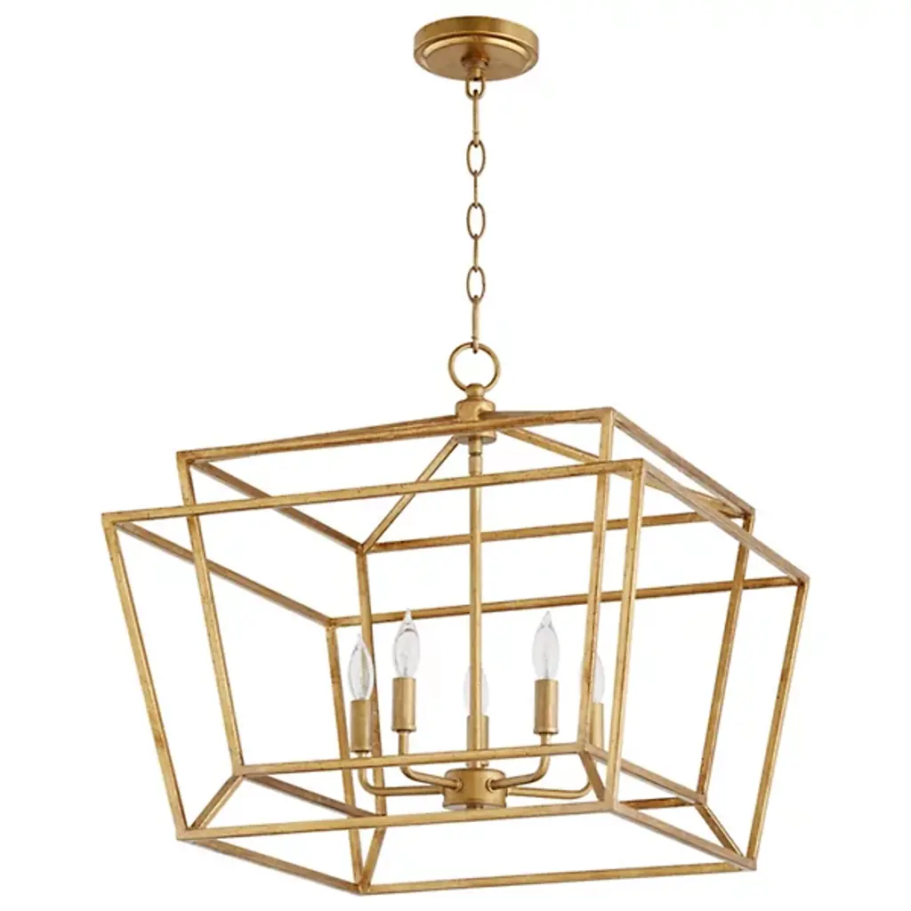 The Signature Cube Pendant by Quorum International is a contemporary fixture that catches the eye with clean, striking geometry. A cubed frame supports circular metal ribbons to form an elegant open-air design that is hung from a slender chain and stem. A central candelabra suspended at its center sprouts curved arms that hold candlestick bases. The incandescent lamping emits a warm wash of light, pleasantly beaming through its linear surroundings.