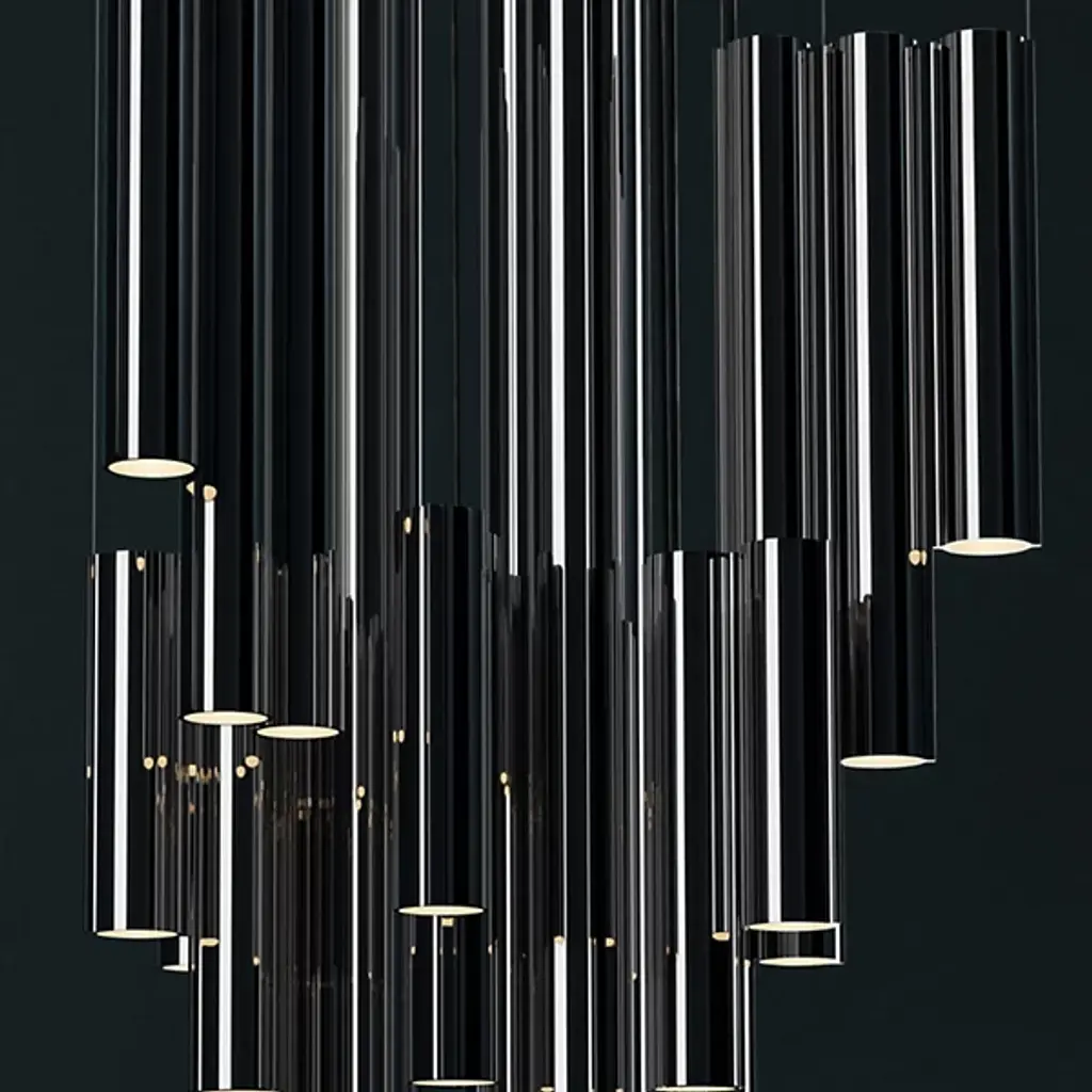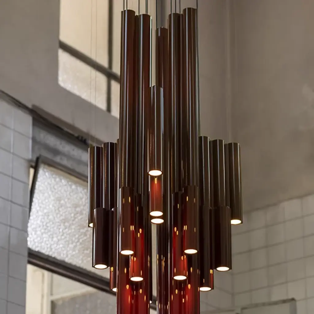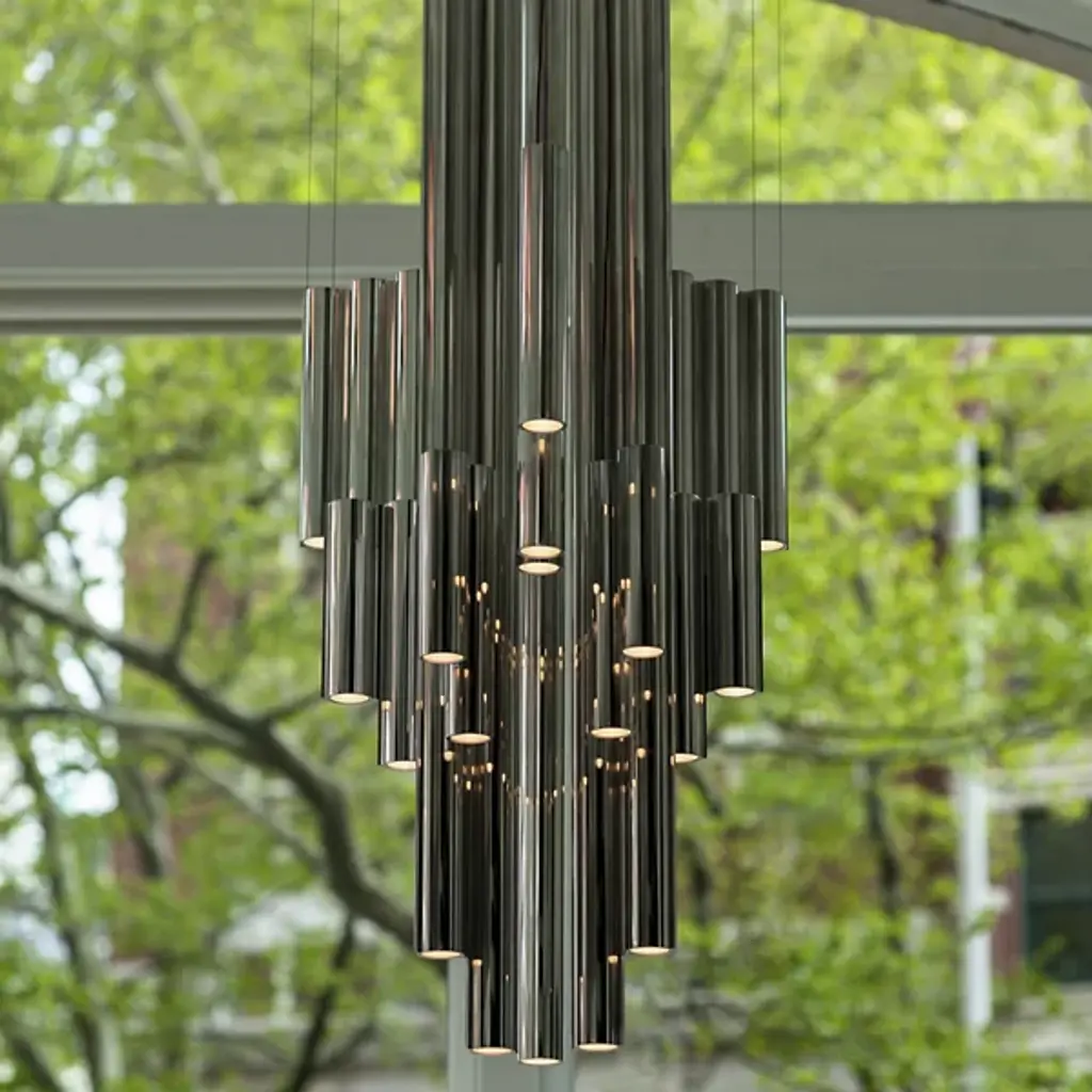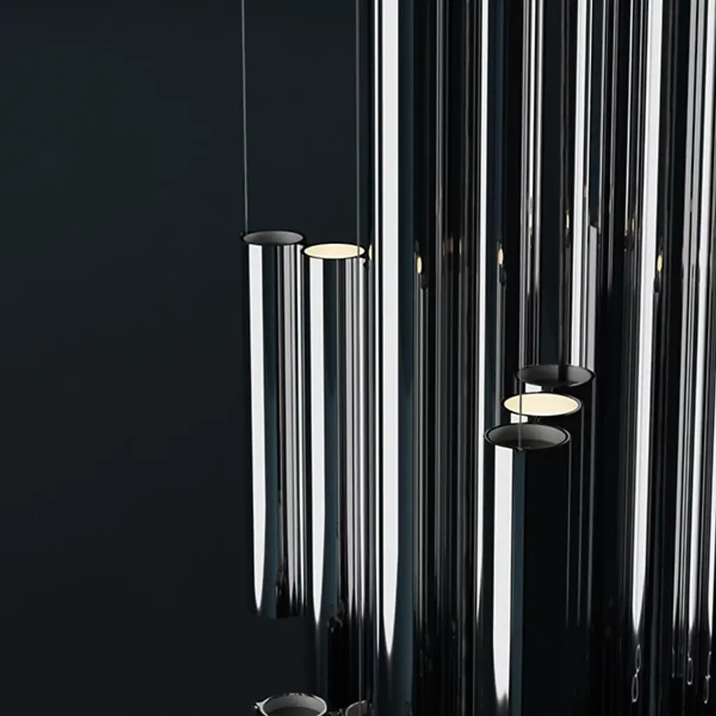 Present lasting grace and retro elegance to interiors with the Silo Atelier 01 from Lambert & Fils. A large and airy fixture that artfully blends the rural world of the farm with the refined urbanity of mid-century design. The fixture descends from a stepped circular canopy via an array of slender, strong cables, placing strong LED lamping inside a fluted array of cast aluminum extrusions that form a stepped assembly that evokes the fixture’s name. Translucent glass diffusers sit inside each tube, transforming bright glare to a soft glow and casting a compound ambiance below the fixture.