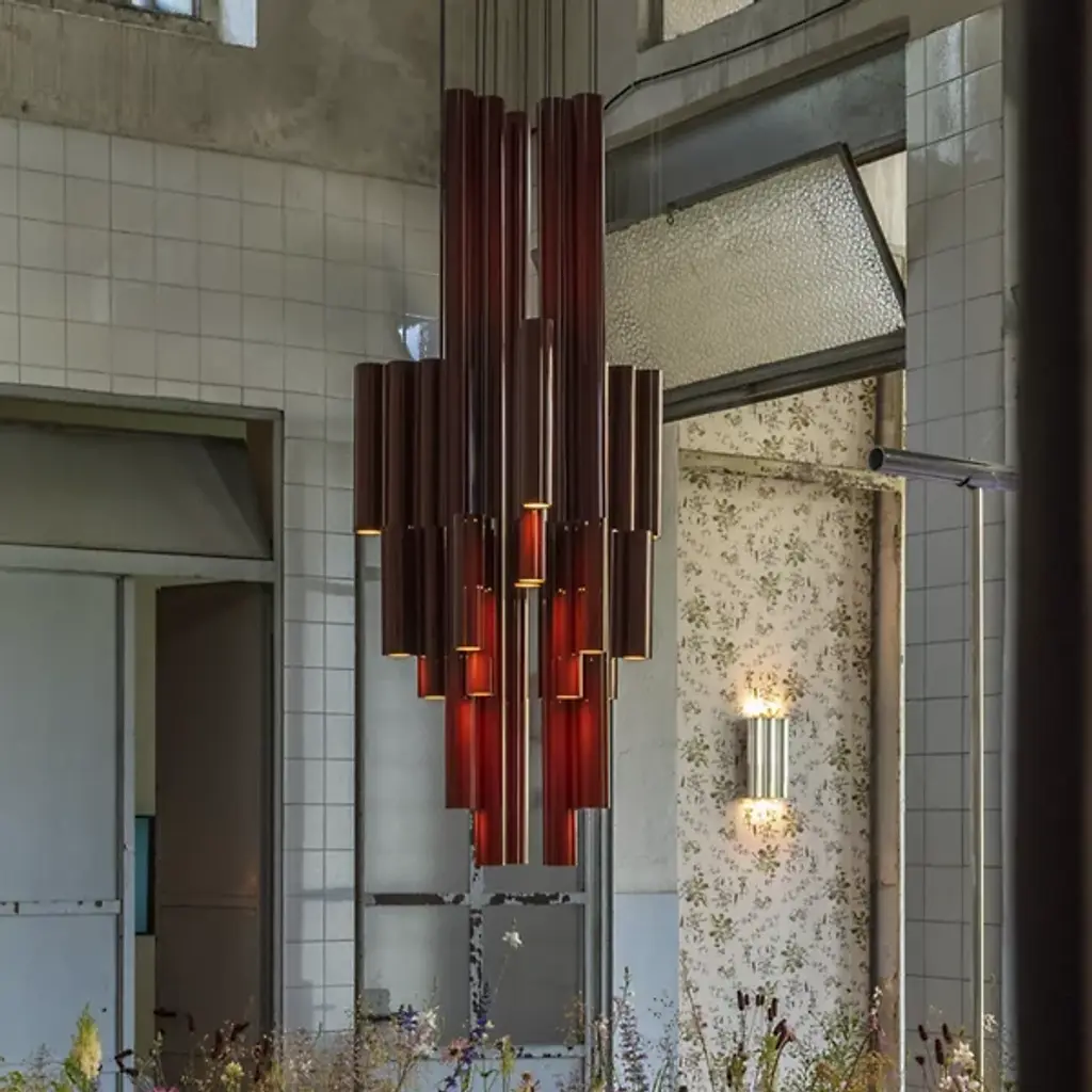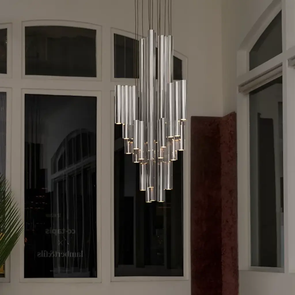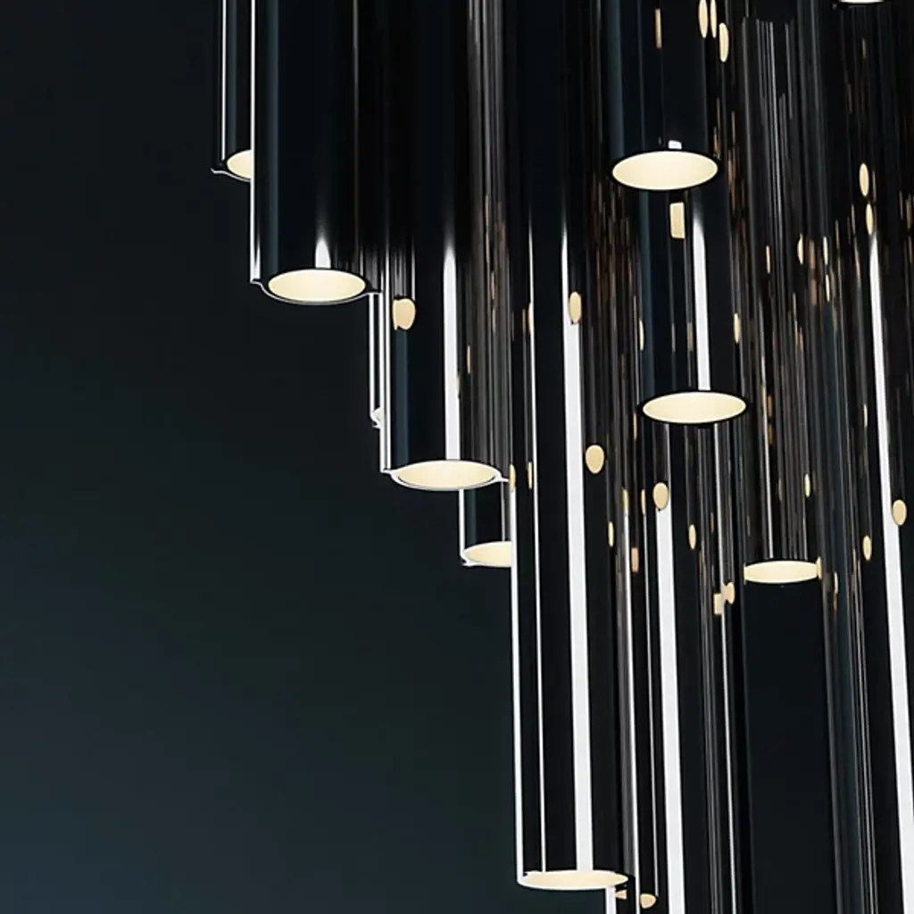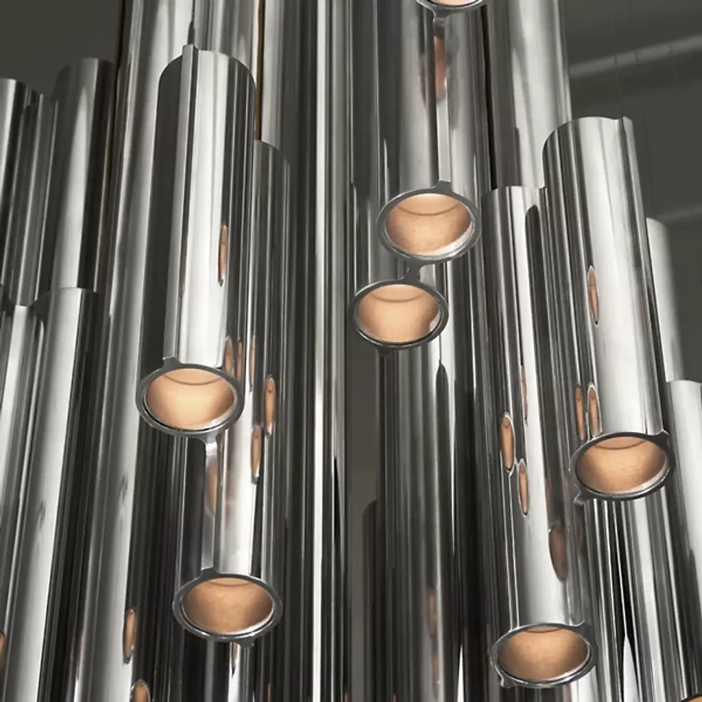 Present lasting grace and retro elegance to interiors with the Silo Atelier 01 from Lambert & Fils. A large and airy fixture that artfully blends the rural world of the farm with the refined urbanity of mid-century design. The fixture descends from a stepped circular canopy via an array of slender, strong cables, placing strong LED lamping inside a fluted array of cast aluminum extrusions that form a stepped assembly that evokes the fixture’s name. Translucent glass diffusers sit inside each tube, transforming bright glare to a soft glow and casting a compound ambiance below the fixture.