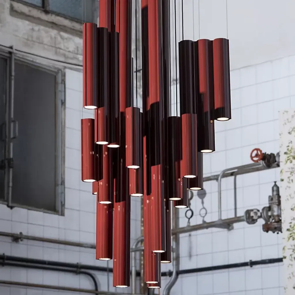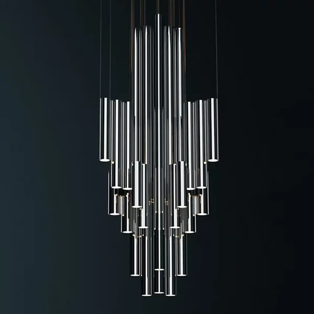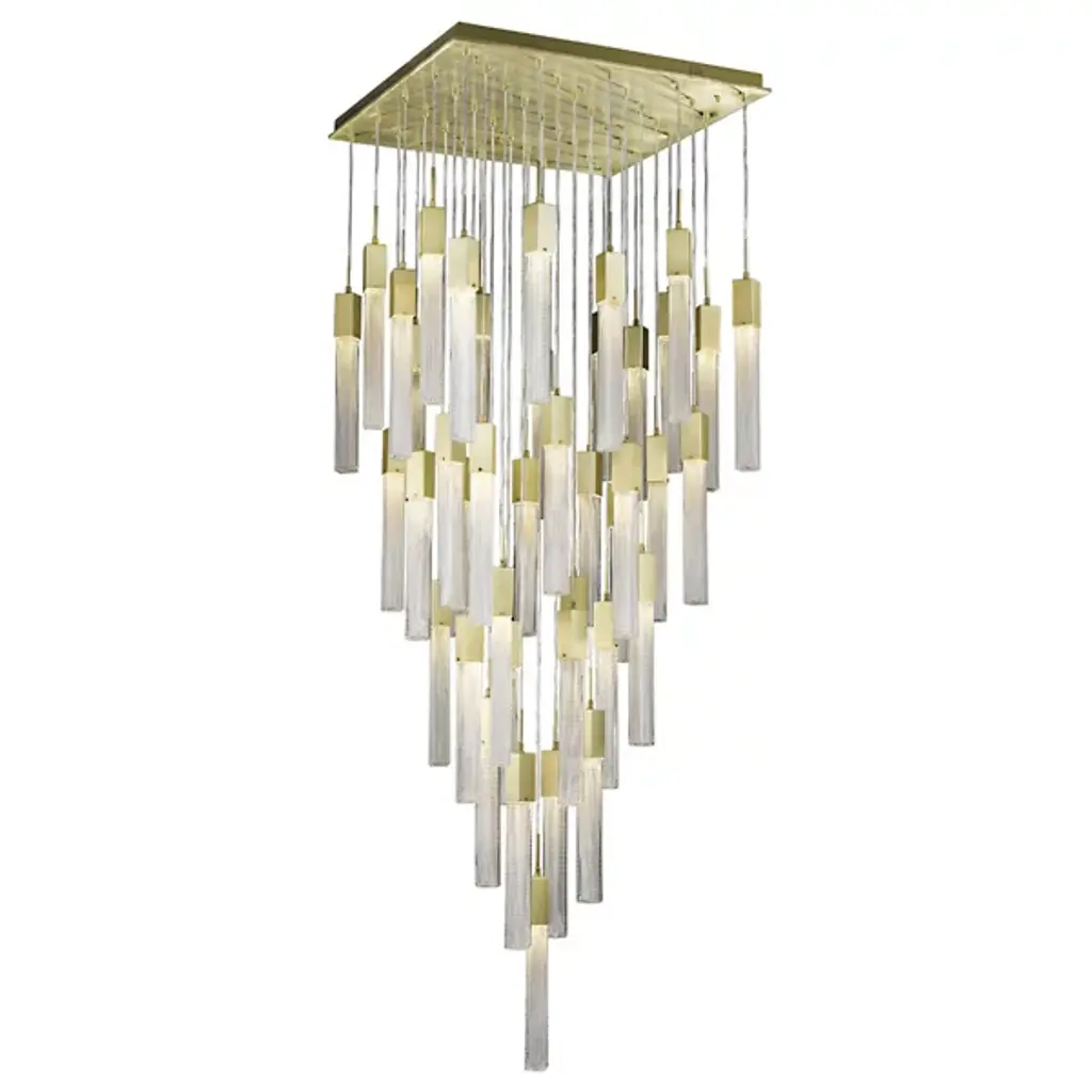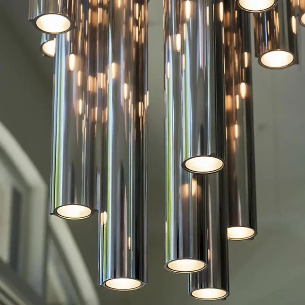 Present lasting grace and retro elegance to interiors with the Silo Atelier 01 from Lambert & Fils. A large and airy fixture that artfully blends the rural world of the farm with the refined urbanity of mid-century design. The fixture descends from a stepped circular canopy via an array of slender, strong cables, placing strong LED lamping inside a fluted array of cast aluminum extrusions that form a stepped assembly that evokes the fixture’s name. Translucent glass diffusers sit inside each tube, transforming bright glare to a soft glow and casting a compound ambiance below the fixture.