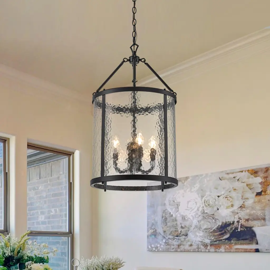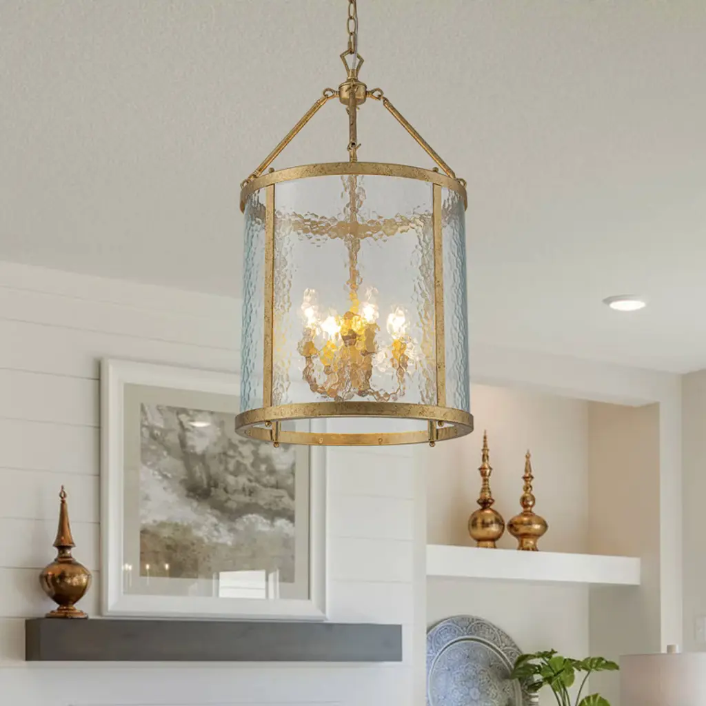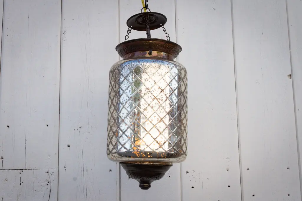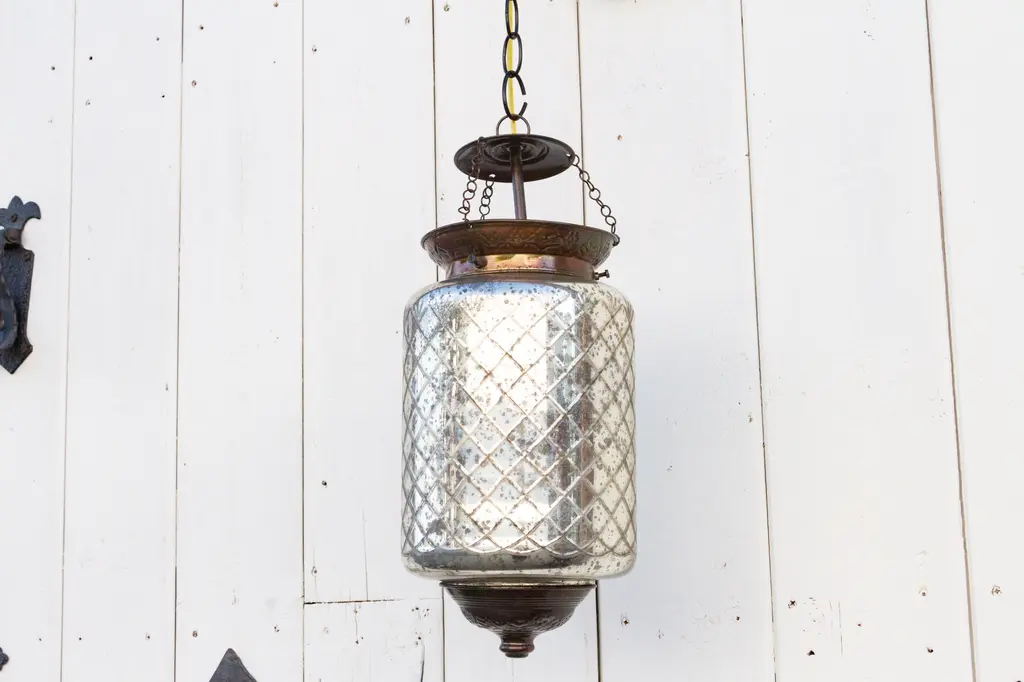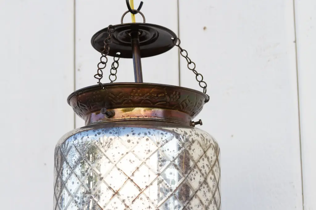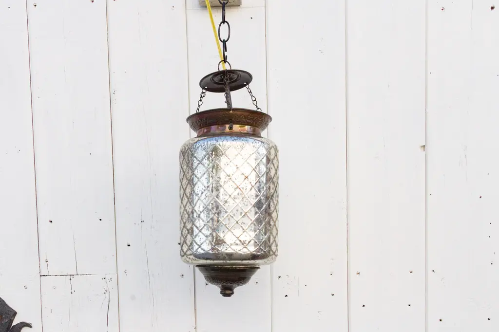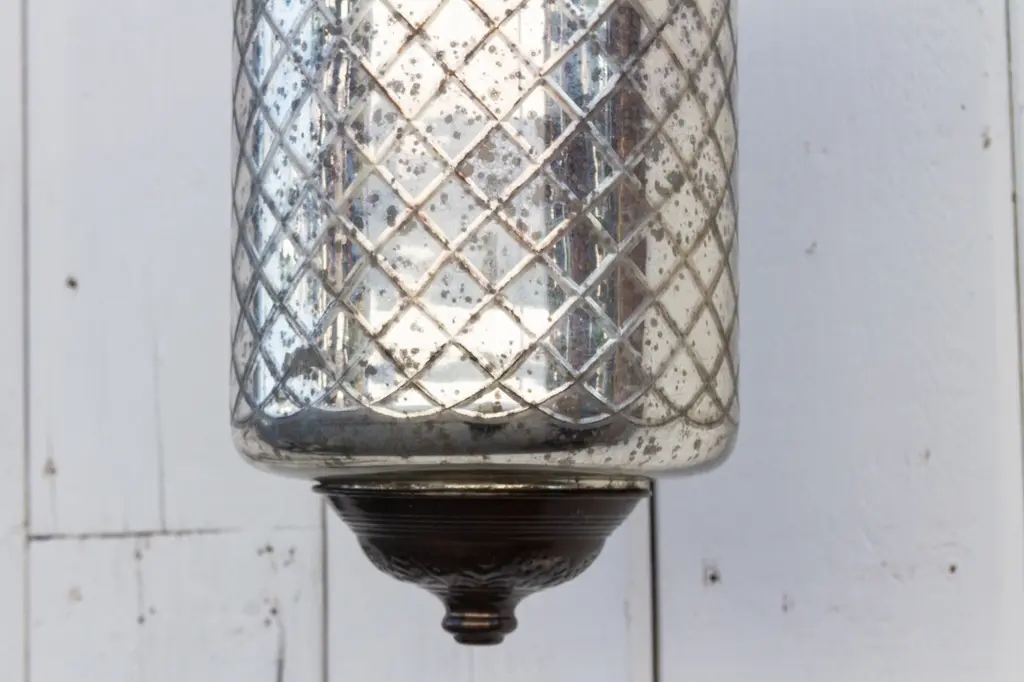 Lovely elegant silver glass lamp with a rounded cylinder shape. The glass has an antiqued silver distress look with cloudy or black marks. Please Note: Lantern does not come wired, light kit and bulb are not included.
