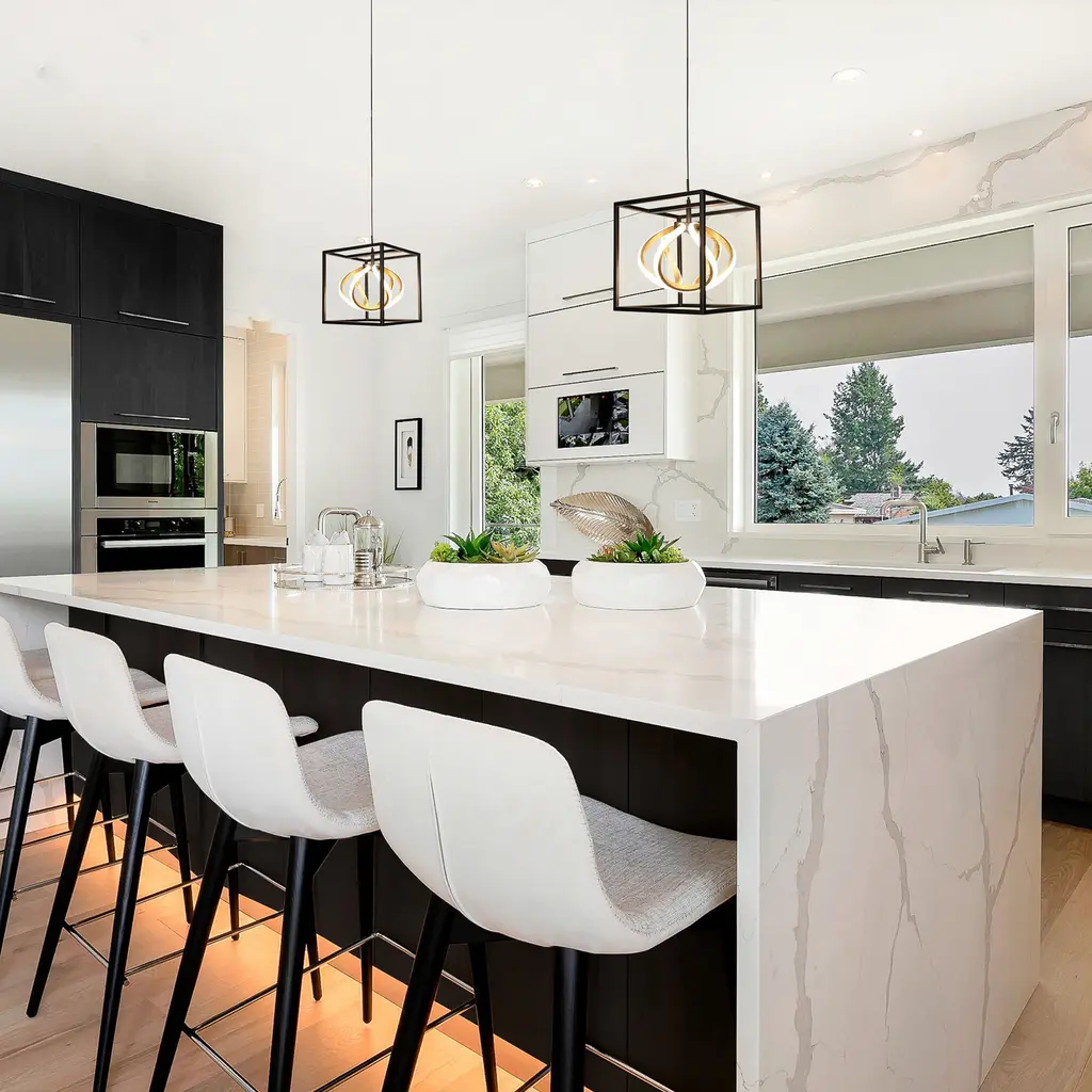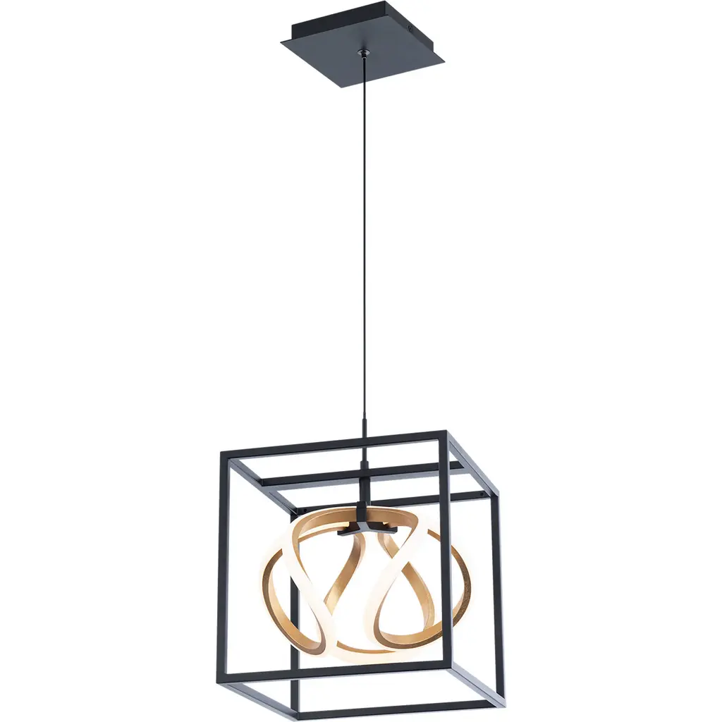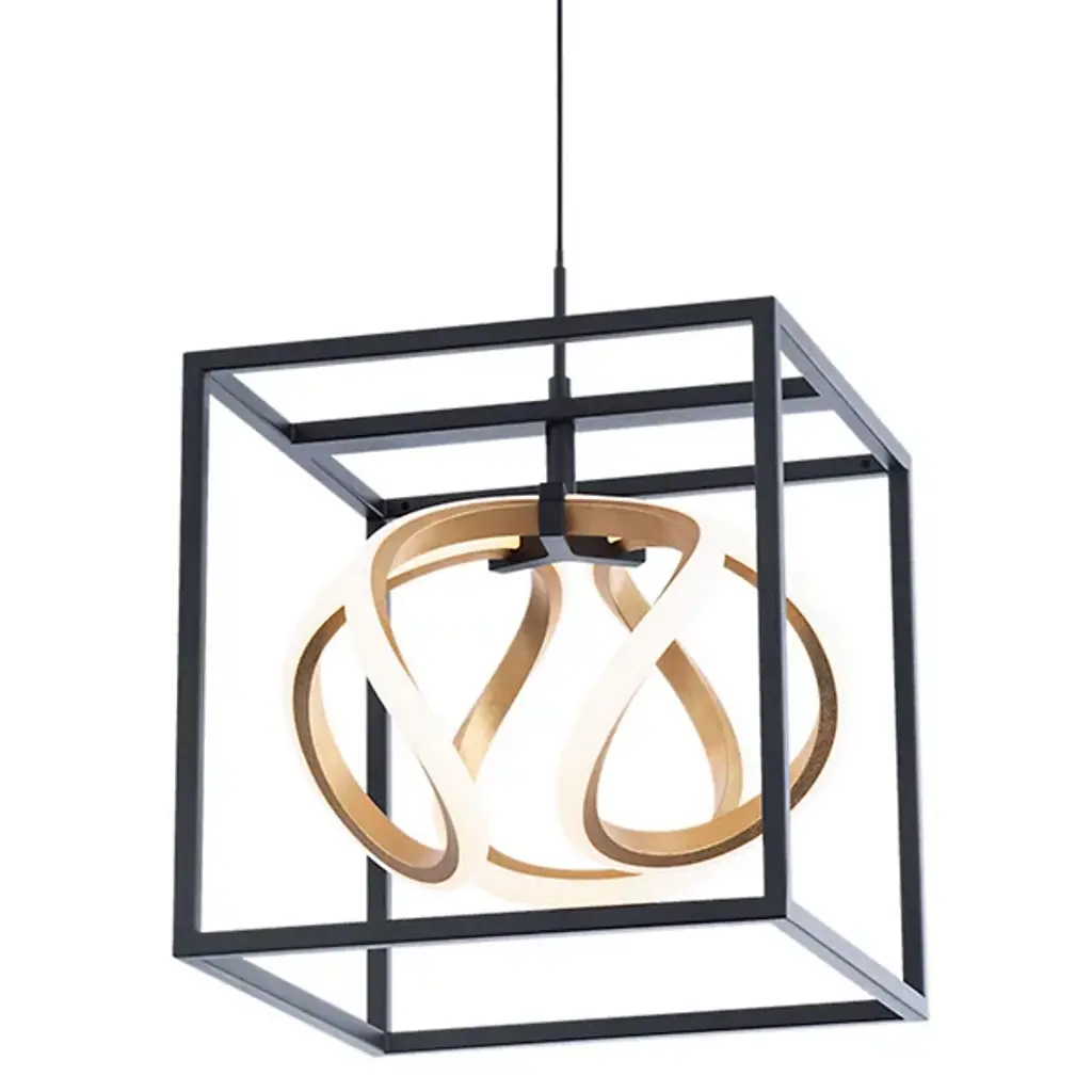 Eye-catching and elaborate. Sinclair features an omni directional illumination with a jaw-dropping motif. Three orbital rings are showcased within a stunning geometrical form. Add stylish architecture and gorgeous illumination to your space with the Sinclair LED luminaire from dweLED by WAC. This LED luminaire is available in a 42-inch linear pendant with a black finish and gold leaf metal inside each of the three decorative elements. A complementary 10-inch mini pendant is also available with a geometric frame and a single design element. Low profile adjustable powered aircraft cables offer an ultra-clean look. The thin, slide-on rectangular canopy design with minimal hardware conceals a 120-volt LED driver and may be mounted on a sloped or standard type of ceiling. This LED luminaire is dimmed with an Electronic Low Voltage or TRIAC dimmer. State of the art LEDS offer a crisp white 3000K color temperature with a high 90 color rendering index and a long 50,000 hour life. The Sinclair pendant uses just 44 watts and delivers over 2100 lumens. Mesmerizing and intriguing.