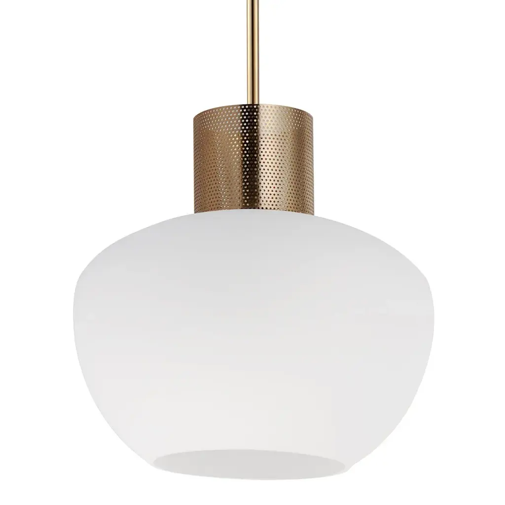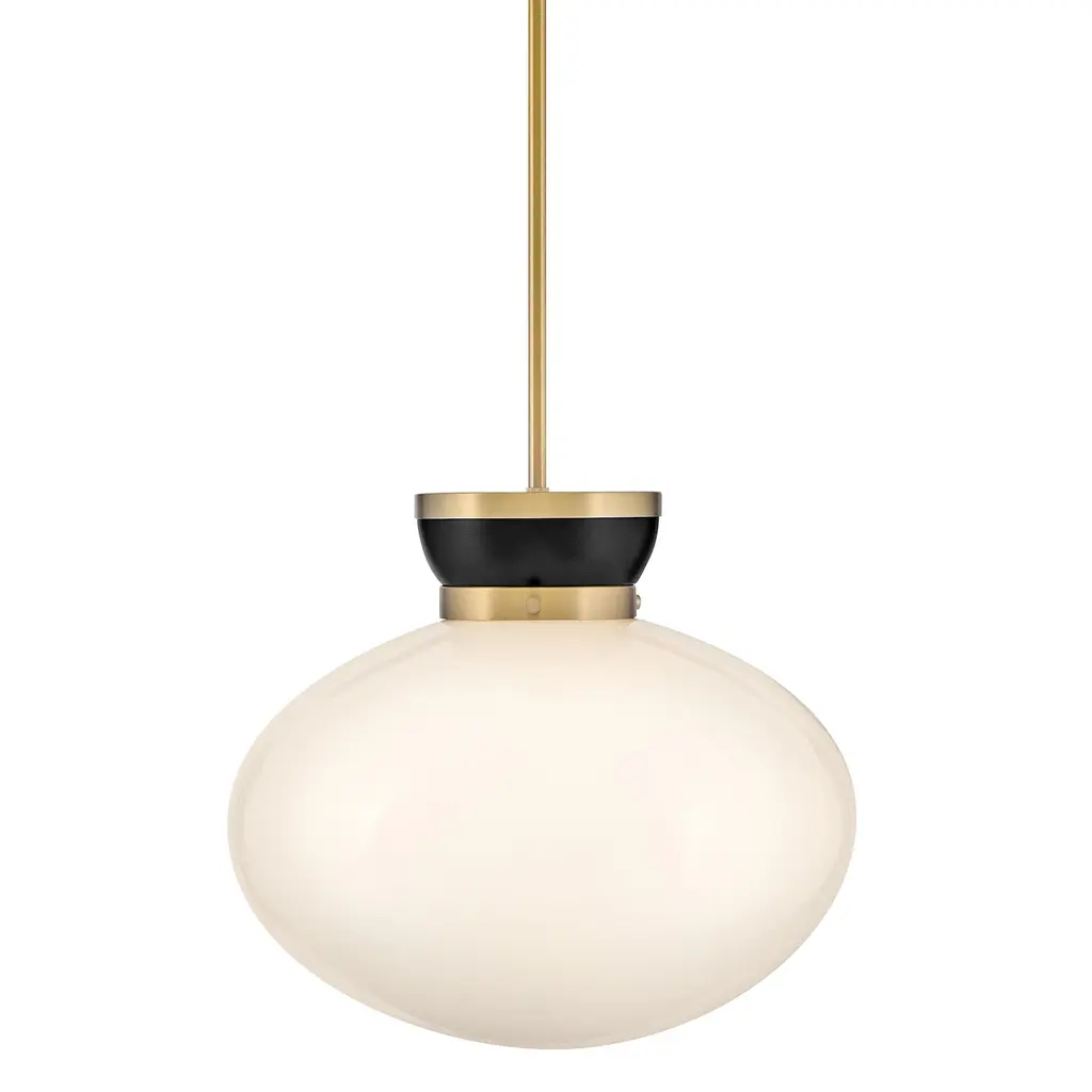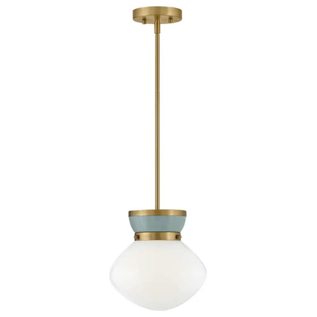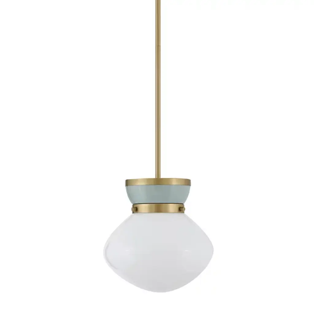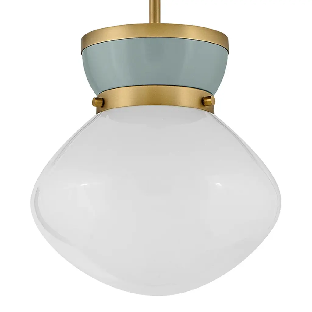 Ingomar is a petite beauty that packs a big punch. The curved lines and captivating color combinations are like a whirlwind romance with classic style. The schoolhouse's modern shade and bands of lacquered brass finish off the timeless love story with a softness that fits in any space or place.