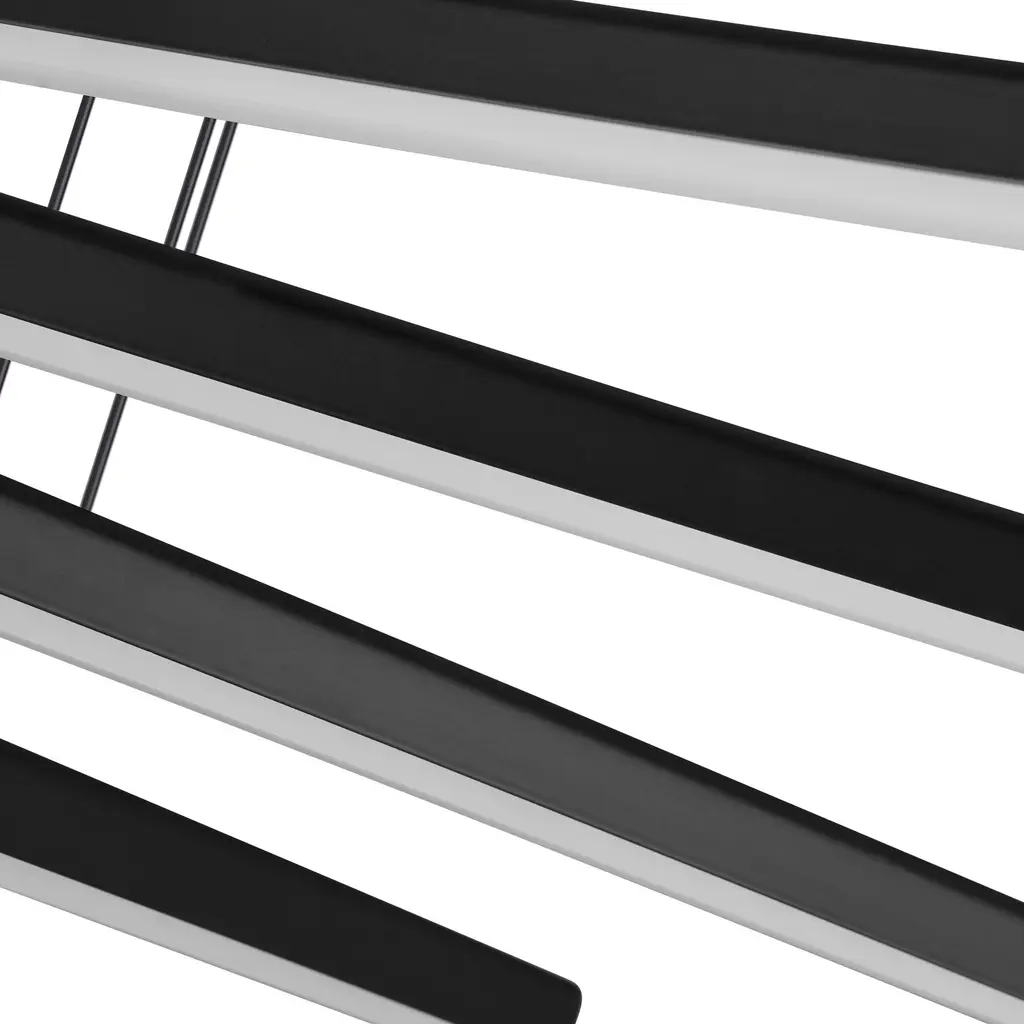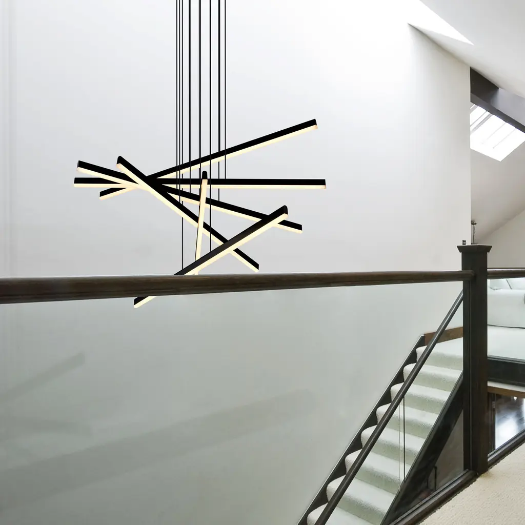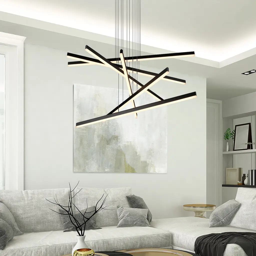 From VONN's Sirius Series, the VMP25060BL Integrated LED Pendant is a modern 32-inch fixture made from aluminum and acrylic, with a Black aluminum canopy and 6 Integrated LED Shades. The shades consist of 6 planks in Black finish Each plank positioning may be adjusted as per your design needs. Emitting a soft white ambient light at 3000 Kelvin, it offers adjustable height, dimmable functionality, and compatibility with sloped ceilings. With 2807.5 Lumens brightness, an energy-efficient power consumption of 93.88 Watts, and CRI 90, this pendant combines style and efficiency for versatile and customizable illumination.