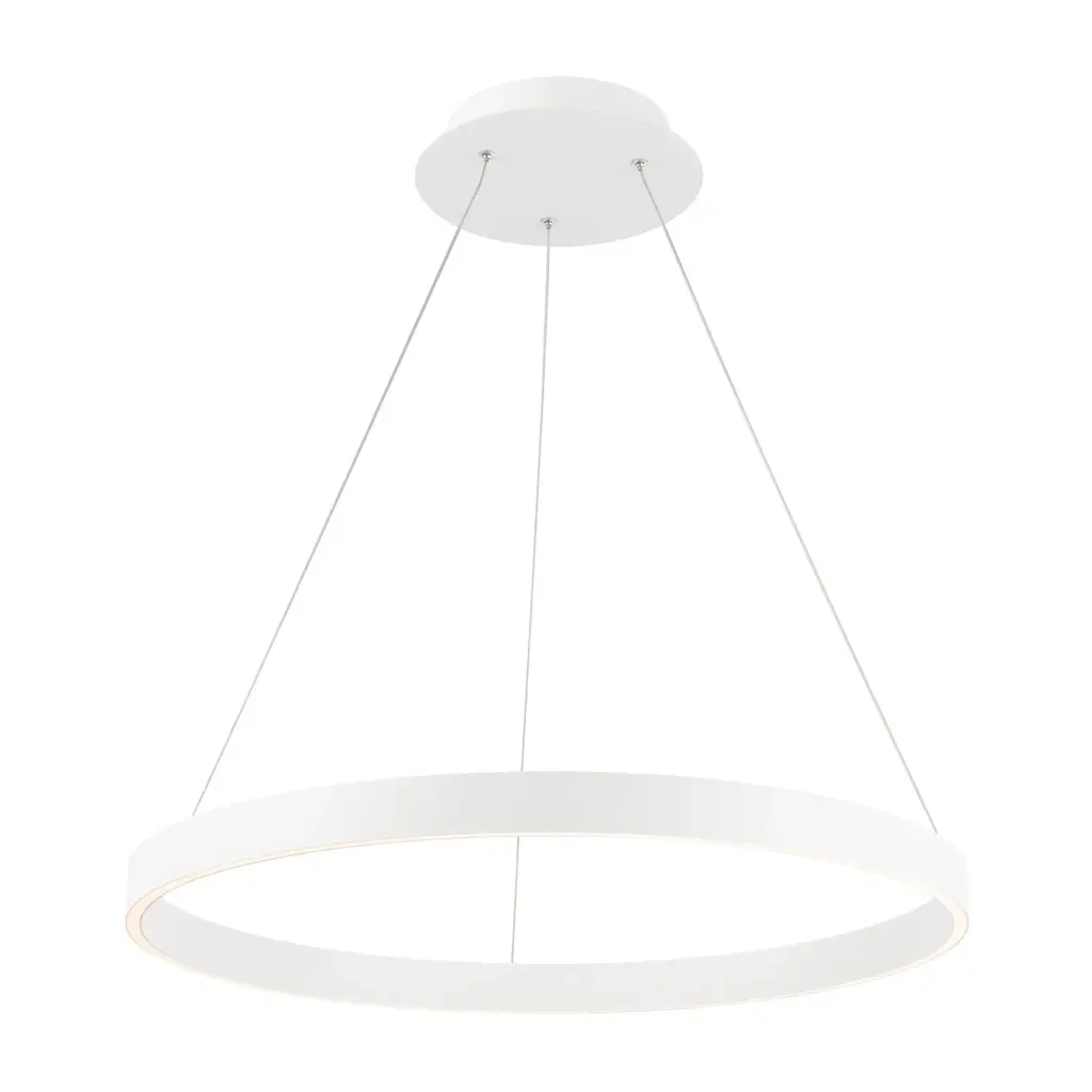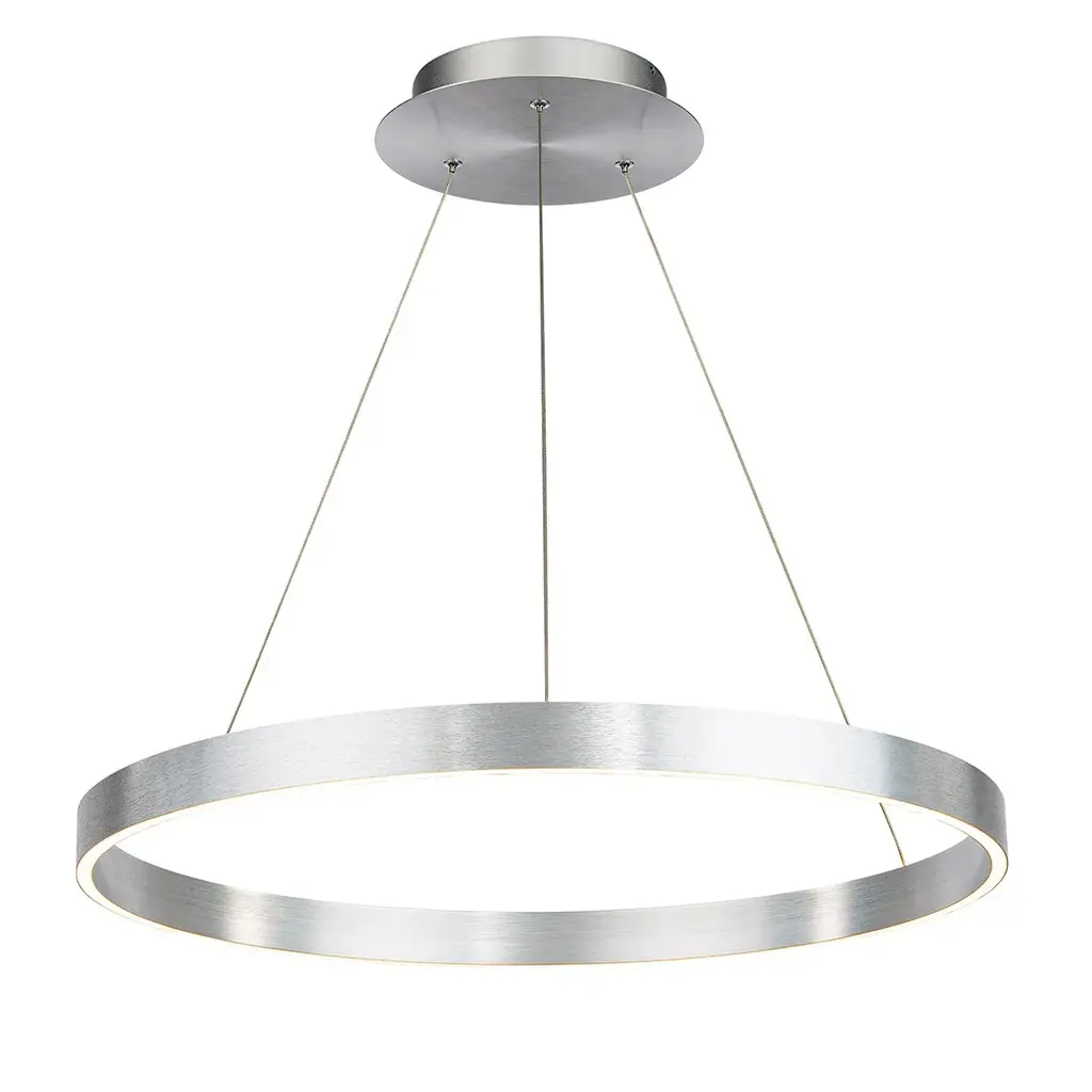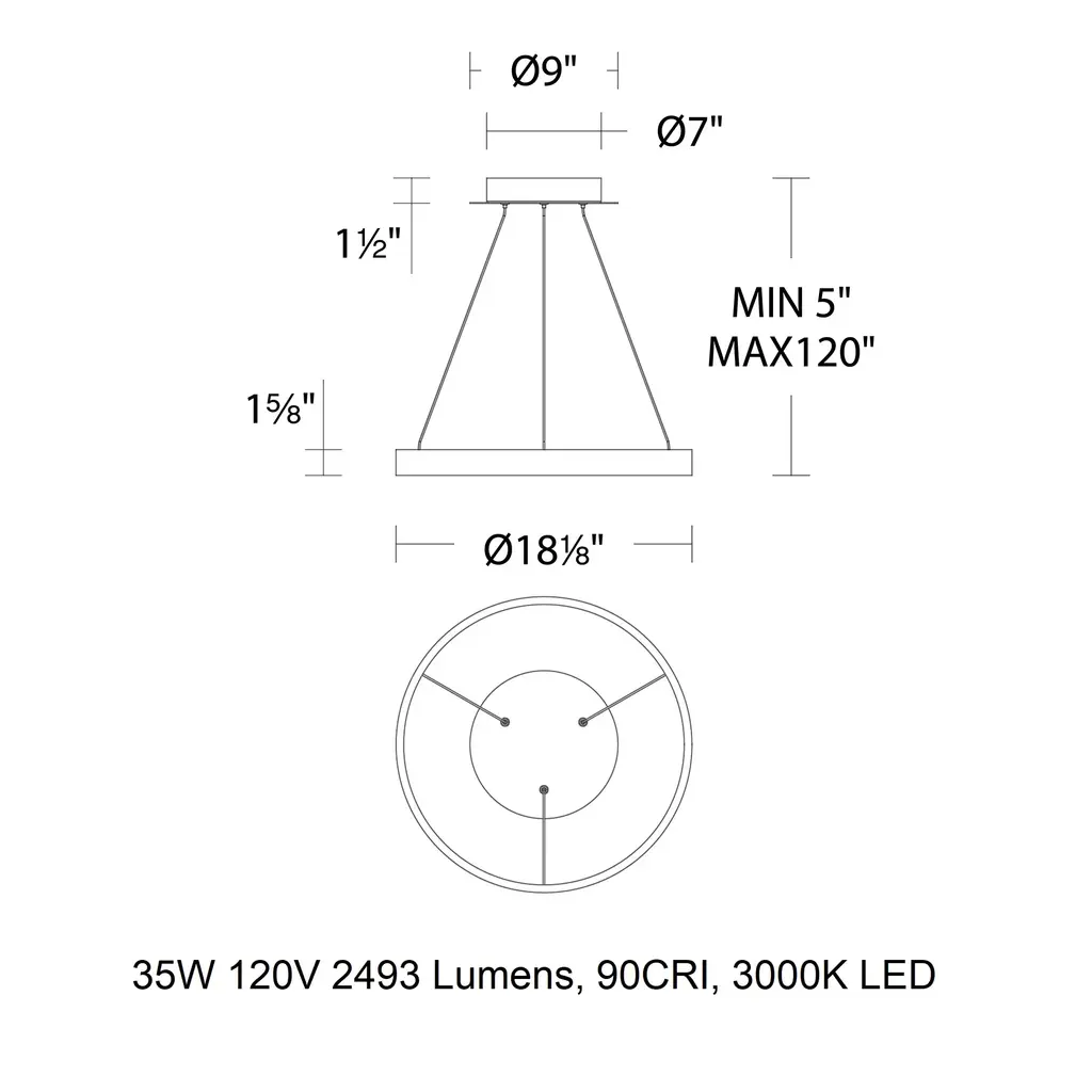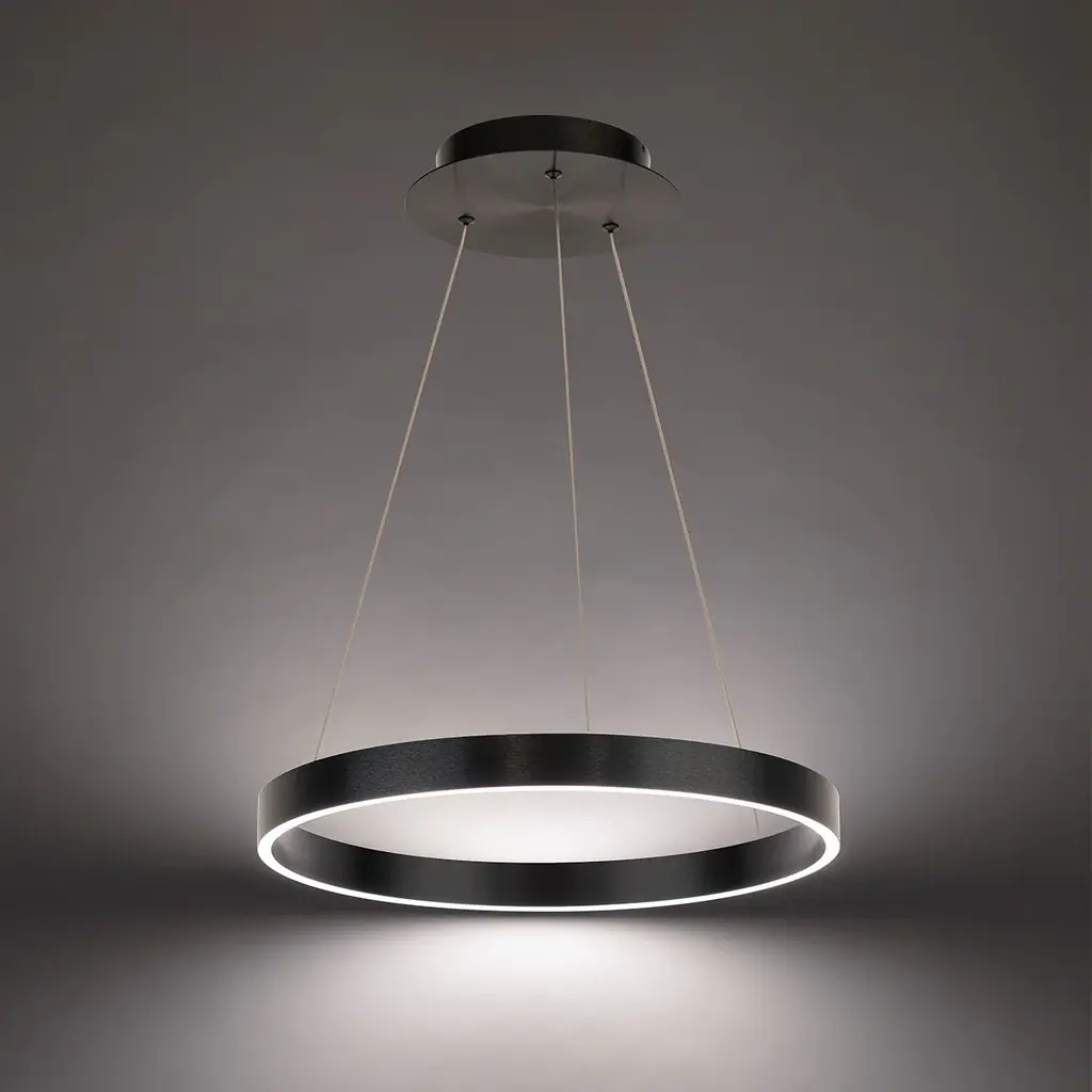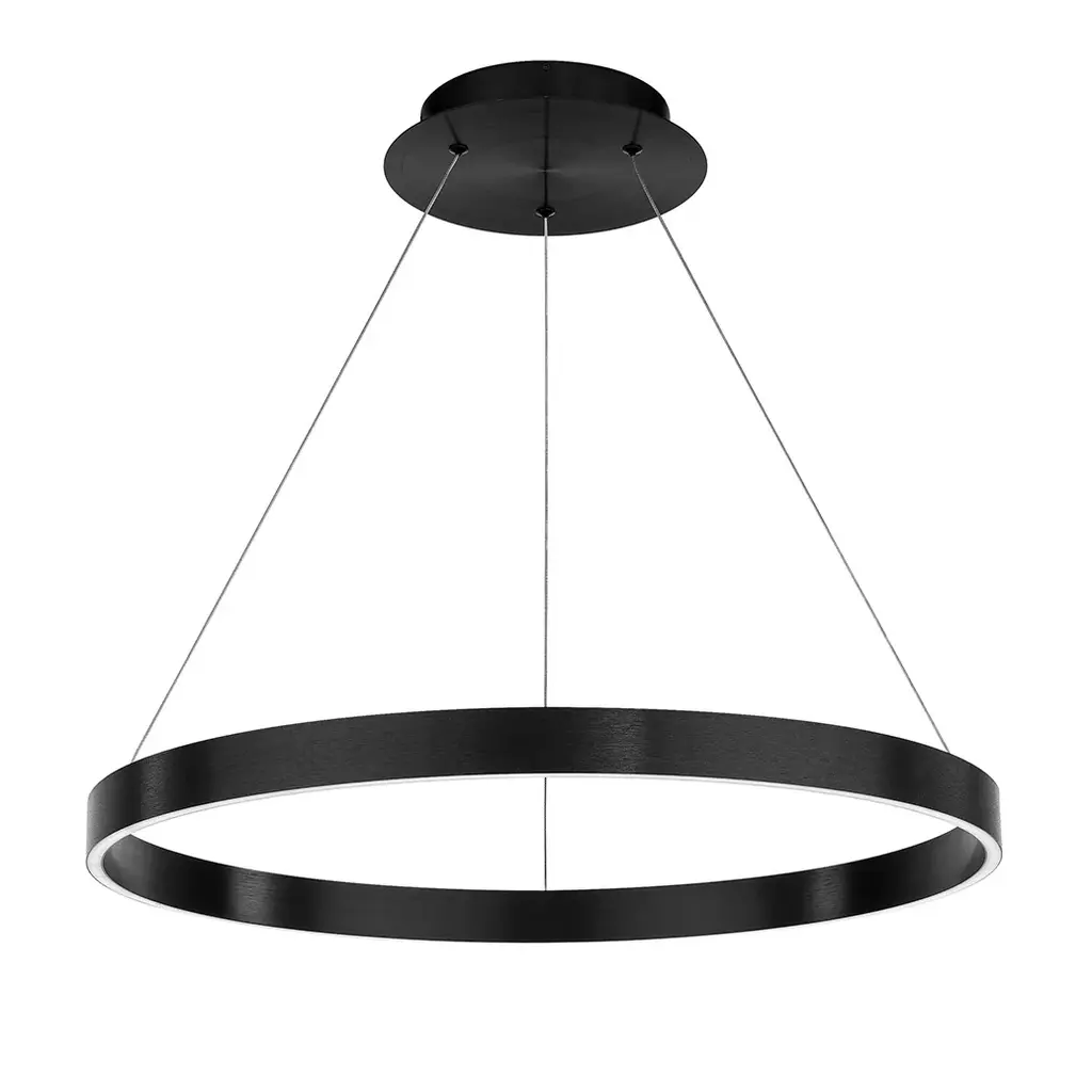 A halo of beautiful illumination. Embrace the curvaceous allure and ring in a new generation of LED designs and technologies with Sirius, a compact cylindrical pendant with a wide solid band. Housing both an up and down light diffuser for a unique and effective distribution of light, this 18-inch or 24-inch pendant is available in a black and aluminum finish. A pair of energy efficient integrated LED's concealed behind silicone diffusers run the edge of the top and bottom of the halo sending a bright, enchanting light up and down throughout your space. The low profile, adjustable powered aircraft cables allows you to suspend this luminaire to the perfect height. Full circle, Sirius is a glowing halo. Features
