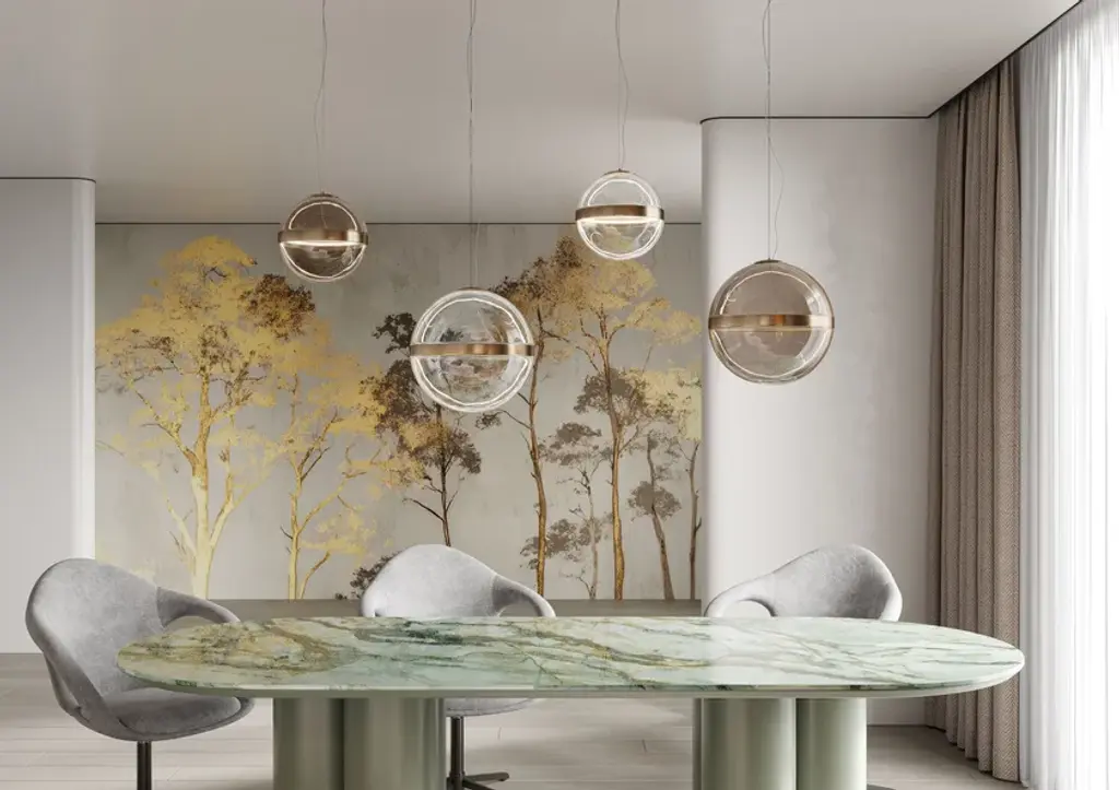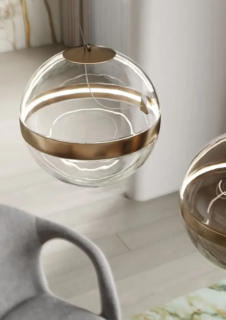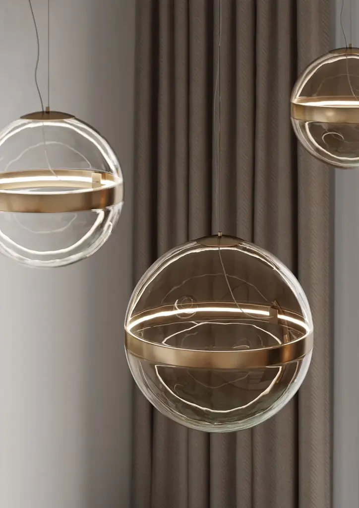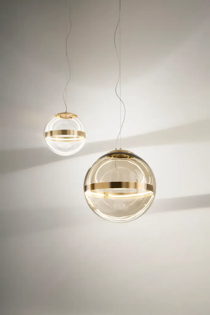 Sistema is a Murano glass chandelier.SS.1018/G/OS/T: Ø 350 mm, transparent glass sphere, brushed gold mounting, and white painted ceiling rose.SS.1018/G/OS/F: Ø 350 mm, smoke-colored glass sphere, brushed gold mounting, and white painted ceiling rose.SS.1018/M/OS/T: Ø 250 mm, transparent glass sphere, brushed gold mounting, and white painted ceiling rose.SS.1018/M/OS/F: Ø 250 mm, smoke-colored glass sphere, brushed gold mounting, and white painted ceiling rose.The essence of the collection, however, lies in its unconventional construction and the refined combination of materials. A Murano blown glass sphere is illuminated from within, creating a magical atmosphere with a play of reflections and shadows.