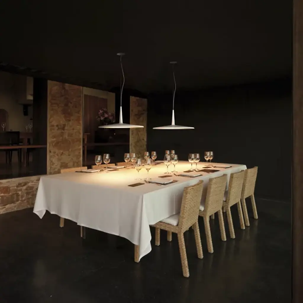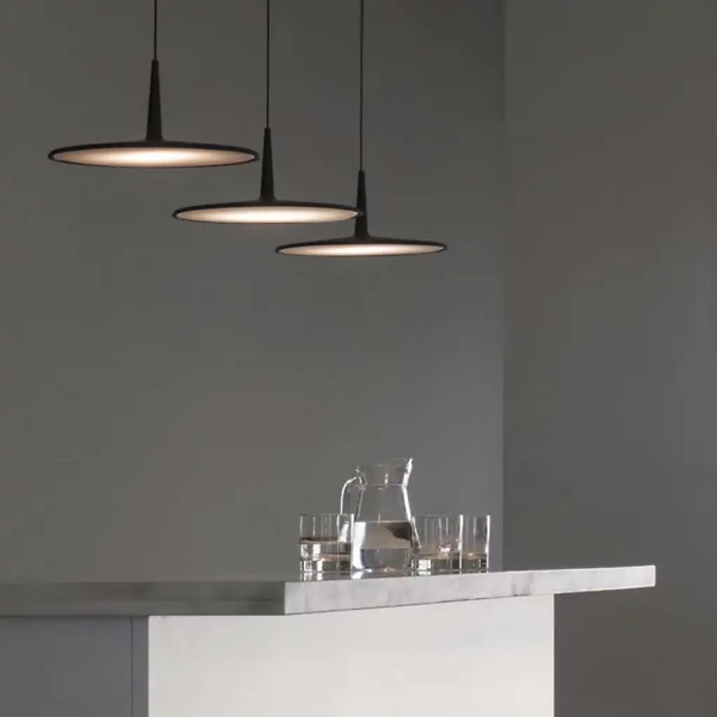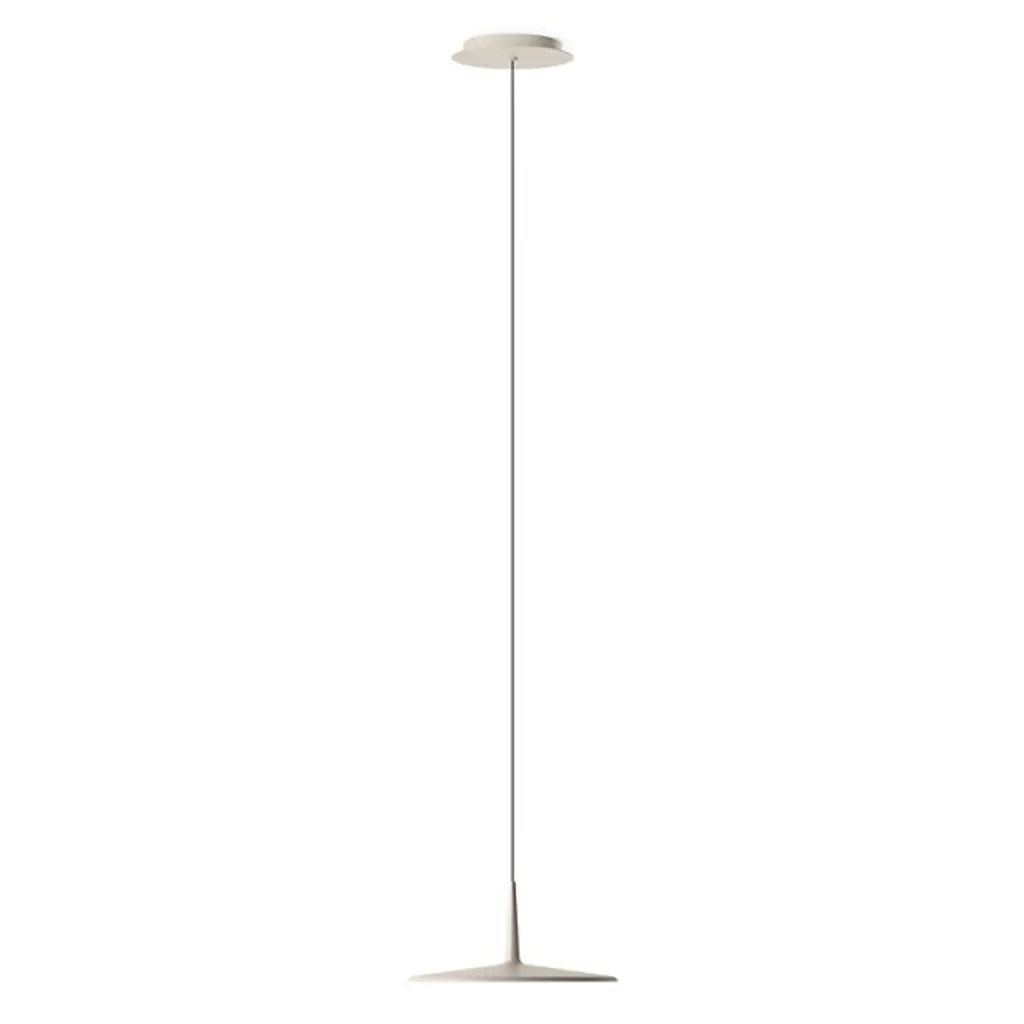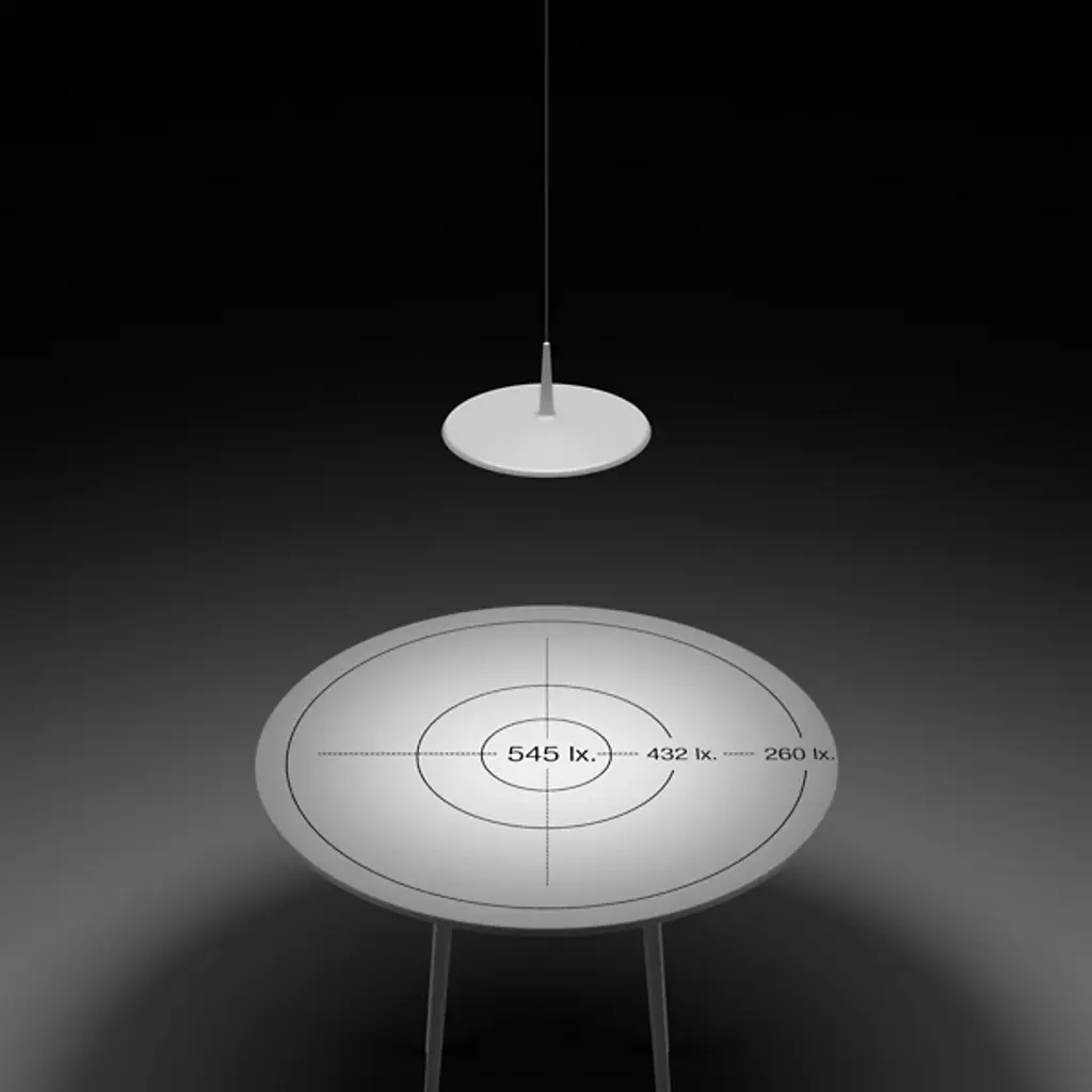 Pure design that really shines. The minimalist form of the Vibia Skan Pendant makes it ideal for accentuating contemporary spaces. It also enables a uniquely broad and bright wash of downlight as, instead of a flat disc, the bottom diffuser tapers inward at the center to surround the LED within. No light is wasted as it's evenly diffused all the way out to the very edge of the pendant.