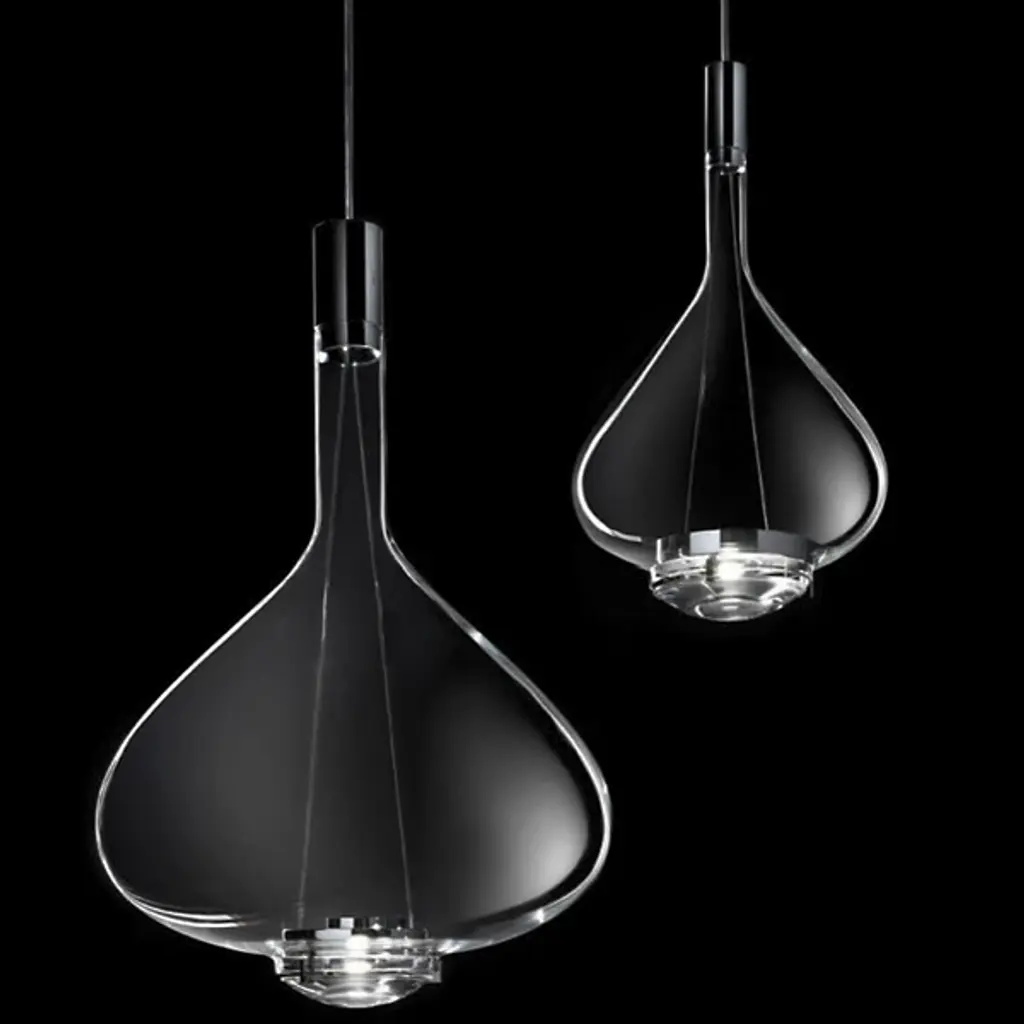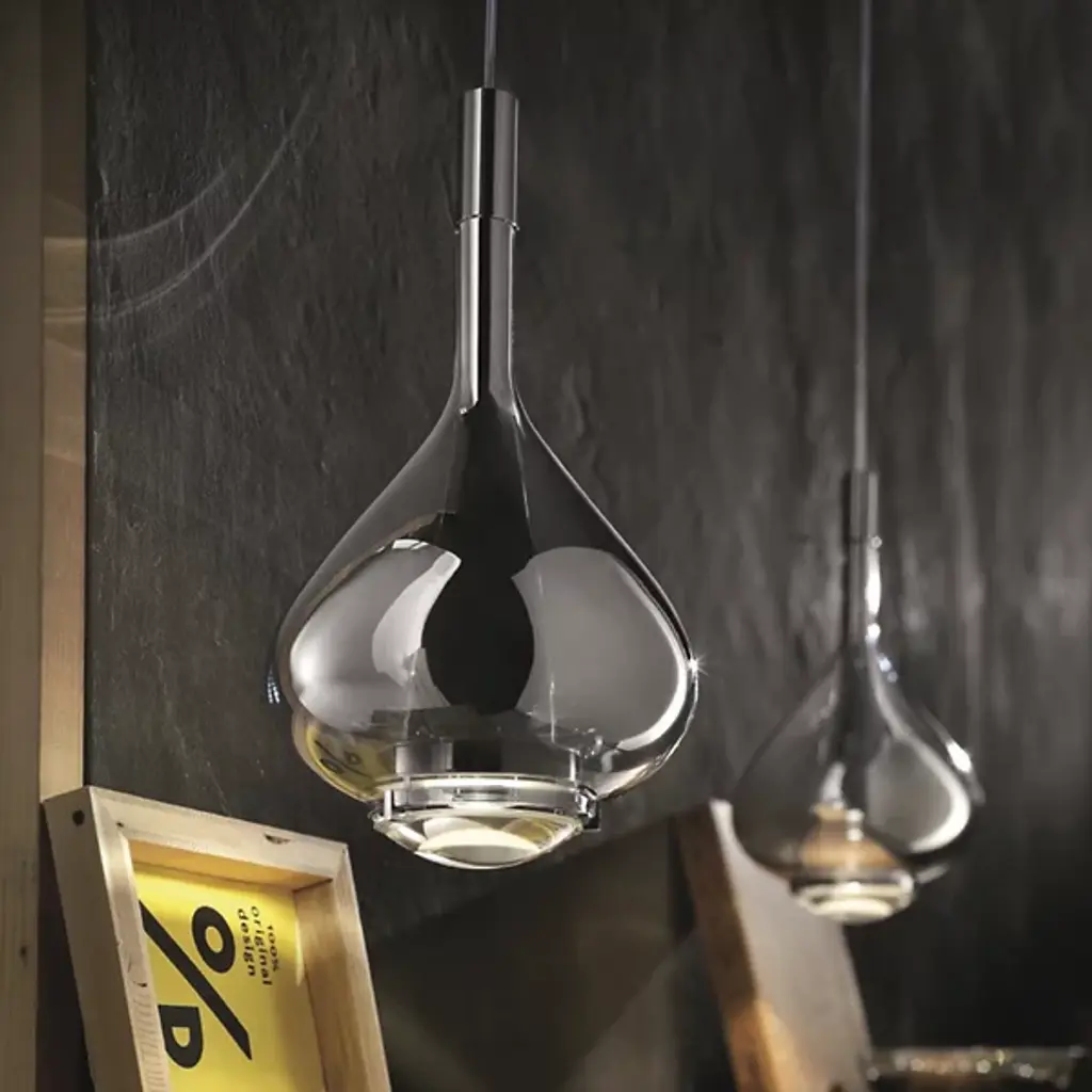 The LODES Sky Fall LED Pendant is a sumptuous display of hand-blown Murano glass with direct and indirect light. The teardrop shape is filled with warm LED light, only to be filtered at the bottom through a thicker lens of rounded glass, creating an interesting play of magnified light. The glass is either left clear or given a metallic finish, adding a unique reflective quality to the fixture.