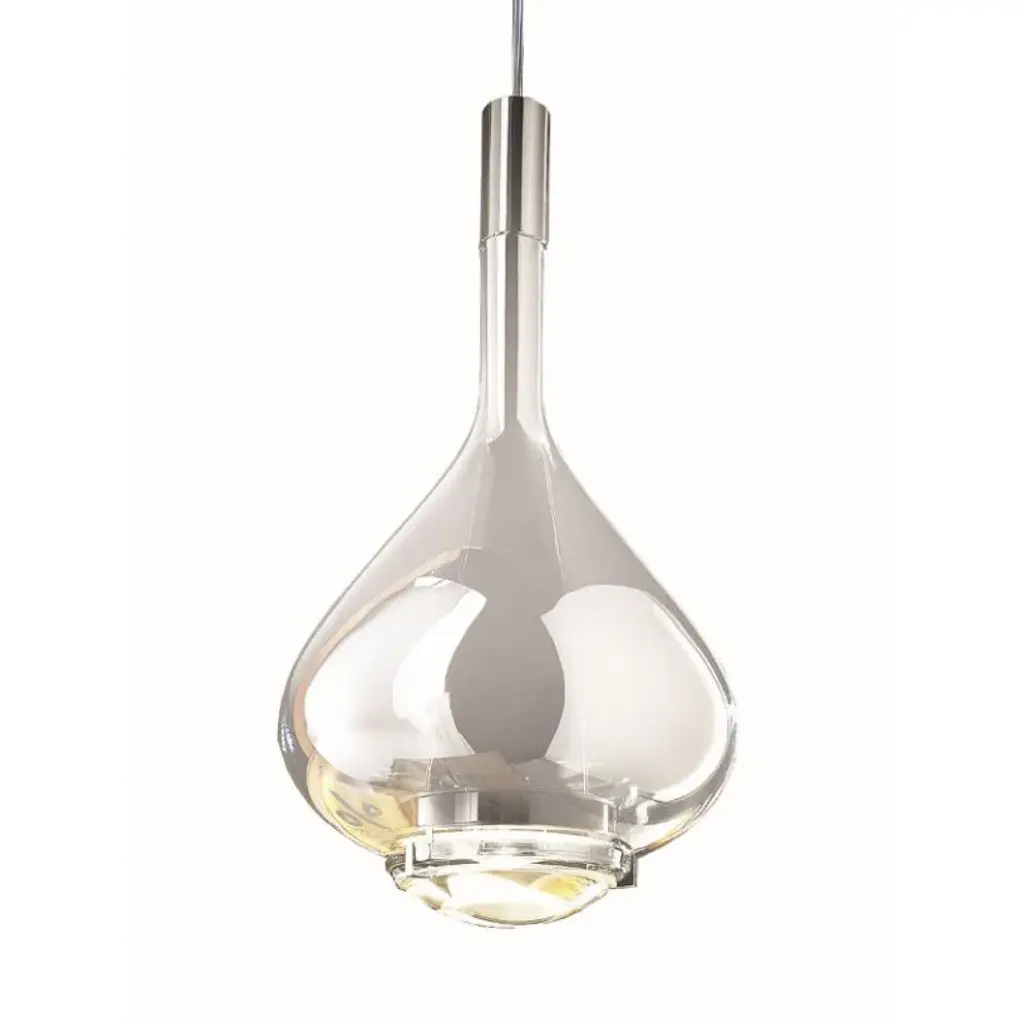 The sky-fall pendant is an elegant piece that marries ancient Murano Glass with innovative led technology in a timeless fashion. Mounted to the ceiling by a dome-shaped canopy, the diffuser of this modern pendant light is handmade and available in the following finishes: crystal, glossy copper metalized and boasts a pure, shapely form. The two led light sources provide both direct as well as indirect light. Two vertical filaments are visible through the clear glass inside the diffuser. Features