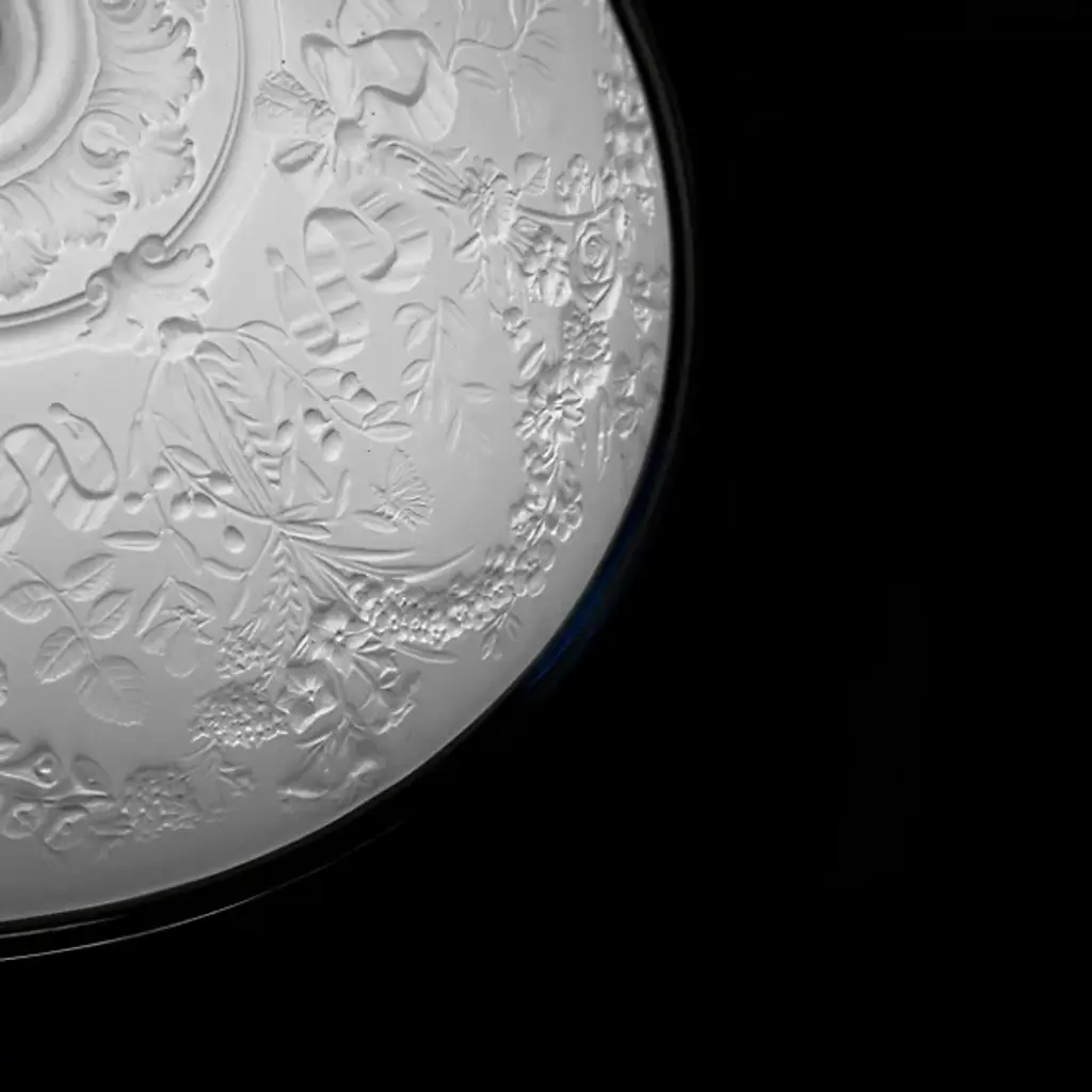 The Skygarden Pendant Light is a surprise with a spectacular white plaster floral decoration that is reminiscent of the relief ceilings of centuries gone by. It is a suspension lamp that becomes a decorative element when looking upwards. The light is diffused by an inner glass with further embellishment provided by the aluminum filigree detail.Skygarden offers diffused lighting from its hemispherical, cast plaster diffuser, painted white inside. The interior frieze is photo-etched and mechanically drawn in AISI 304 steel.