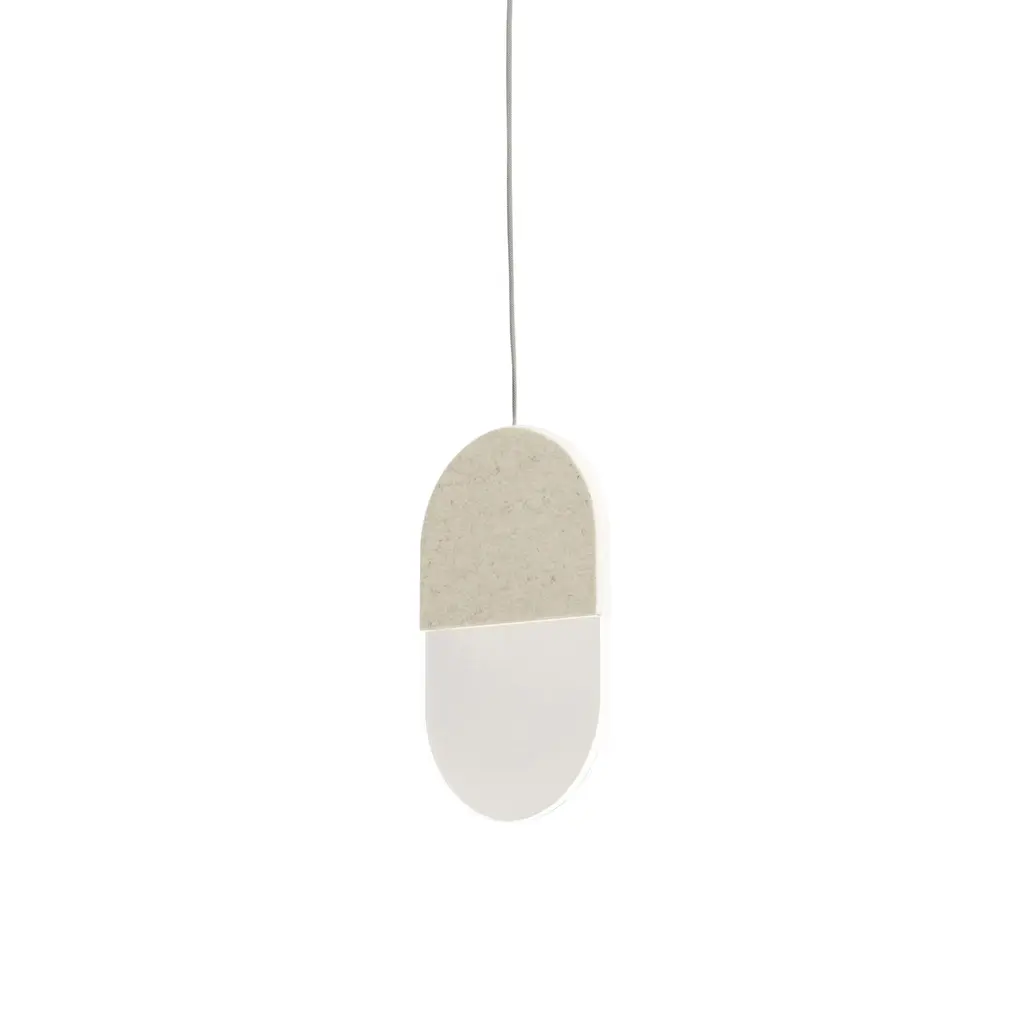 As either a height-adjustable single pendant or a multiple, the P20 is the smallest model in the Slab lighting series, enveloped in 100 percent industrial-grade Merino wool felt. By absorbing sound waves, the fixture helps reduce acoustic ambient noise in any interior environment. The illuminated portion is available in both warm and neutral white that provide an ambient glow when illuminated and appears as clear when turned off.