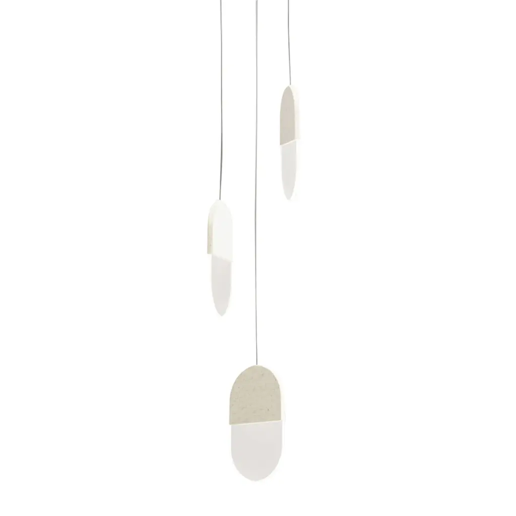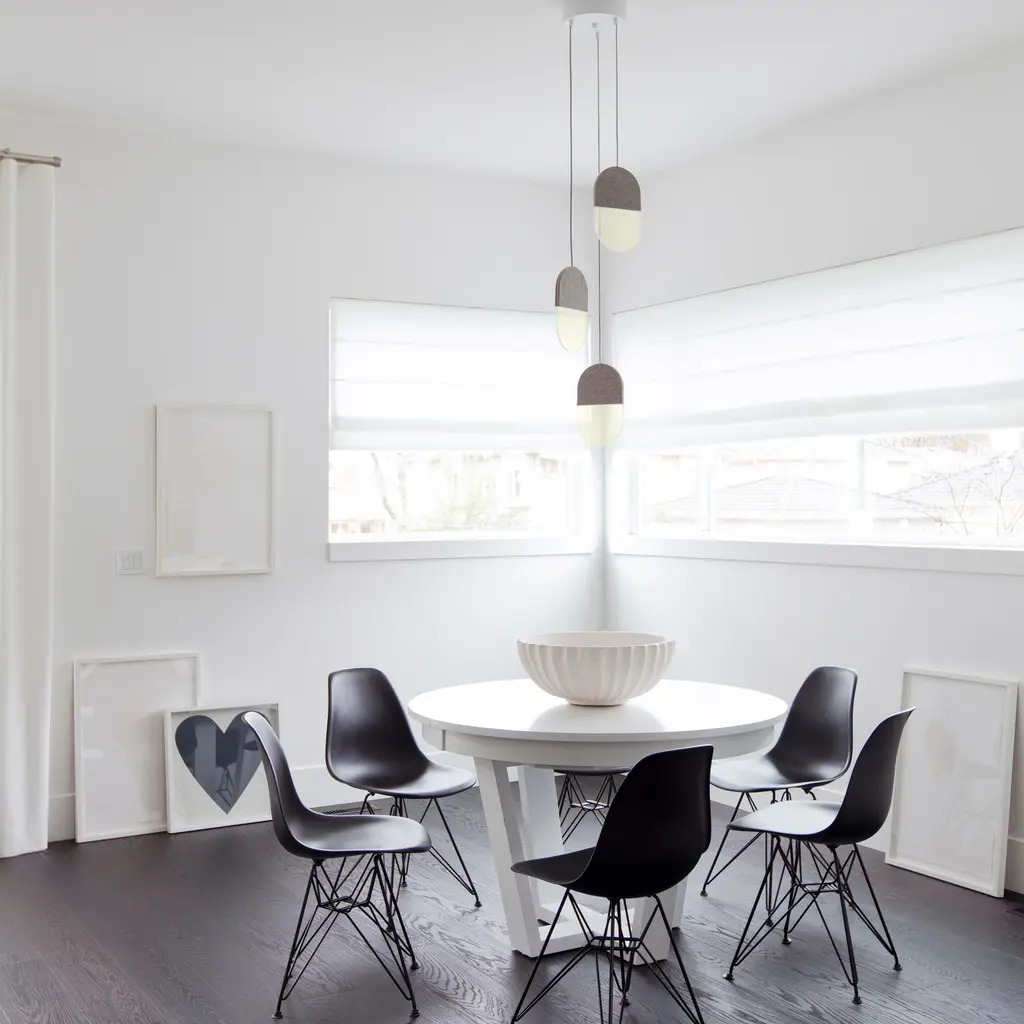 As either a height-adjustable single pendant or a multiple, the P20 is the smallest model in the Slab lighting series, enveloped in 100 percent industrial-grade Merino wool felt. By absorbing sound waves, the fixture helps reduce acoustic ambient noise in any interior environment. The illuminated portion is available in both warm and neutral white that provide an ambient glow when illuminated and appears as clear when turned off.