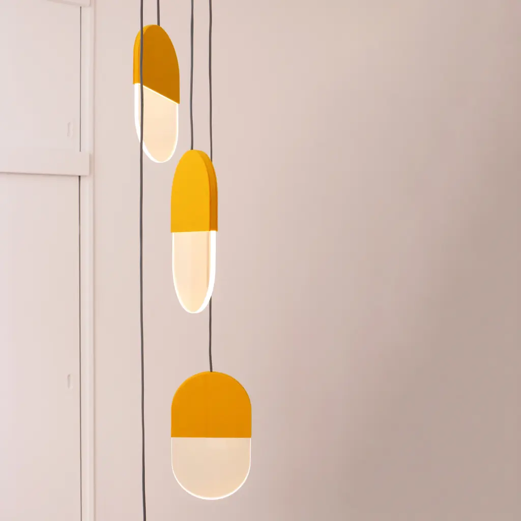 As either a height-adjustable single pendant or a multiple, the P20 is the smallest model in the Slab lighting series, enveloped in 100 percent industrial-grade Merino wool felt. By absorbing sound waves, the fixture helps reduce acoustic ambient noise in any interior environment. The illuminated portion is available in both warm and neutral white that provide an ambient glow when illuminated and appears as clear when turned off.