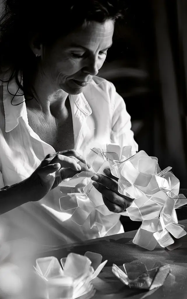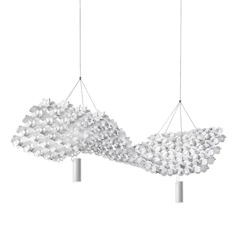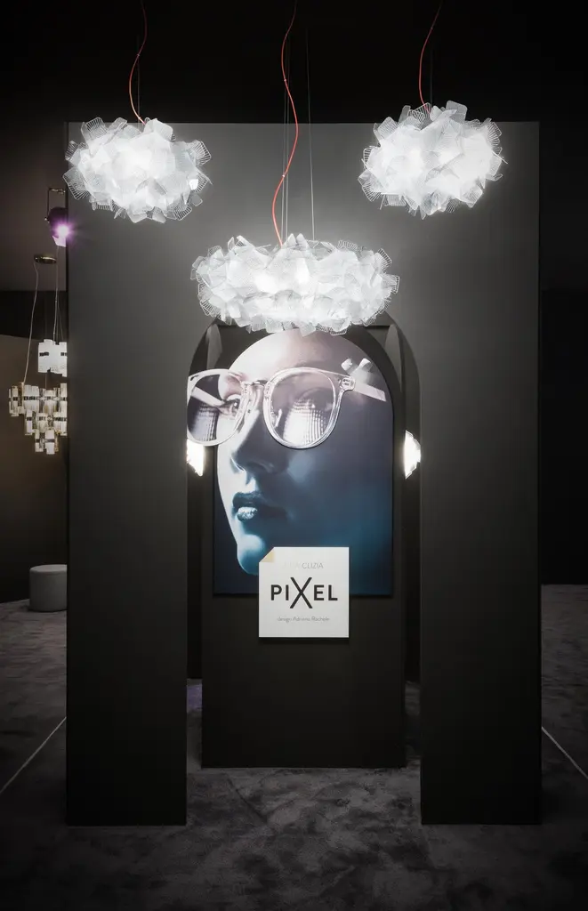 What would happen if a Greek nymph was suddenly transported to the digital age? Slamp’s Clizia collection is covered in pixels! A high-tech pattern in soft tones spread across the lamp’s supple shapes. The cheeky and creative red cable can be replaced by a transparent one upon request. A dusting of white inside the decorative elements helps evenly distribute the light without glare. Available in two sizes, as well as ceiling and applique.Size: Ø 78 cm x H 28 cm / Ø 30-3/4” x H 11” maximum cable length 140 cm / 55”Colors: PixelMaterials: CristalflexWith: Magnetic system red wrapped electric wire available also with transparent cableLight source: Bulbs E27: 4 x 12W LED filament.