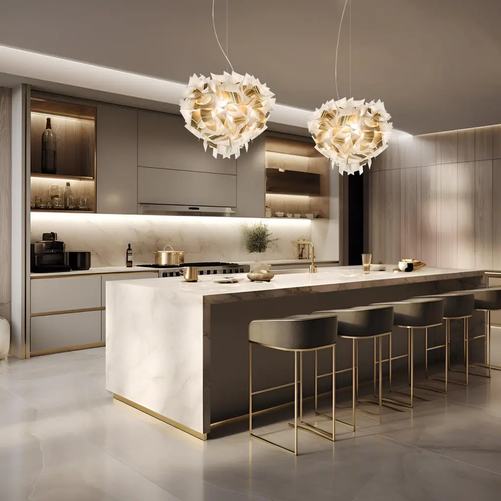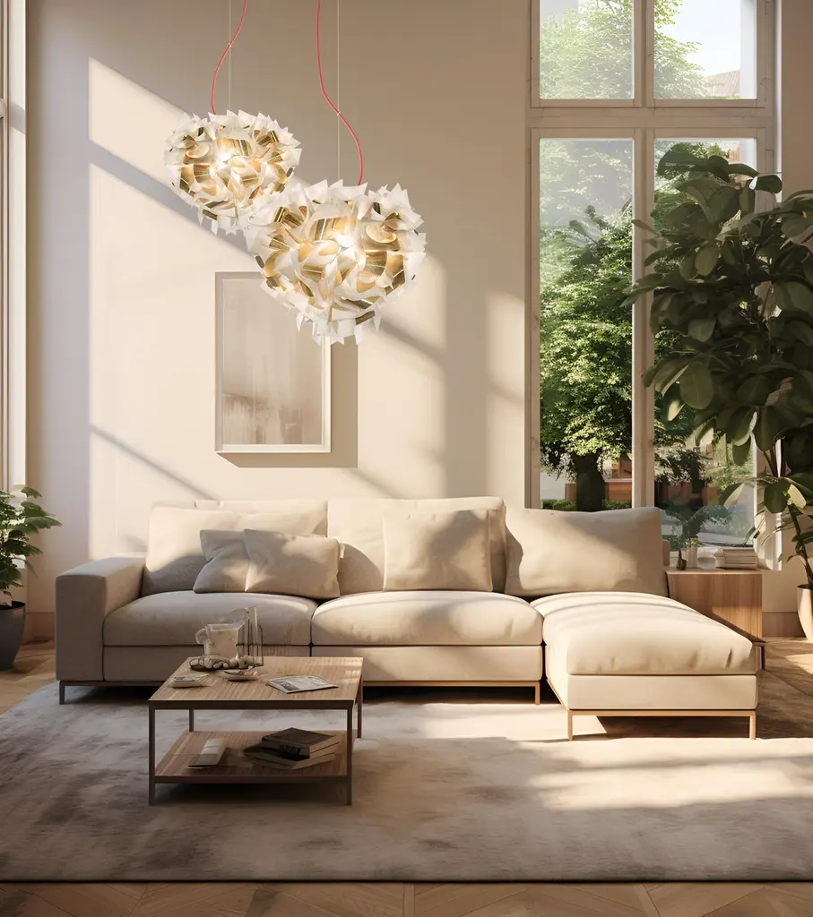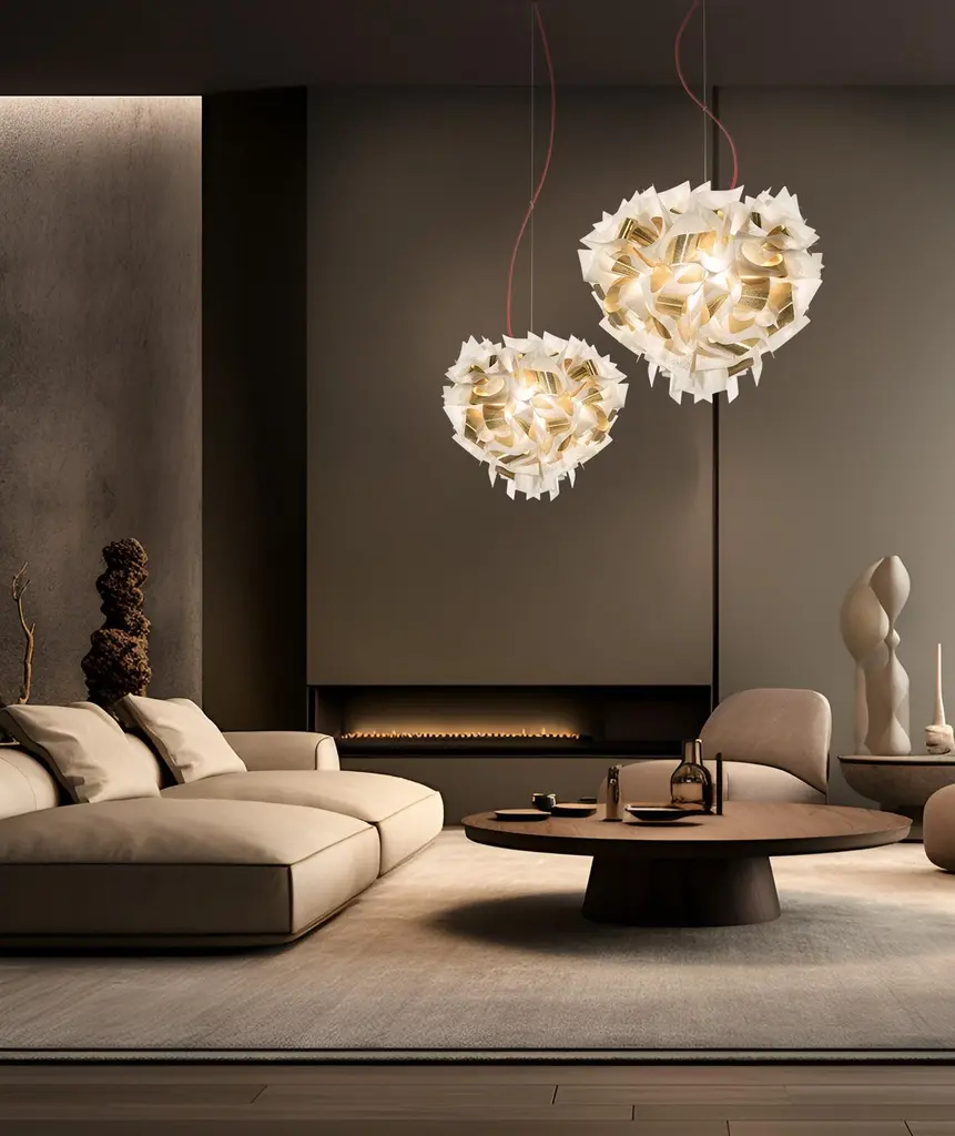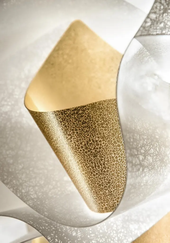 In a time where in the middle of this frenetic life, getting in touch with nature is a luxury, Veli Foliage Suspension Lamp brings something fresh to domestic spaces.Over 268 handcrafted bends and folds make up every piece in the collection; Foliage is a union of Veli’s soft, sartorial features and the perfection of the natural world.The above information, also provided in the Technical Data Sheet, refers to electrical standards with a voltage of 110-220V.The electrical installation components and other accessories may vary depending on the regulations of different countries; please contact us for more information.Size: Ø60 x h 50 cm Cord length: min 20 - max 140 cmColors: White/GoldCord color: TransparentMaterials: Opalflex® - Lentiflex® with cold foilLighting: 4 X 12W E27 LED Filament Bulbs - recommended 3000 KelvinWeight: 2,4 kgDimmerabile: with dimmable bulbs, depending on wall dimmer