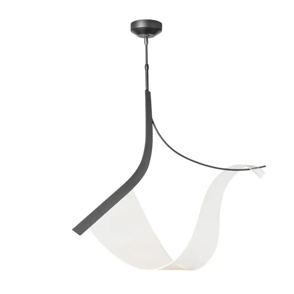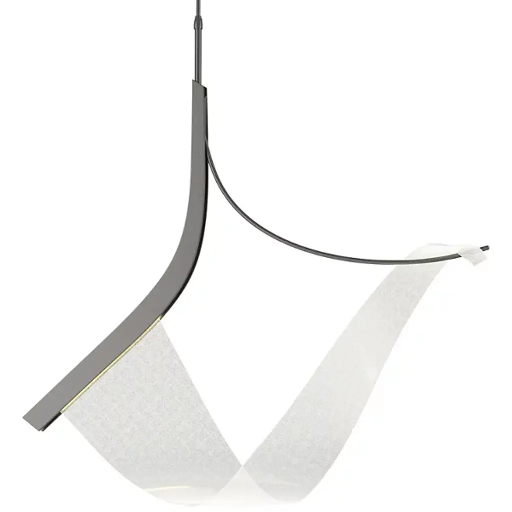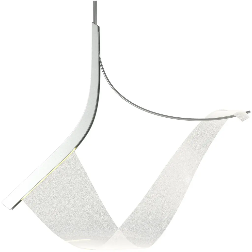 The Sling LED Pendant by Hubbardton Forge brings poetic charm to the modern home. This highly elegant fixture begins at a domed canopy that drops a slender steel arm, gently curving outward as it descends. A flowing ribbon made of clear acrylic hangs from the arm and gracefully swoops upward to rest on a secondary arm. A concealed LED light strip along the ribbon’s base sends light into the piece, creating an expressive luminaire and artful interior accent.