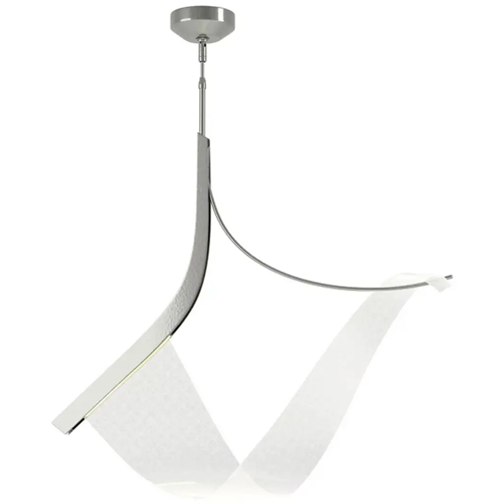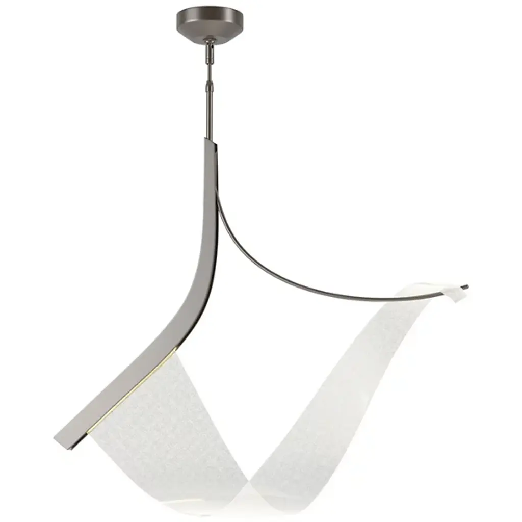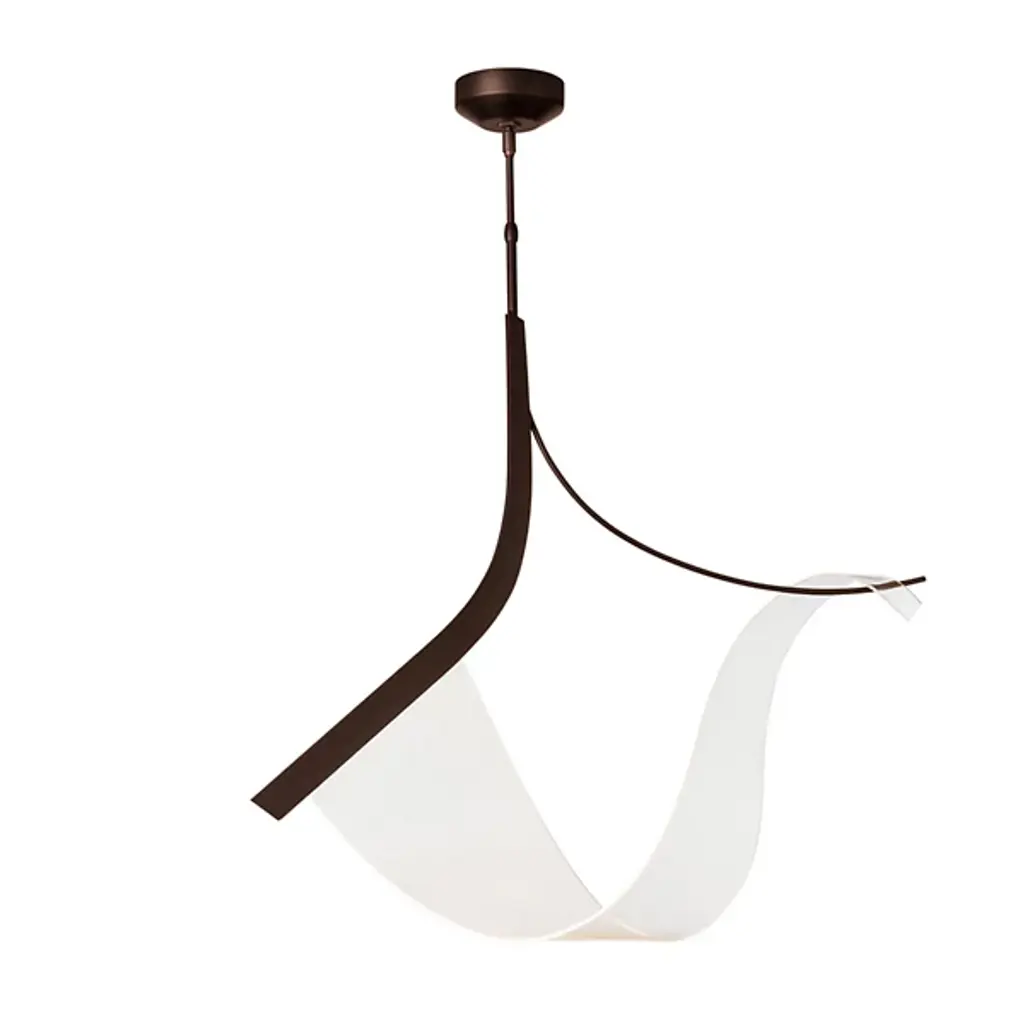The Sling LED Pendant by Hubbardton Forge brings poetic charm to the modern home. This highly elegant fixture begins at a domed canopy that drops a slender steel arm, gently curving outward as it descends. A flowing ribbon made of clear acrylic hangs from the arm and gracefully swoops upward to rest on a secondary arm. A concealed LED light strip along the ribbon’s base sends light into the piece, creating an expressive luminaire and artful interior accent.