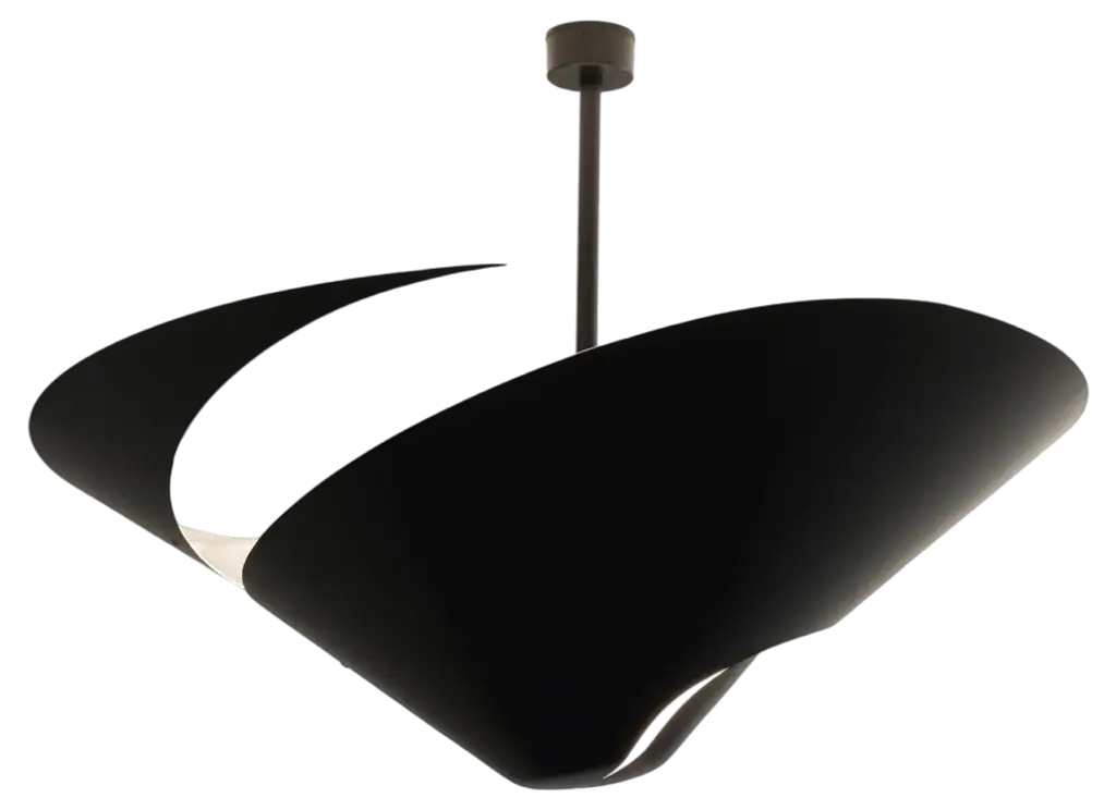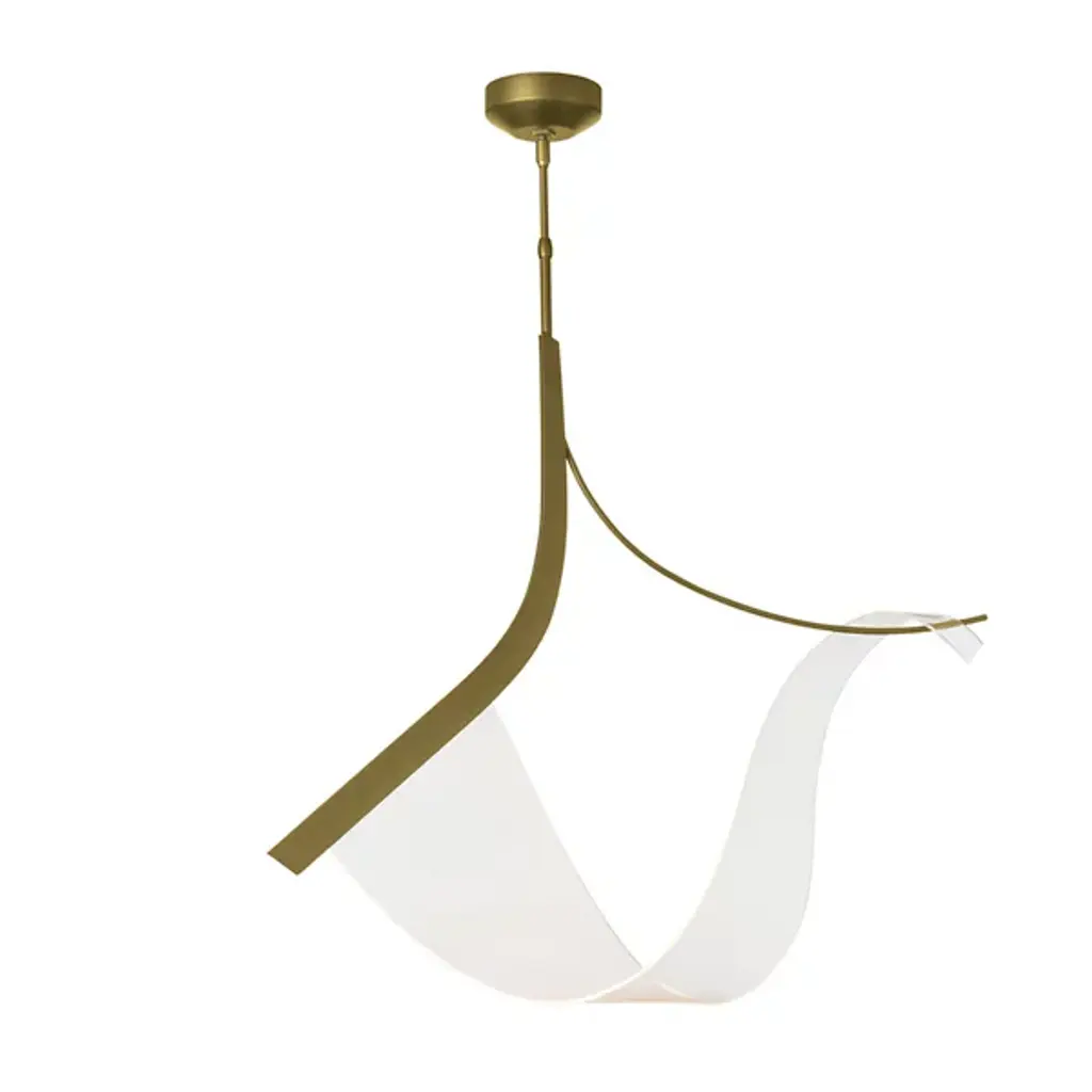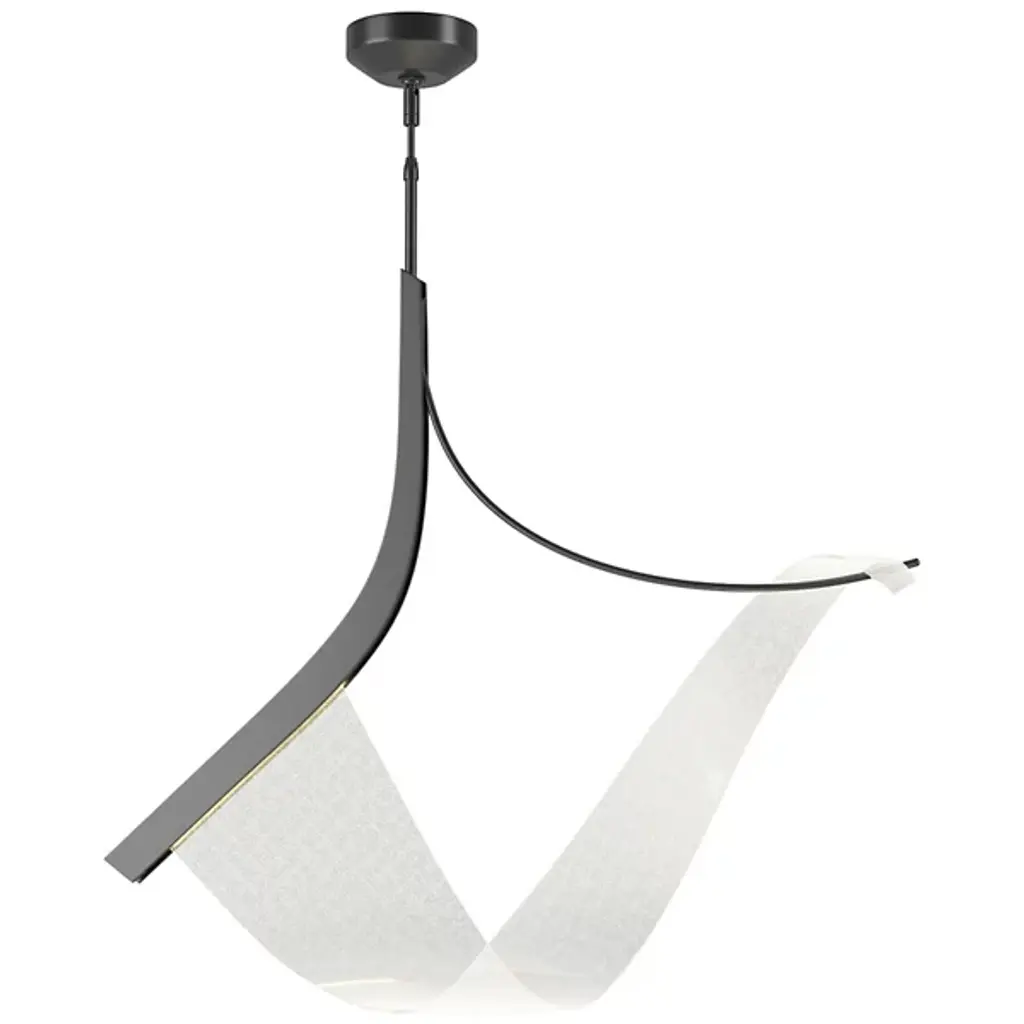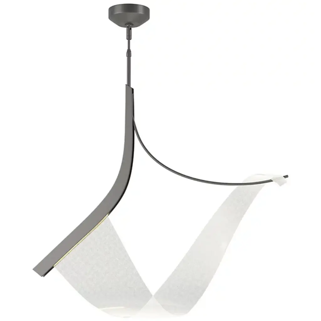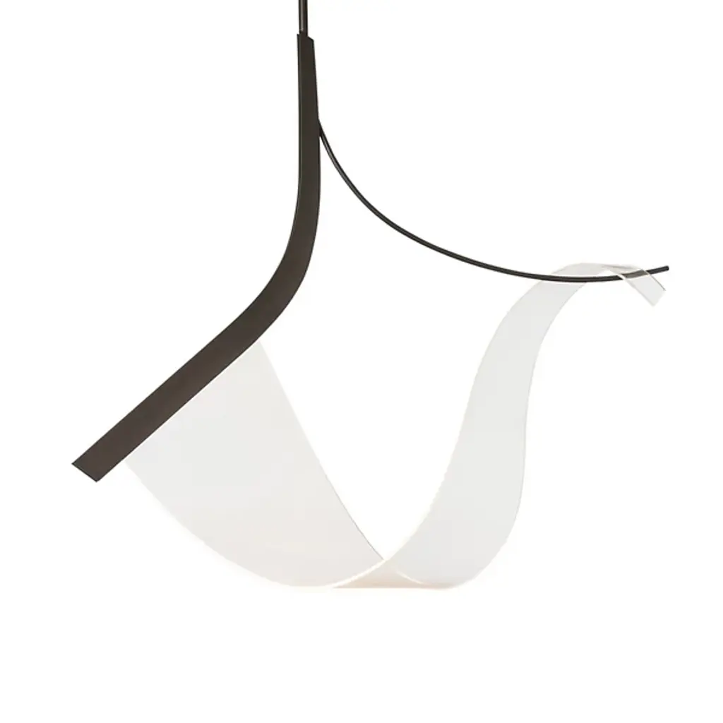 The Sling LED Pendant by Hubbardton Forge brings poetic charm to the modern home. This highly elegant fixture begins at a domed canopy that drops a slender steel arm, gently curving outward as it descends. A flowing ribbon made of clear acrylic hangs from the arm and gracefully swoops upward to rest on a secondary arm. A concealed LED light strip along the ribbon’s base sends light into the piece, creating an expressive luminaire and artful interior accent.