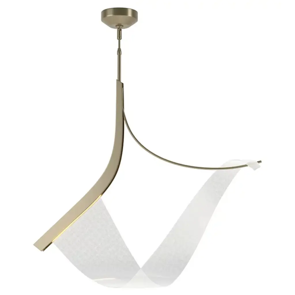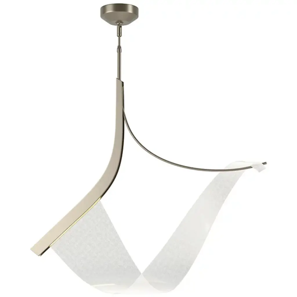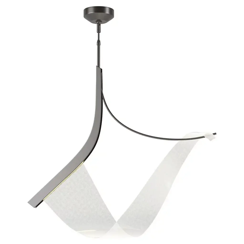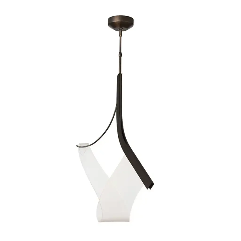 The Sling LED Pendant by Hubbardton Forge brings poetic charm to the modern home. This highly elegant fixture begins at a domed canopy that drops a slender steel arm, gently curving outward as it descends. A flowing ribbon made of clear acrylic hangs from the arm and gracefully swoops upward to rest on a secondary arm. A concealed LED light strip along the ribbon’s base sends light into the piece, creating an expressive luminaire and artful interior accent.