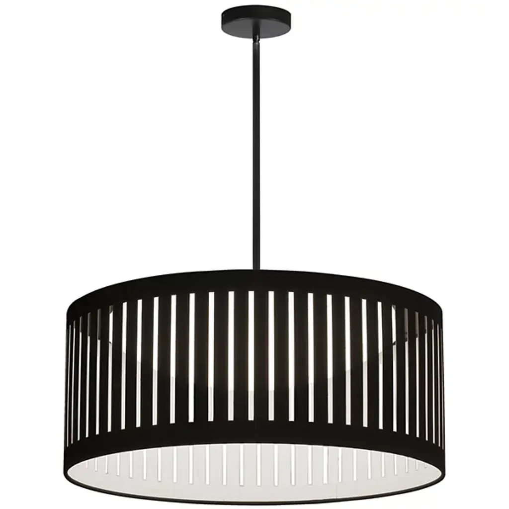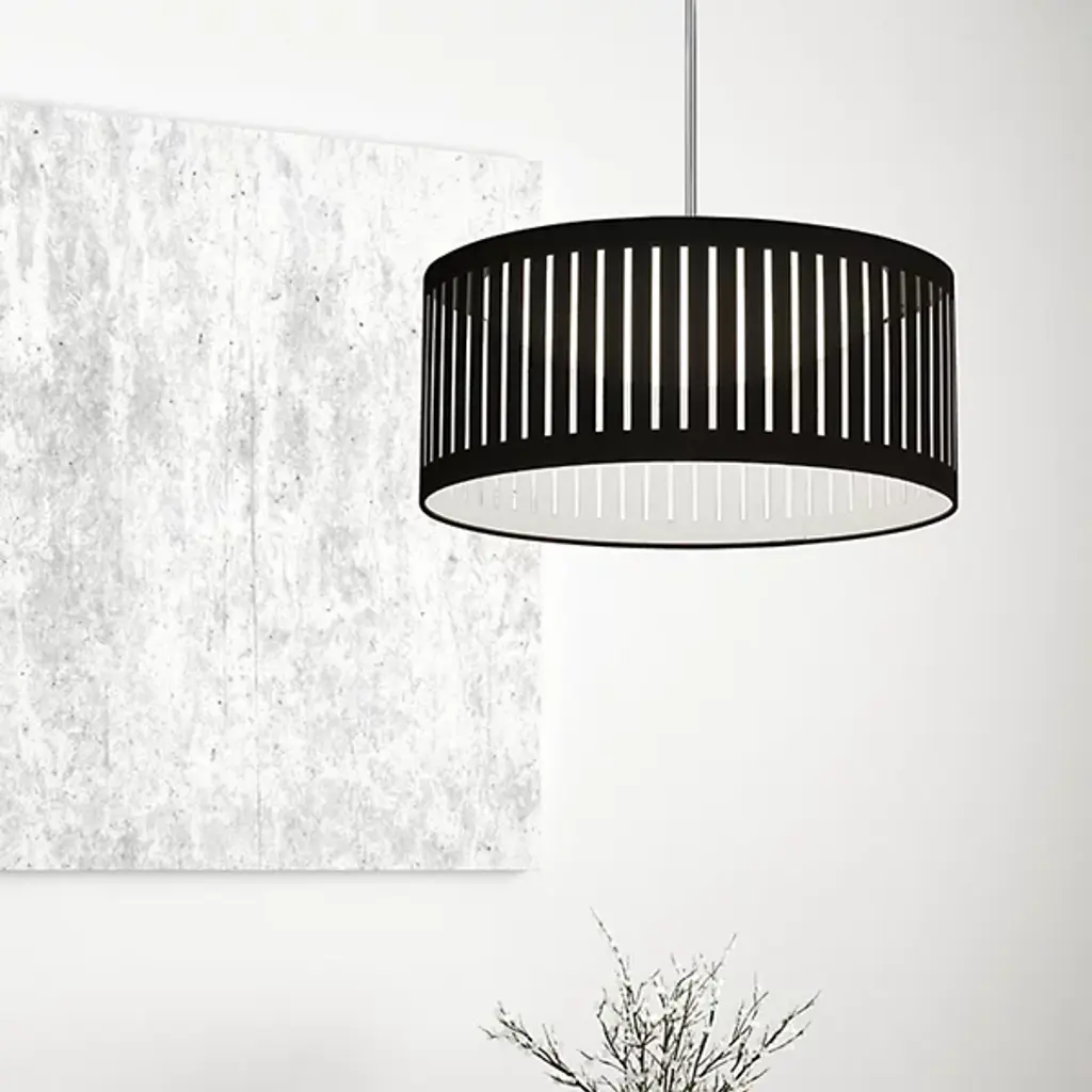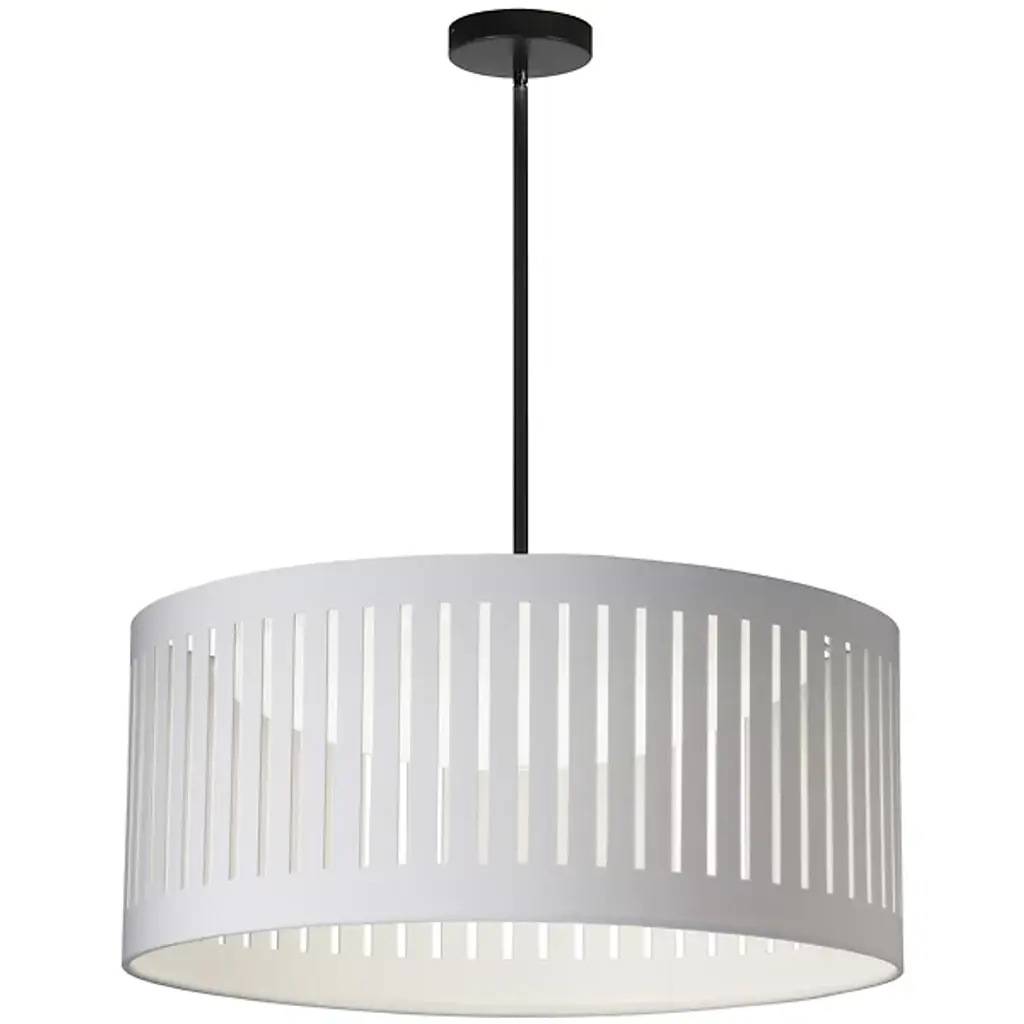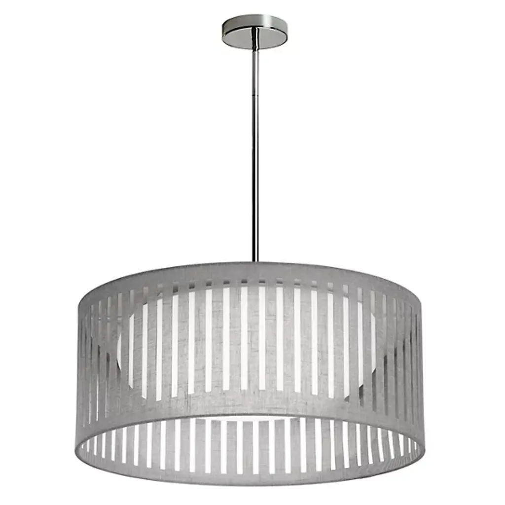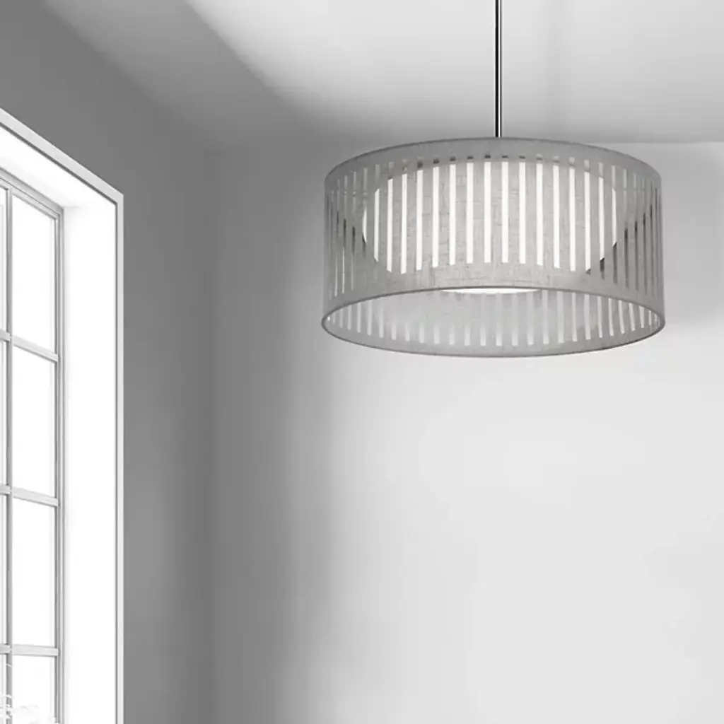 Dress up your living spaces with the elegantly lit pattern of the Slit Drum LED Pendant from Dainolite. It presents itself in your rooms with a low-profile canopy and a sleek down rod. The pop of the metal accentuates the neutral tones of the fabric drum shade. A pattern of slits wraps the drum in a composition that comes alive with different viewing angles. Light from inside paints the slits a brilliant hue, while filtering down as a generous ambient glow.