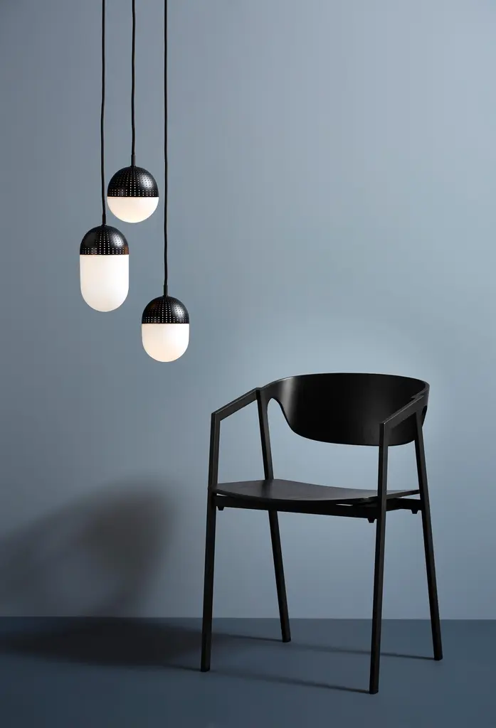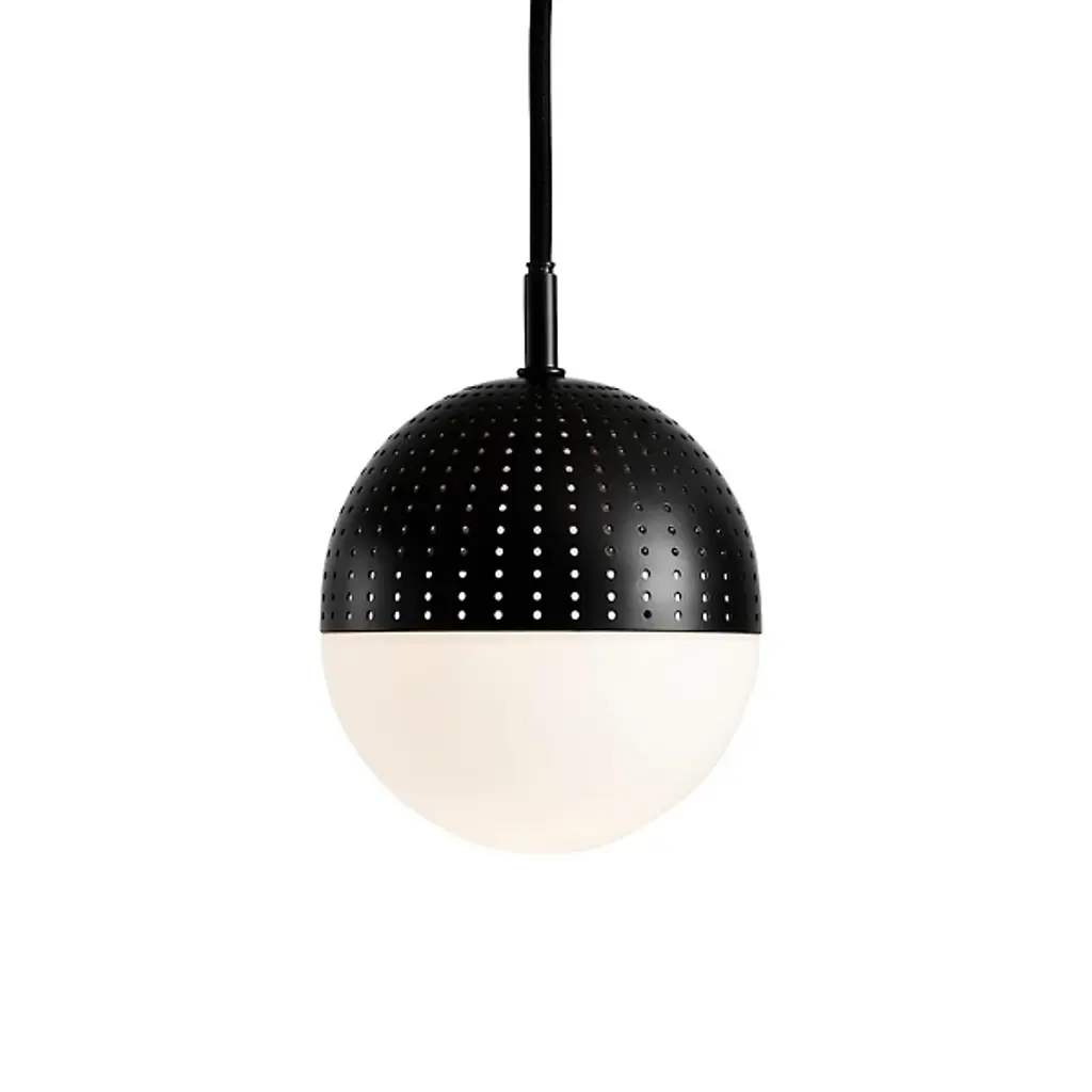 Small black dot pendant lamp by Rikke FrostMaterials: Metal, glass.Dimensions: D 14 x H 13 cmAvailable in black or satin and in 3 sizes: H 13, H 16.6, H 21 cm.Rikke Frost is a Danish graduate from the School of Architecture Aarhus. Since 2004, she has driven her own creative studio in Aarhus based on the Nordic simplicity. With particular attention to details, Rikke Frost creates designs that should be seen, felt and touched.The style of Rikke frost is recognisable and simple, focusing on colour and surprising features that give the experience of a uniform design. Through combinations of materials and exploring their properties, she adds natural applicability.The profound love for matching materials and soft lines are central for her designs Haak hook, Dot pendants and Verde mirror and table. Rikke Frost was one of the first designers who teamed up with WOUD and with a shared vision, she has been a great part of the designer collective ever since. With her range of products, she has left her mark on the WOUD collection.WOUDThe founders, Mia and Torben Koed, decided to put their 30 years of experience into a new project. It was time for a change and a new challenge. The challenge was to build an ambitious design brand from the ground up with high-quality materials and great attention to the little details. With a drive to create new originals, the WOUD collection is founded upon the idea to look ahead instead of looking back and share the love for honest design. Therefore, we are eager to discover and develop new ideas whether it being in form, function or choice of material. All our lamps can be wired according to each country. If sold to the USA it will be wired for the USA for instance.