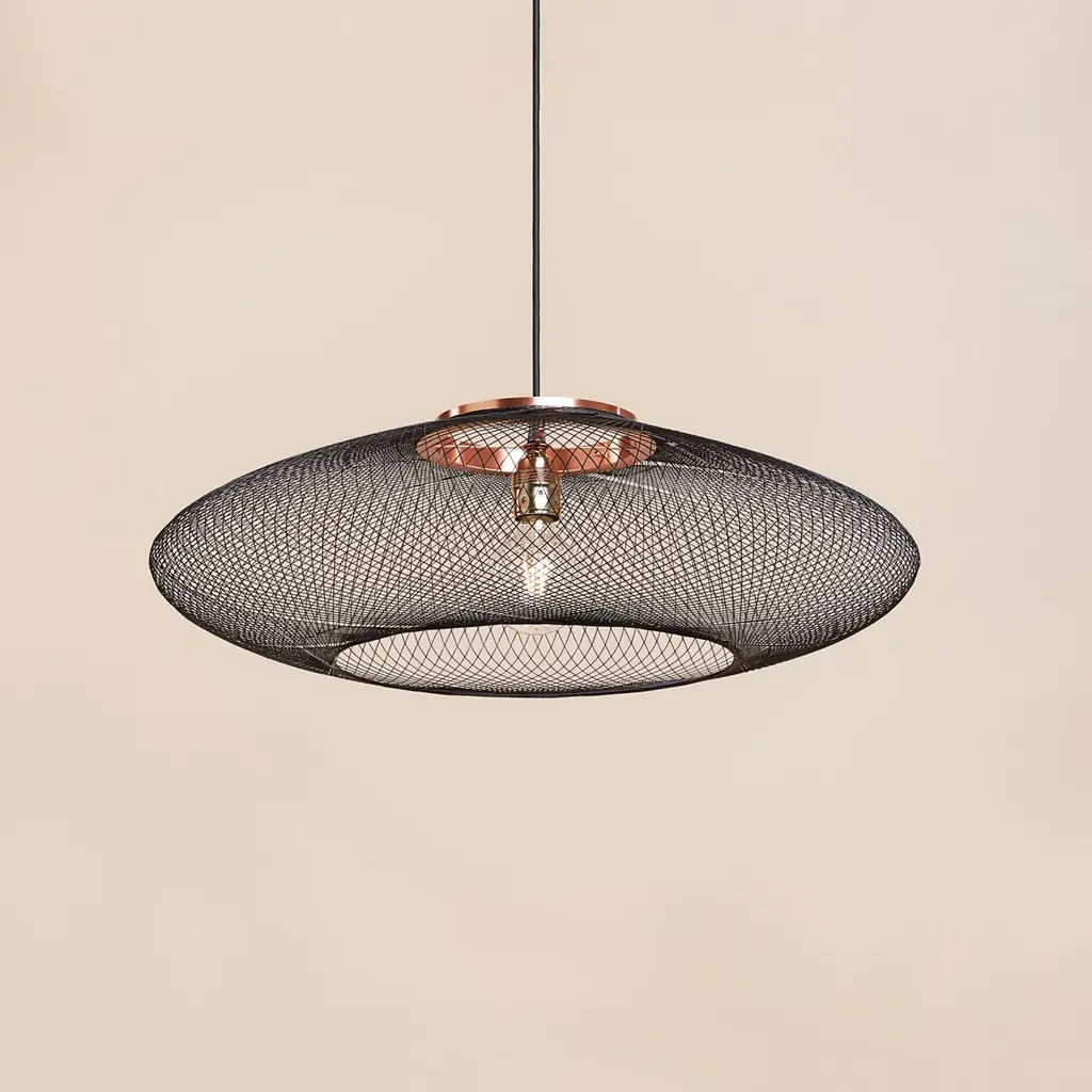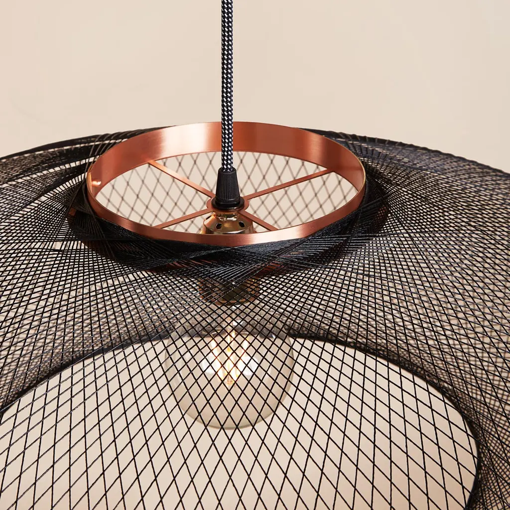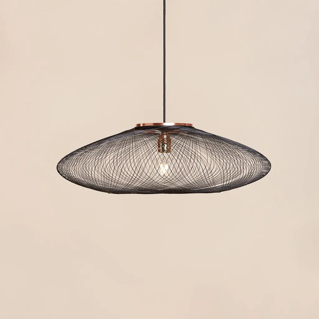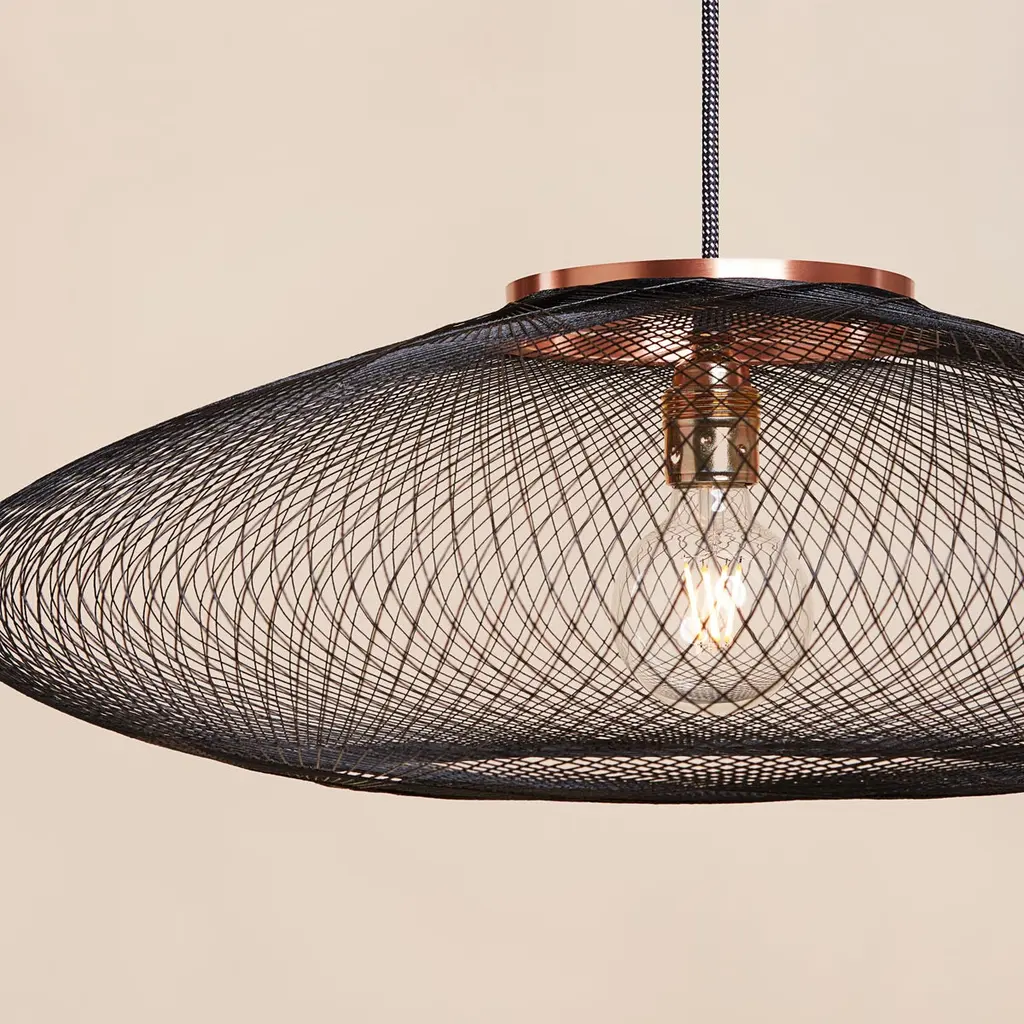 Small Black UFO pendant lamp by Atelier RobotiqDimensions: D 40 x H 12 cmMaterials: Resin-impregnated industrial fiber, copper.Available with holder in copper/ brass/ black coated stainless steel.Available in different colors, 3 sizes, and in Full pattern or Open pattern.All our lamps can be wired according to each country. If sold to the USA it will be wired for the USA for instance.For the Fiber Pattern Lamp series we experiment with robotic weaving techniques. The geometrical weave patterns are designed using mathematical models and manufactured with an industrial robot.The Fiber Pattern Lamp is made of resin-impregnated f ibers. The fibers are wound with a industrial robot around a mold in geometric patterns. The result is a mesmerizing lightweight and strong lamp.Atelier Robotiq is a Rotterdam based design company founded by Søren Blomaard andAnne-Lise Heydra.Their different backgrounds combining robotics, aerospace engineering, product design and fine arts leads to unexpected and exciting products.For their mesmerizing Fiber Pattern Lamp series they experiment using an Aerospace fiber winding technology and an industrial robot for weaving light and open fiber structures. Our Fiber Pattern Lamps are being manufactured in the mini-factory in the city center of Rotterdam.The team of Atelier Robotiq loves to experiment with new materials and truly get to know a production process, learning new things and taking time for ideas and designs to grow and mature.