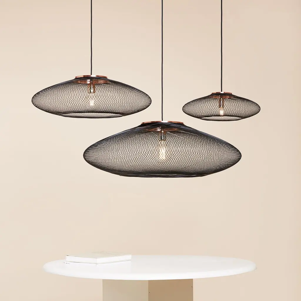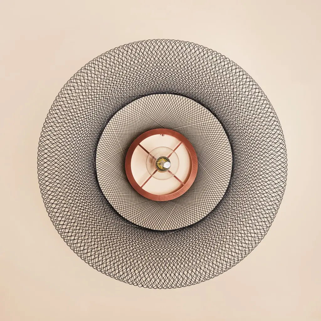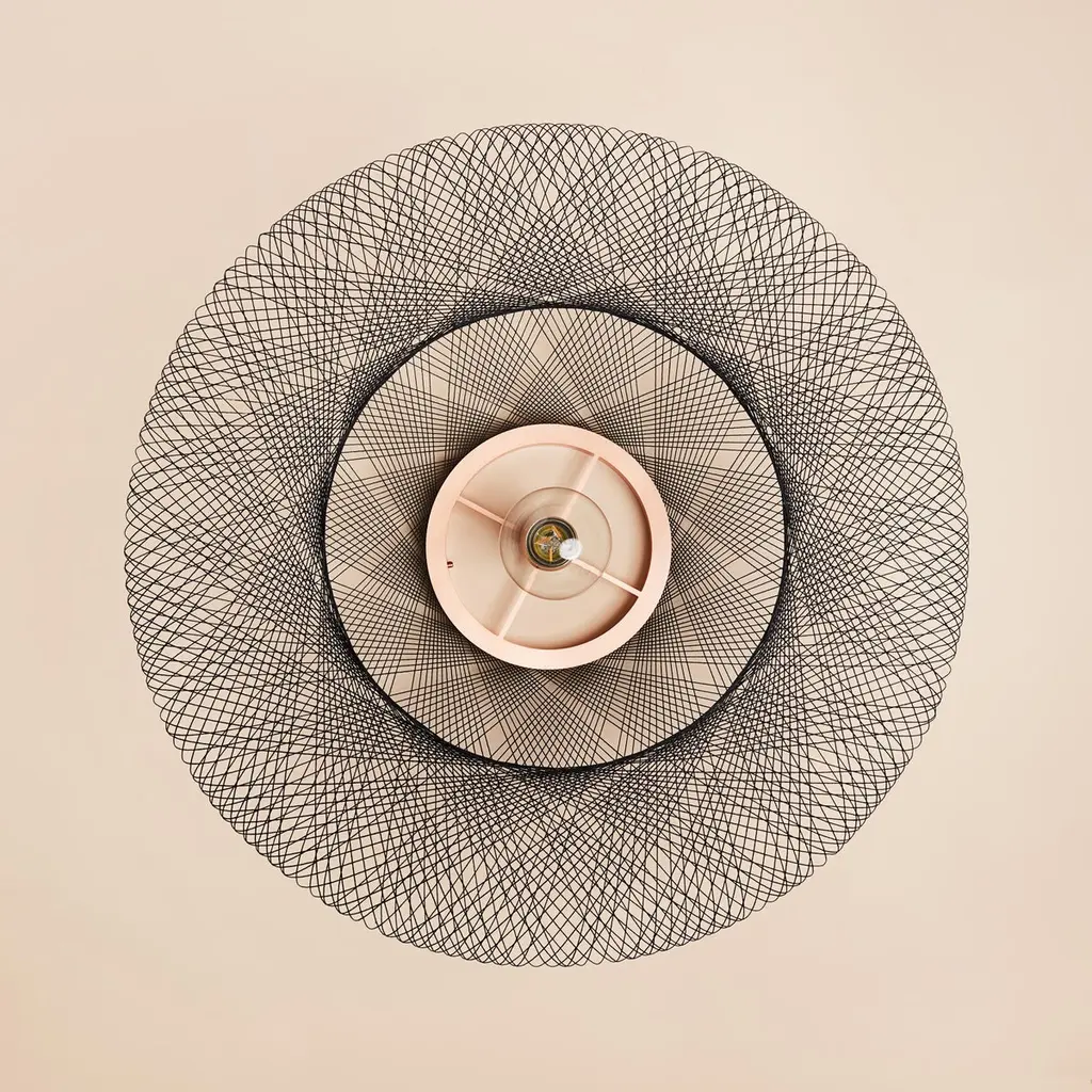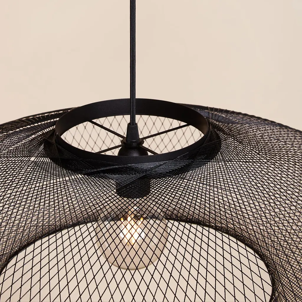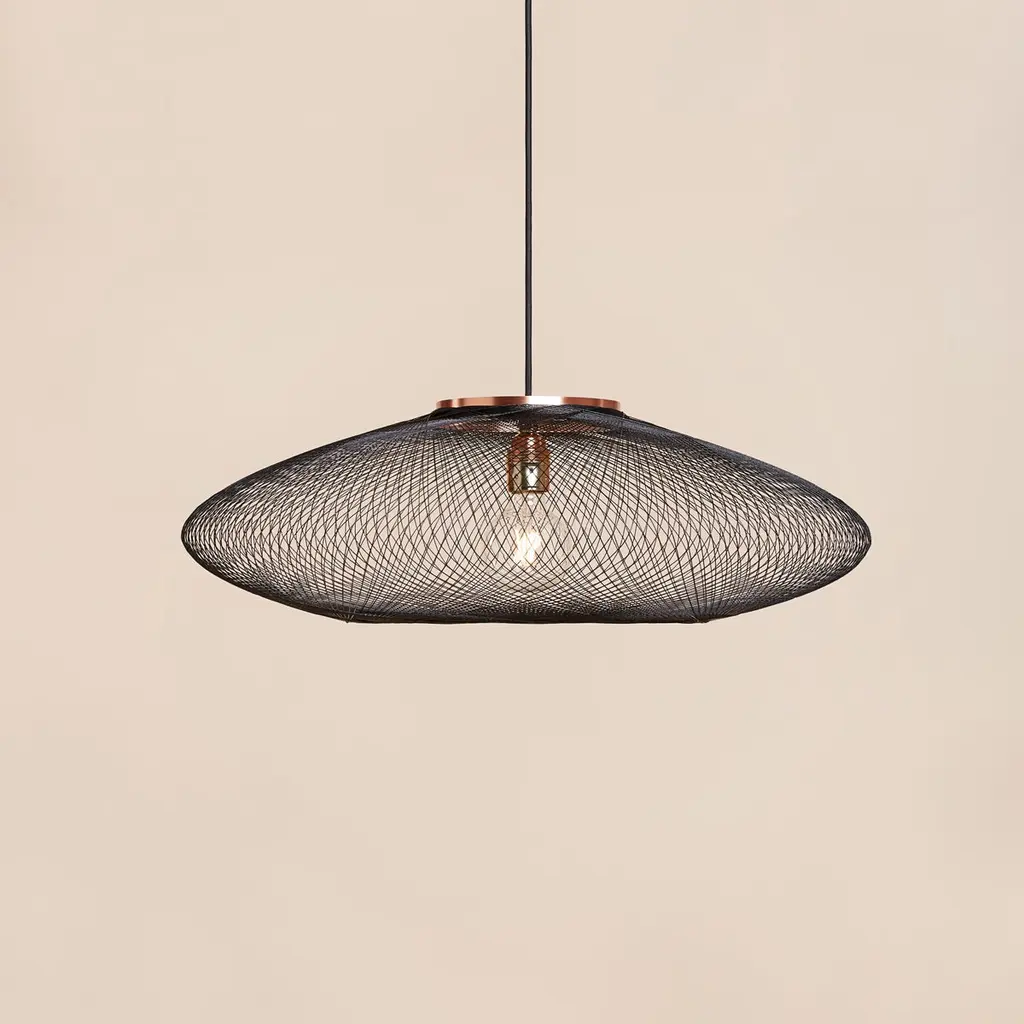 Small Black UFO pendant lamp by Atelier RobotiqDimensions: D 40 x H 12 cmMaterials: Resin-impregnated industrial fiber, copper.Available with holder in copper/ brass/ black coated stainless steel.Available in different colors, 3 sizes, and in Full pattern or Open pattern.All our lamps can be wired according to each country. If sold to the USA it will be wired for the USA for instance.For the Fiber Pattern Lamp series we experiment with robotic weaving techniques. The geometrical weave patterns are designed using mathematical models and manufactured with an industrial robot.The Fiber Pattern Lamp is made of resin-impregnated f ibers. The fibers are wound with a industrial robot around a mold in geometric patterns. The result is a mesmerizing lightweight and strong lamp.Atelier Robotiq is a Rotterdam based design company founded by Søren Blomaard andAnne-Lise Heydra.Their different backgrounds combining robotics, aerospace engineering, product design and fine arts leads to unexpected and exciting products.For their mesmerizing Fiber Pattern Lamp series they experiment using an Aerospace fiber winding technology and an industrial robot for weaving light and open fiber structures. Our Fiber Pattern Lamps are being manufactured in the mini-factory in the city center of Rotterdam.The team of Atelier Robotiq loves to experiment with new materials and truly get to know a production process, learning new things and taking time for ideas and designs to grow and mature.