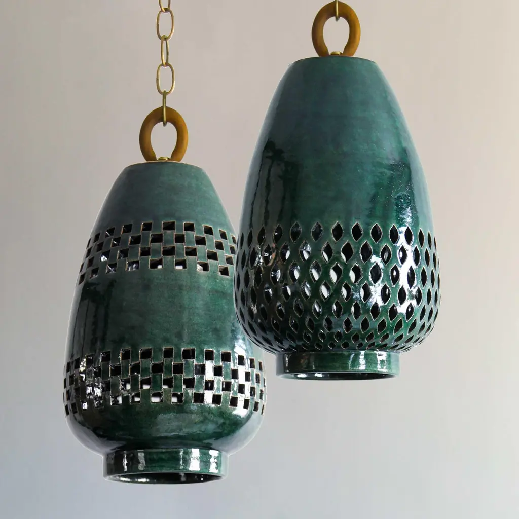 Our Atzompa collection is created in the Oaxacan town of Santa María Atzompa, where the pottery-making tradition has roots tracing back to ancient Zapotec culture.Building on this tradition, we formed a partnership with master artisan Eligio Zarate, whose family has for generations worked to bring innovation to this centuries-old craft.Using a red clay that comes from local mountains, the pieces in this collection are first given form within custom gesso molds. Emerging from the molds, the repeating openwork designs-which play on motifs that are carved in to the stone at Mitla, the neighboring archeological ruins-are meticulously cutout one by one. Each piece is brushed with a white wash, or dipped in an emerald-hued glaze, and then finished in a kiln firing.DIMENSIONS9.5” Ø x 14” h24 cm Ø x 35.5 cm hLAMPINGSingle SocketBulbrite, G25, E26 LED (bulb included)8.5W 60W Equivalent800 Lumens3000K CRI 90+Fully compatible dimmingCERTIFICATIONSUL, cUL listed (120V) 240V available upon requestMOUNTINGUniversal ceiling mount; hardwiredSUSPENSION3 ft link chain (standard)METAL FINISHBrushed Brass