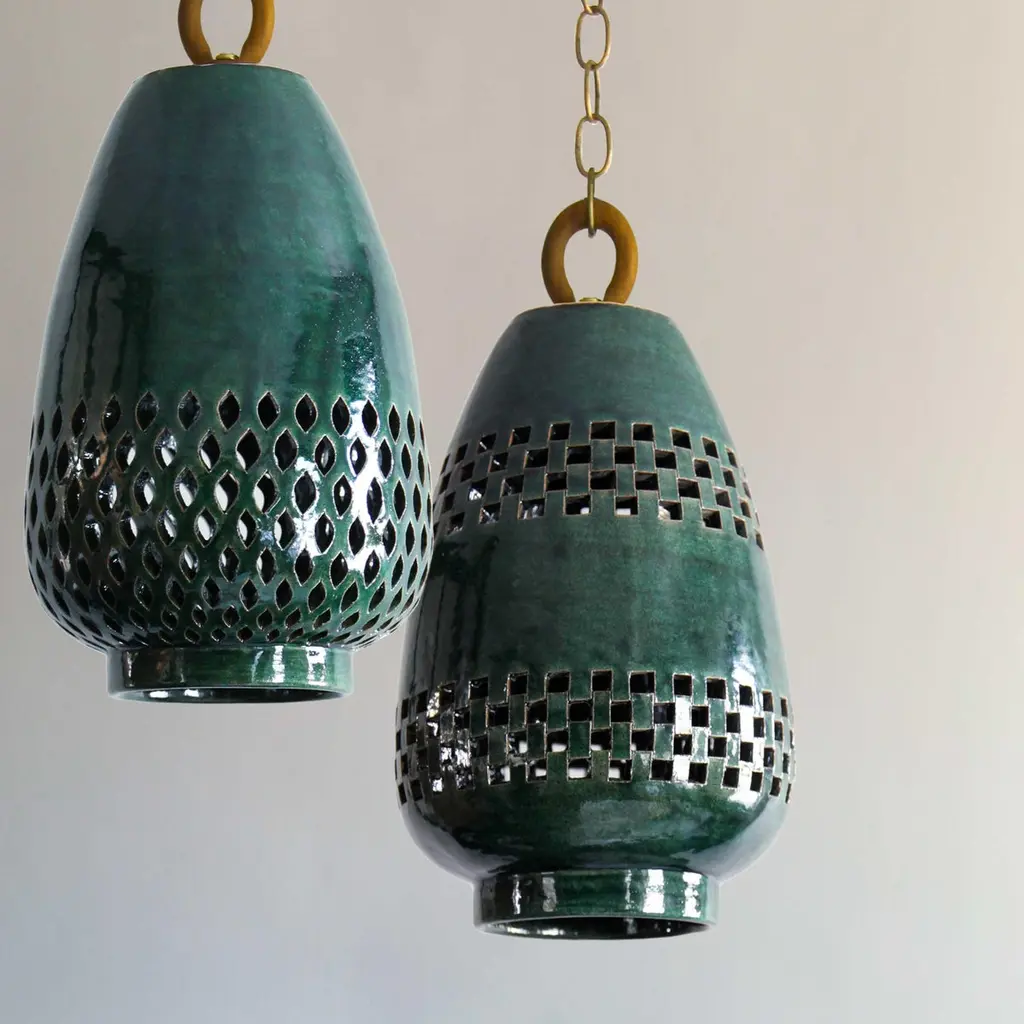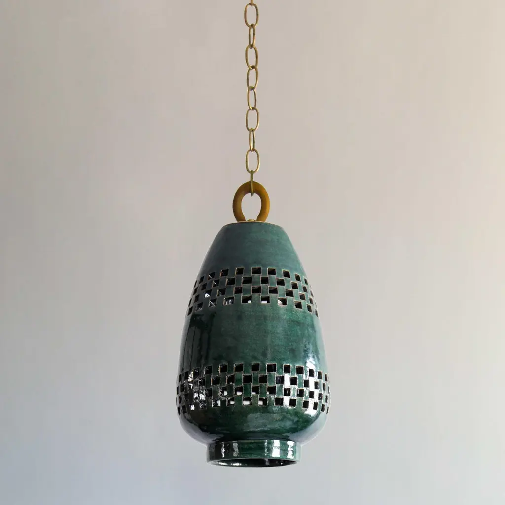 Our Atzompa collection is created in the Oaxacan town of Santa María Atzompa, where the pottery-making tradition has roots tracing back to ancient Zapotec culture.Building on this tradition, we formed a partnership with master artisan Eligio Zarate, whose family has for generations worked to bring innovation to this centuries-old craft.Using a red clay that comes from local mountains, the pieces in this collection are first given form within custom gesso molds. Emerging from the molds, the repeating openwork designs-which play on motifs that are carved in to the stone at Mitla, the neighboring archeological ruins-are meticulously cutout one by one. Each piece is brushed with a white wash, or dipped in an emerald-hued glaze, and then finished in a kiln firing.DIMENSIONS9.5” Ø x 14” h24 cm Ø x 35.5 cm hLAMPINGSingle SocketBulbrite, G25, E26 LED (bulb included)8.5W 60W Equivalent800 Lumens3000K CRI 90+Fully compatible dimmingCERTIFICATIONSUL, cUL listed (120V) 240V available upon requestMOUNTINGUniversal ceiling mount; hardwiredSUSPENSION3 ft link chain (standard)METAL FINISHNatural Brass