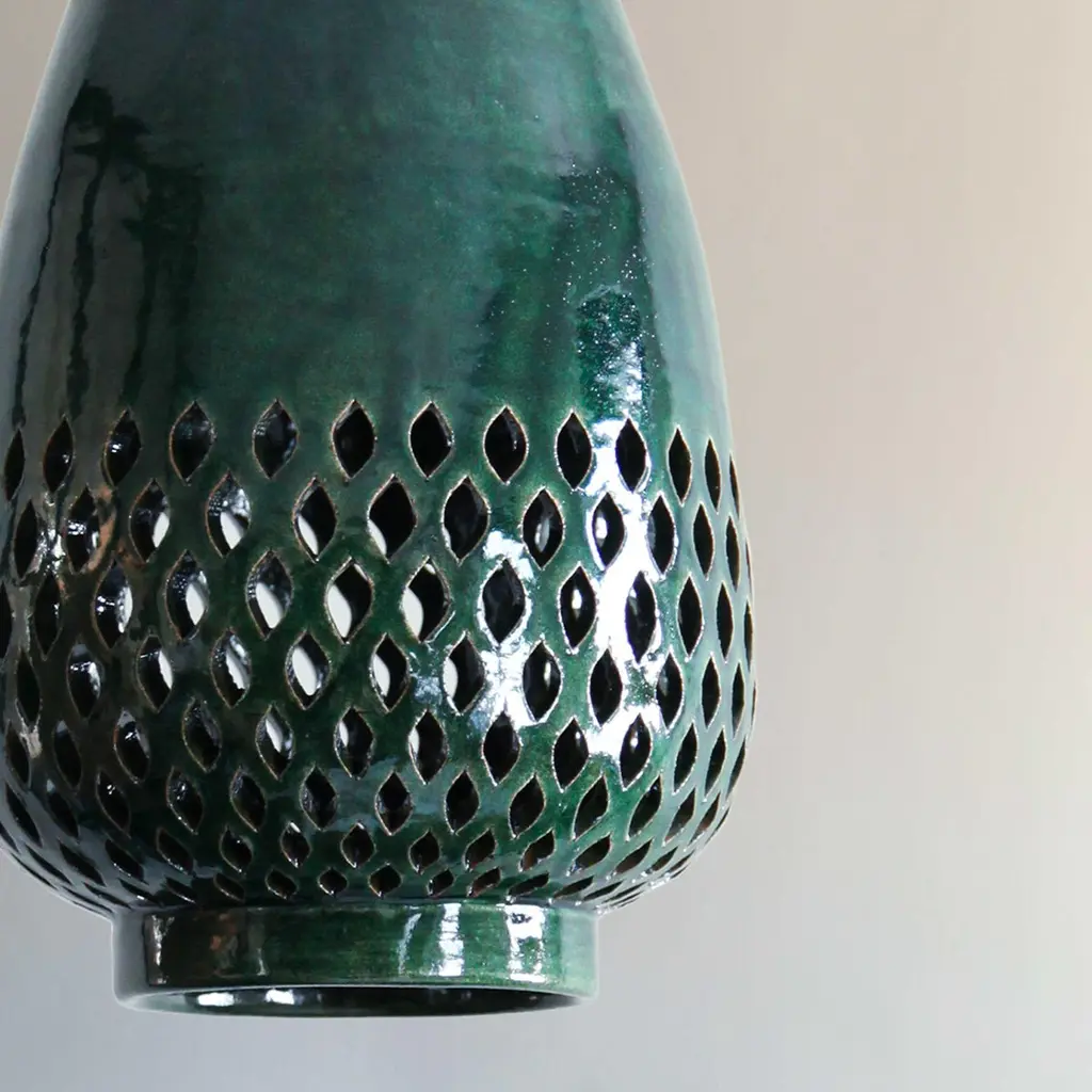 Our Atzompa collection is created in the Oaxacan town of Santa María Atzompa, where the pottery-making tradition has roots tracing back to ancient Zapotec culture.Building on this tradition, we formed a partnership with master artisan Eligio Zarate, whose family has for generations worked to bring innovation to this centuries-old craft.Using a red clay that comes from local mountains, the pieces in this collection are first given form within custom gesso molds. Emerging from the molds, the repeating openwork designs-which play on motifs that are carved in to the stone at Mitla, the neighboring archeological ruins-are meticulously cutout one by one. Each piece is brushed with a white wash, or dipped in an emerald-hued glaze, and then finished in a kiln firing.DIMENSIONS9.5” Ø x 14” h24 cm Ø x 35.5 cm hLAMPINGSingle SocketBulbrite, G25, E26 LED (bulb included)8.5W 60W Equivalent800 Lumens3000K CRI 90+Fully compatible dimmingCERTIFICATIONSUL, cUL listed (120V) 240V available upon requestMOUNTINGUniversal ceiling mount; hardwiredSUSPENSION3 ft link chain (standard)METAL FINISHNatural Brass.